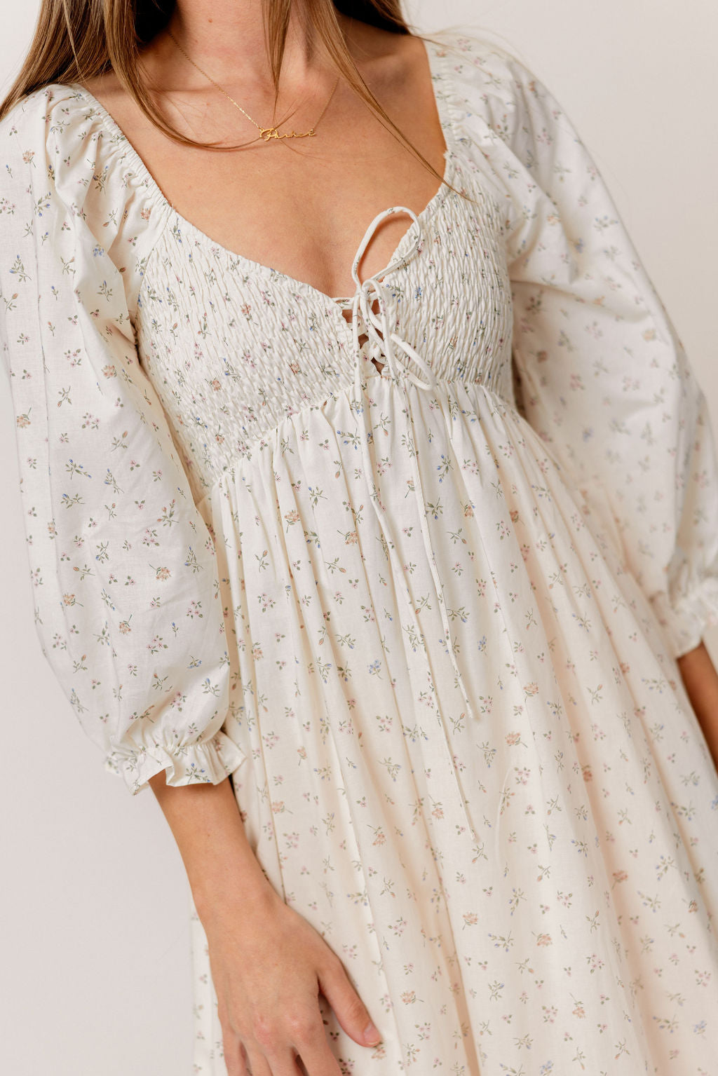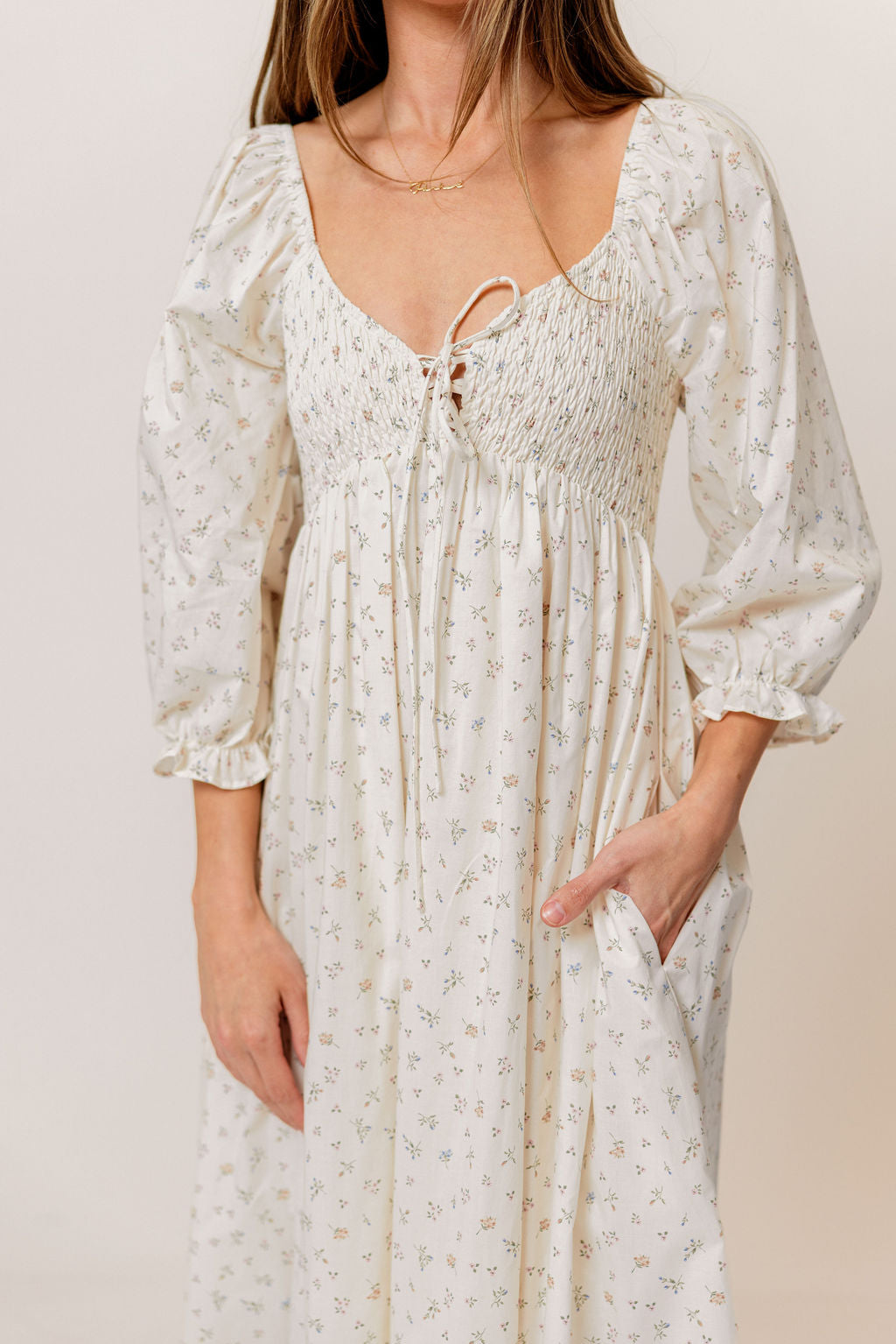 GARMENT DETAILS: Lightweight cotton maxi dress in a charming floral print, with a sweetheart neckline, 3/4 length sleeves, and an adjustable front tie detail. Features a smocked bodice, side pockets, and ruffle accents. This colorway has a full lining.