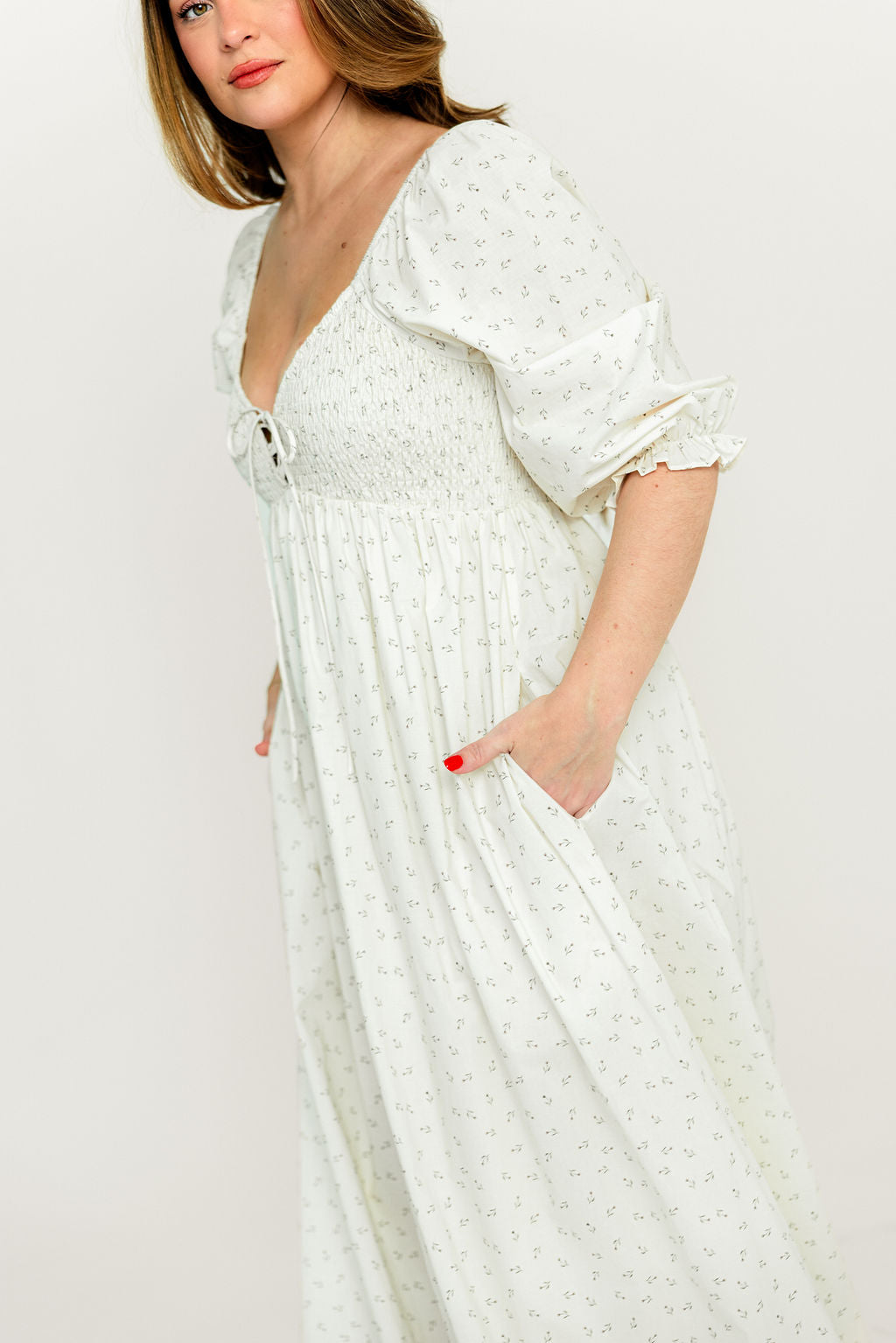 GARMENT DETAILS: Lightweight cotton maxi dress in a charming floral print, with a sweetheart neckline, 3/4 length sleeves, and an adjustable front tie detail. Features a smocked bodice, side pockets, and ruffle accents. This colorway has a full lining.