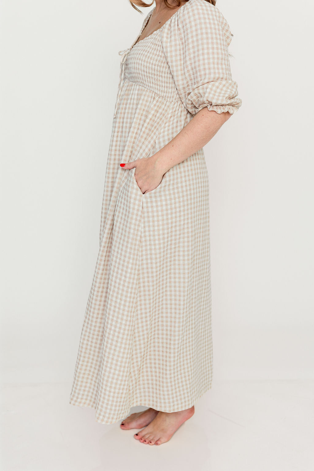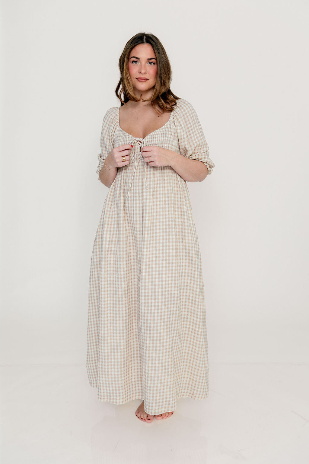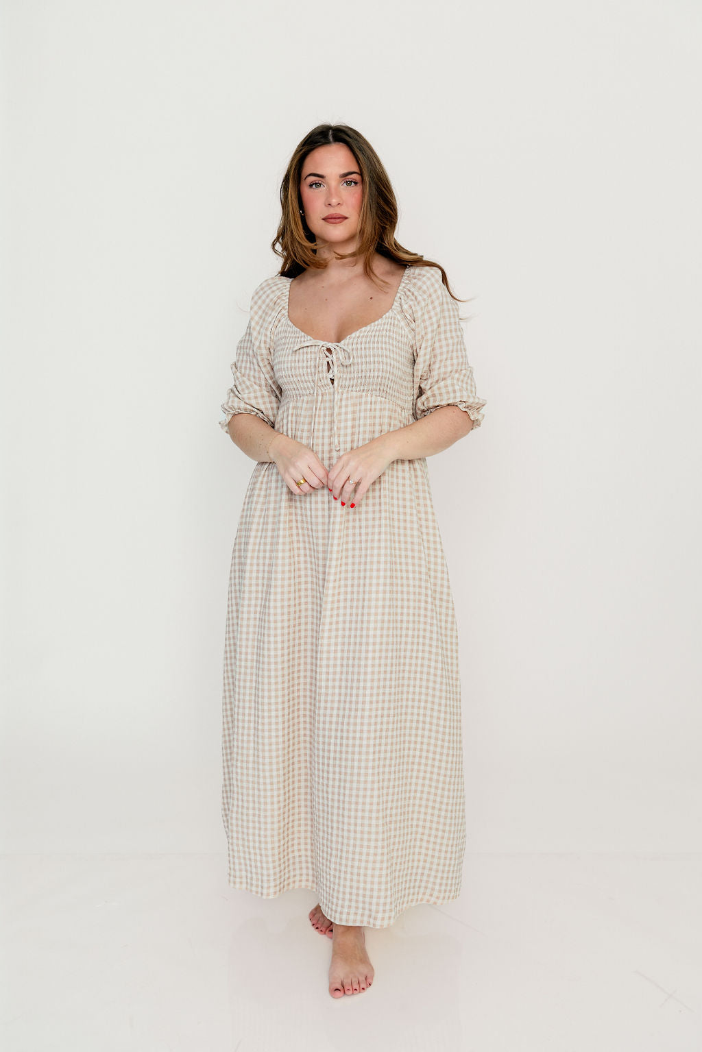 GARMENT DETAILS: Lightweight cotton maxi dress in a charming plaid print, with a sweetheart neckline, 3/4 length sleeves, and an adjustable front tie detail. Features a smocked bodice, side pockets, and ruffle accents. This colorway has a full lining.
