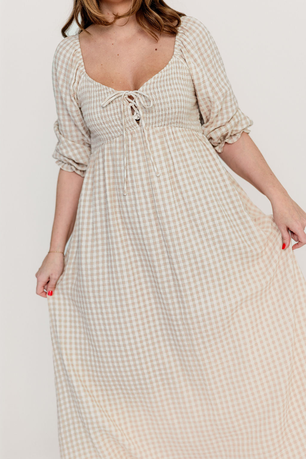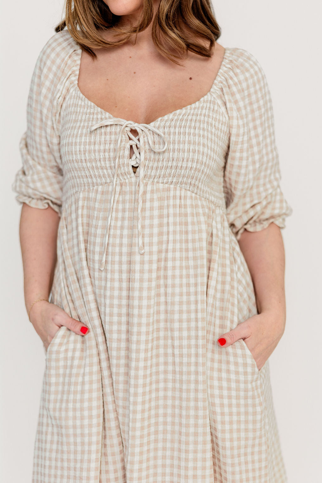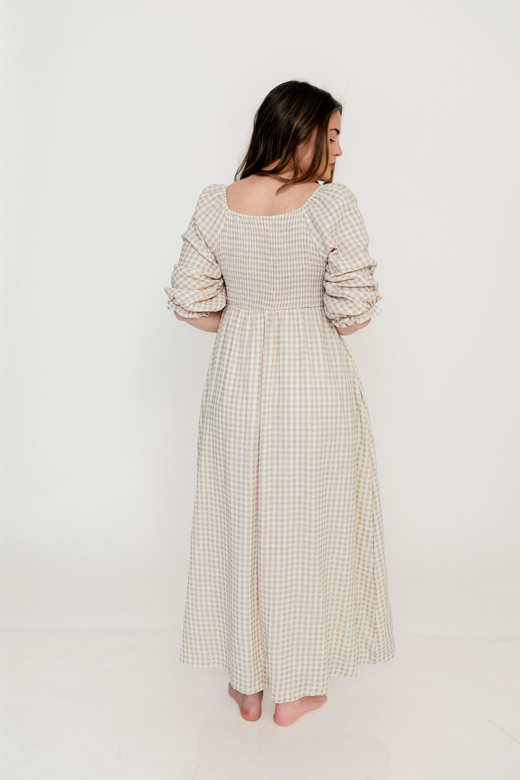 GARMENT DETAILS: Lightweight cotton maxi dress in a charming plaid print, with a sweetheart neckline, 3/4 length sleeves, and an adjustable front tie detail. Features a smocked bodice, side pockets, and ruffle accents. This colorway has a full lining.
