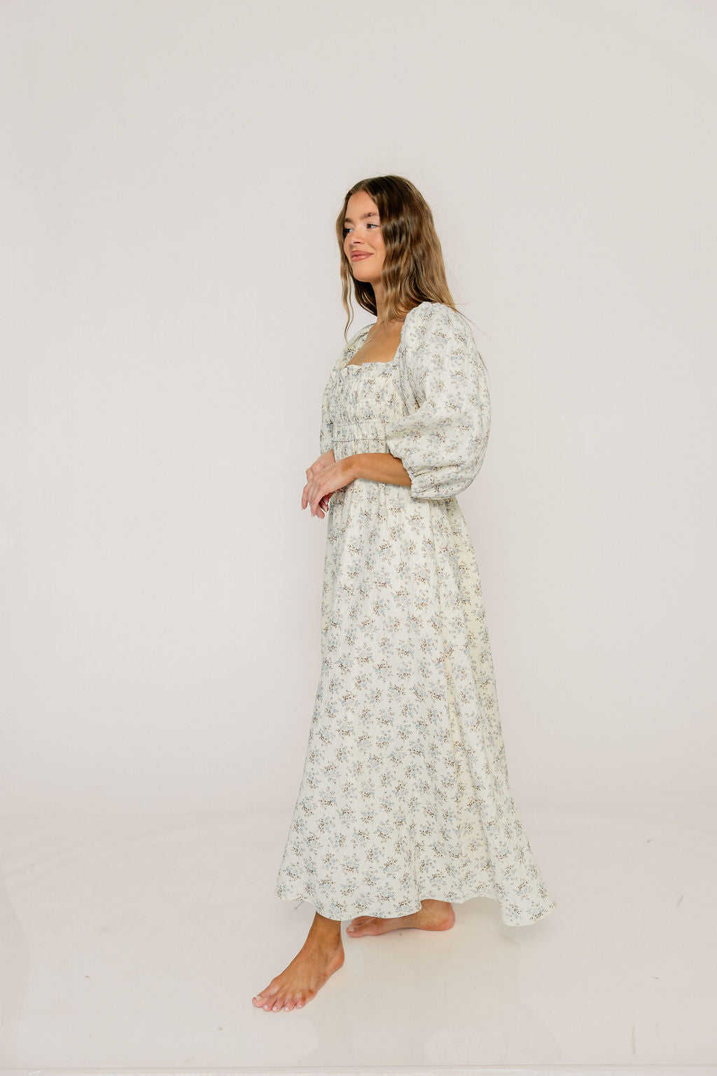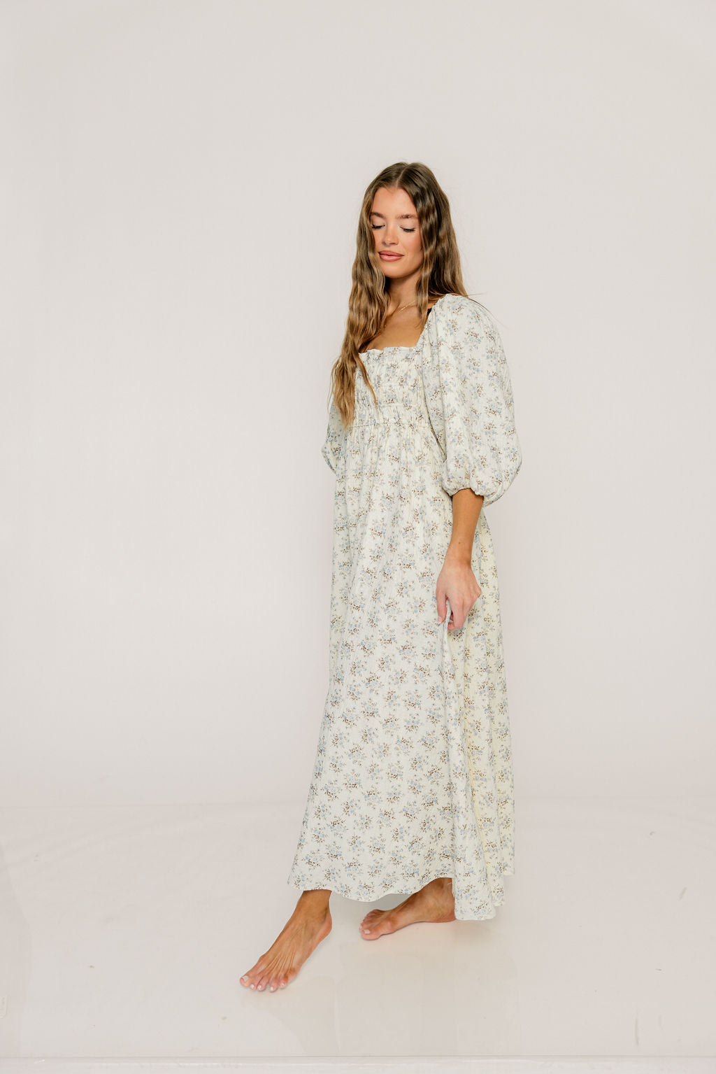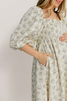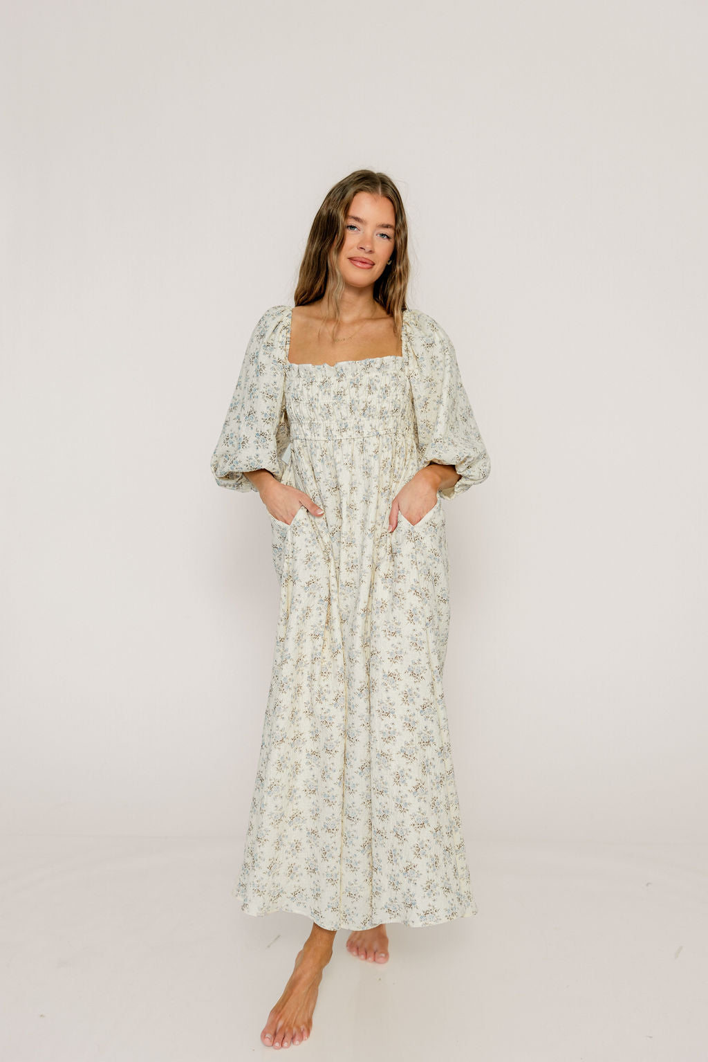 GARMENT DETAILS: Elegant cotton maxi dress in a charming floral print, with square neckline, statement puffed sleeves, and a fully smocked bodice. Features ruffled details and dual side pockets.