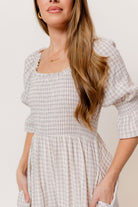 GARMENT DETAILS: Elegant, lightweight maxi dress in a darling gingham plaid print, with stretchy neckline that can be worn on or off the shoulder. Features 3/4 length puffed sleeves with ruffle, and a stretchy, smocked bodice. This colorway features a full lining.