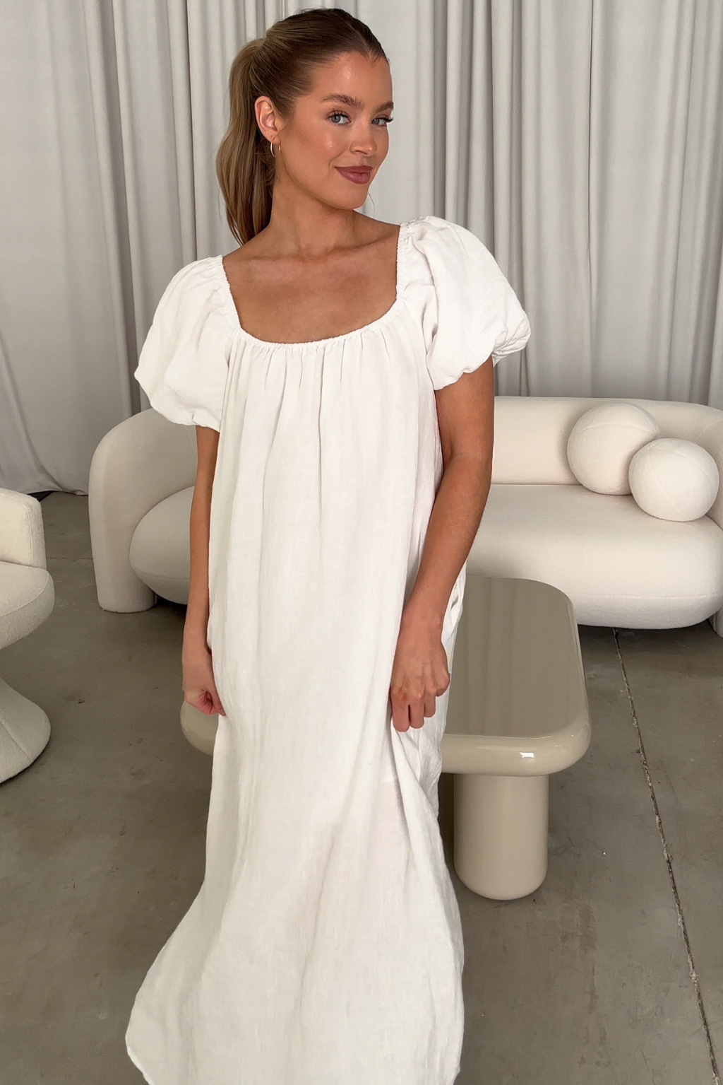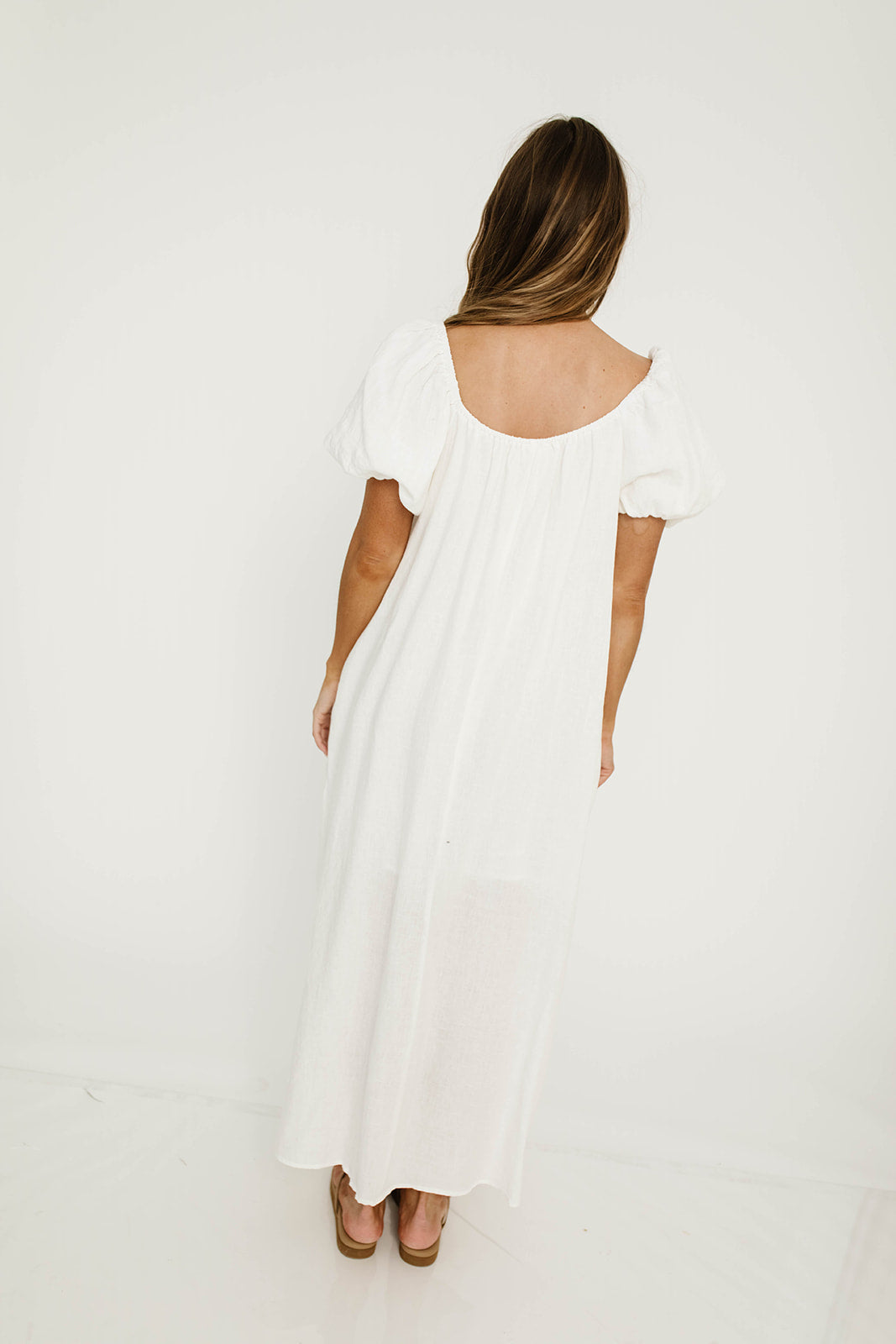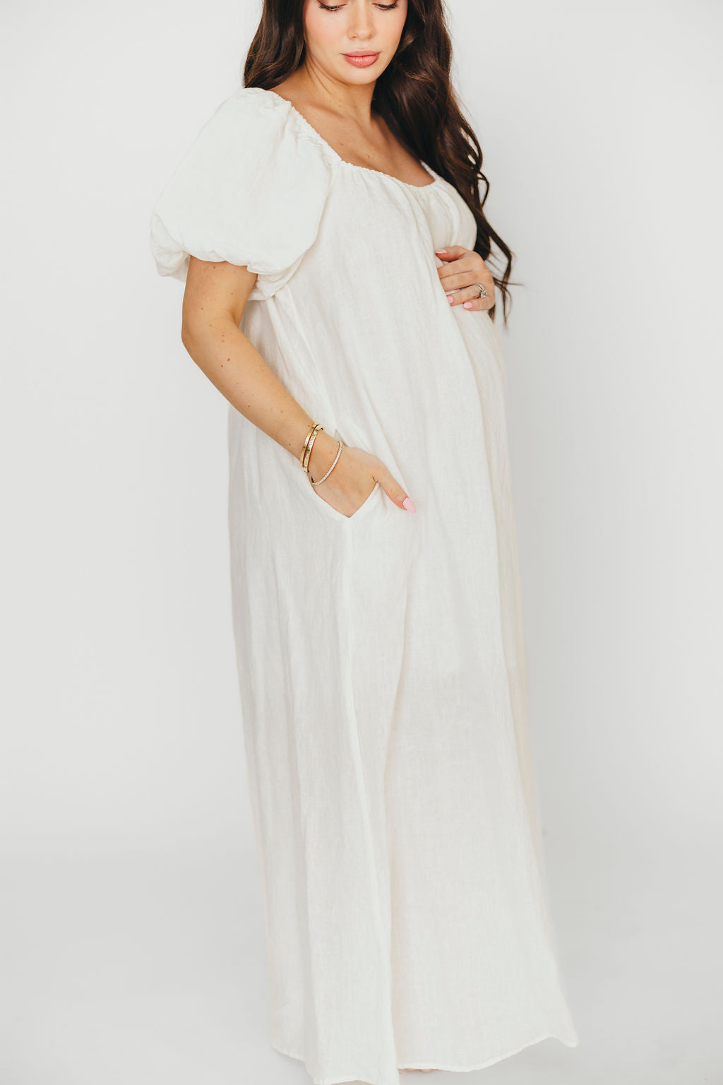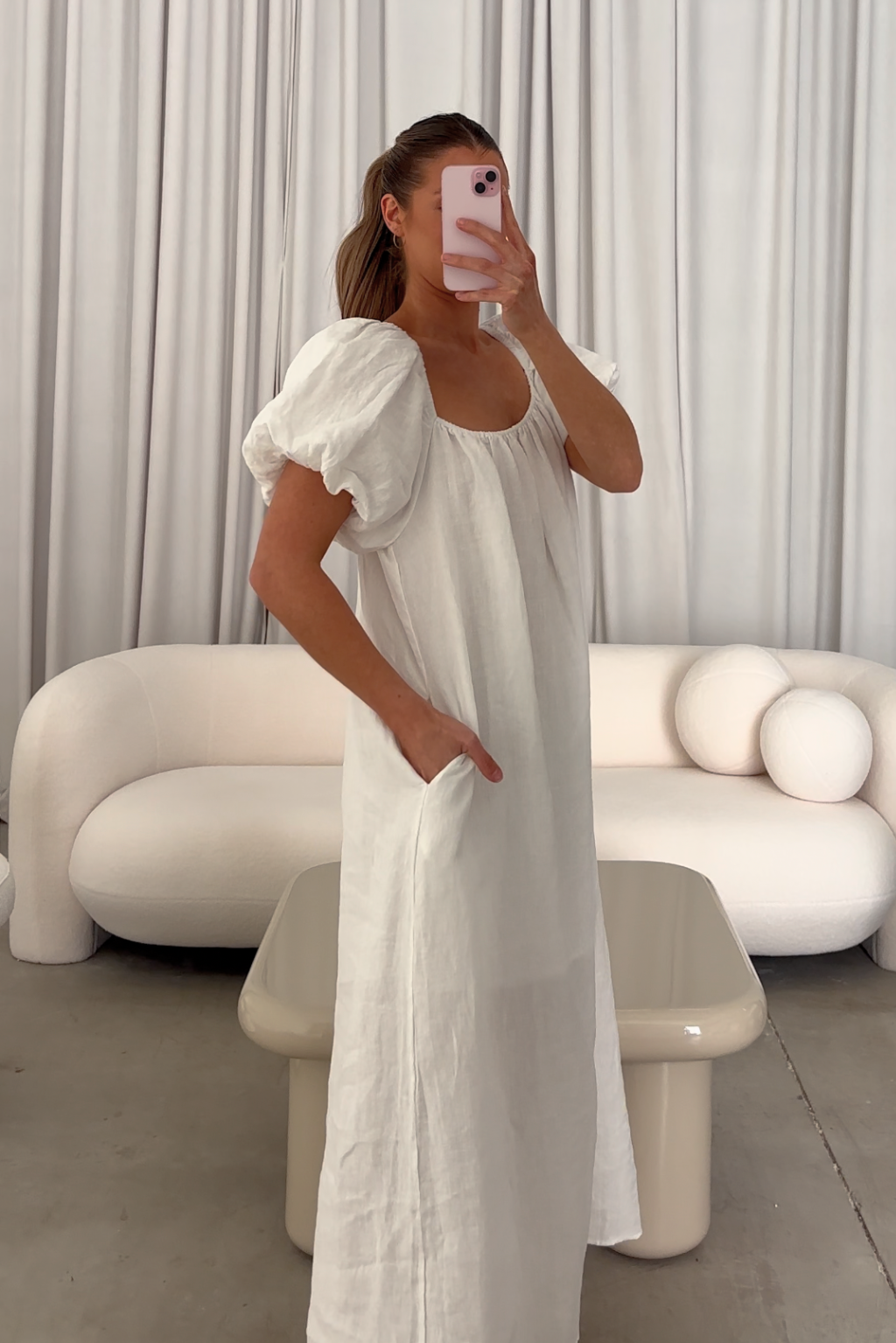 GARMENT DETAILS: 100% linen maxi dress with an elasticized neckline and short puffed sleeves that can be worn on or off the shoulder. Features a comfortable, relaxed fit, in-seam side pockets, and lining.