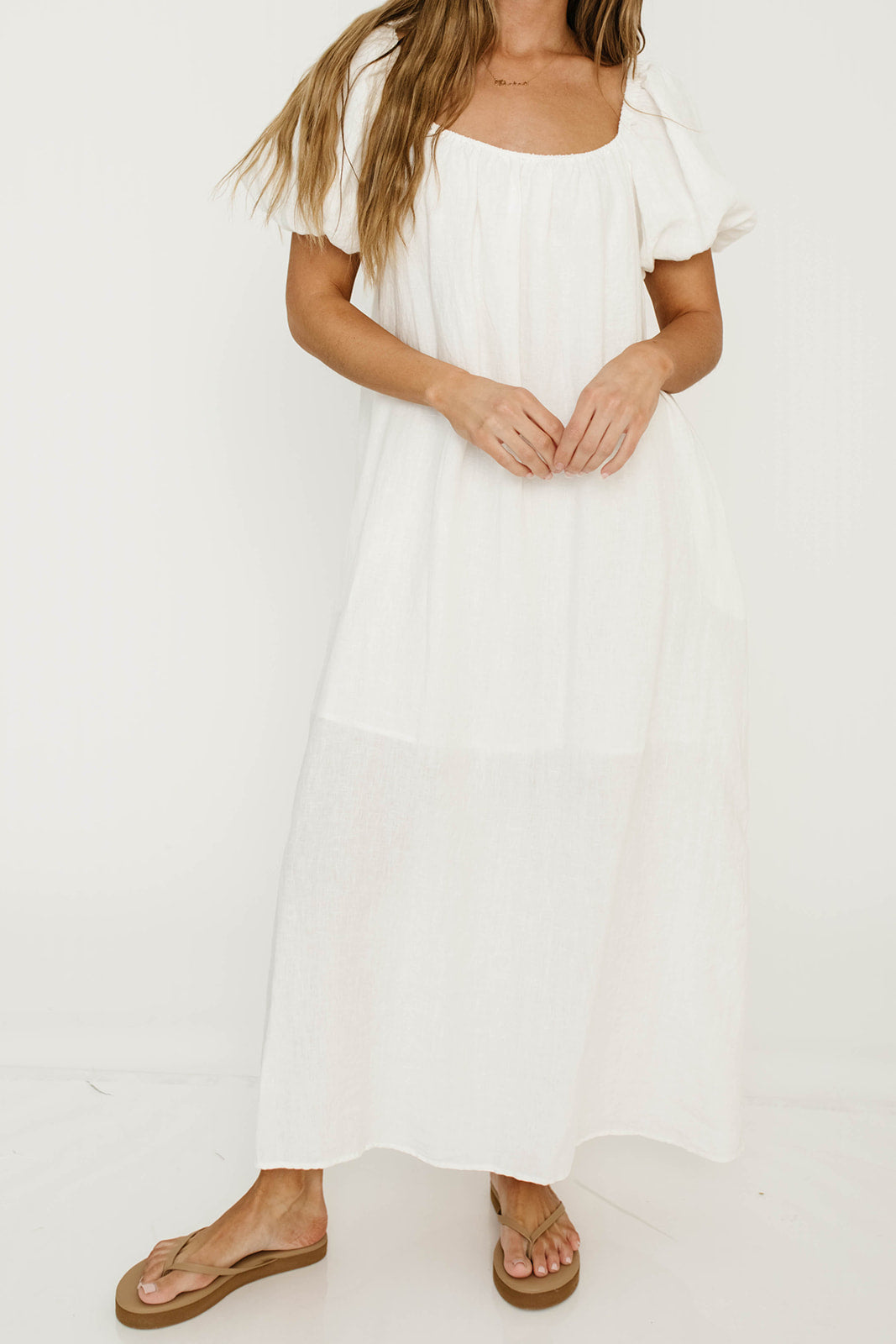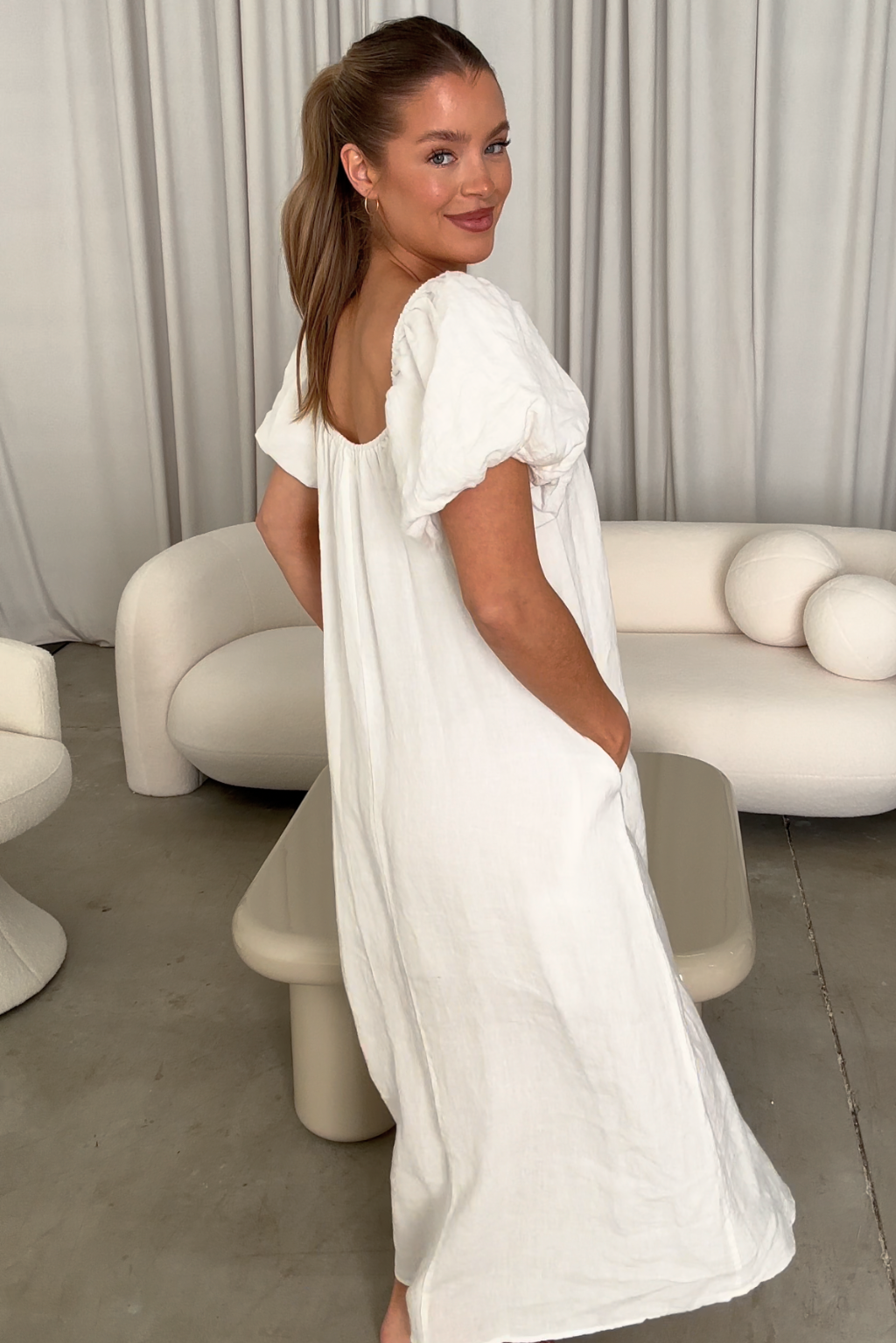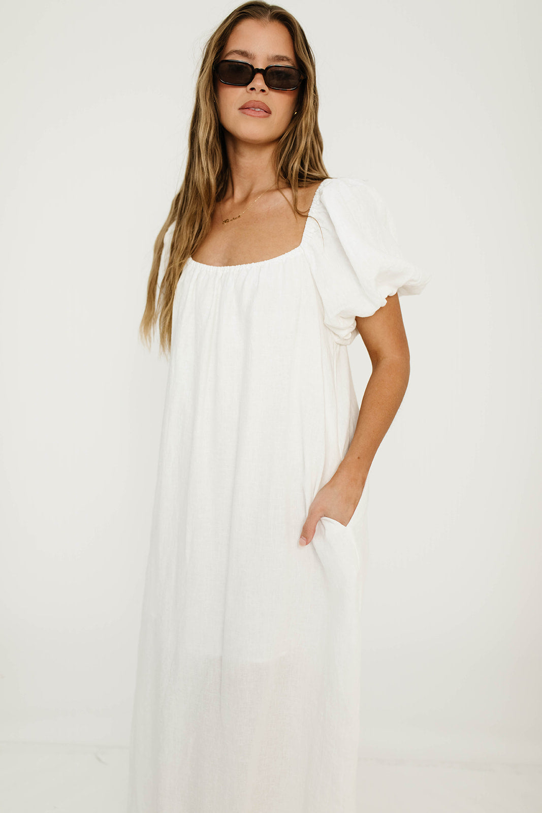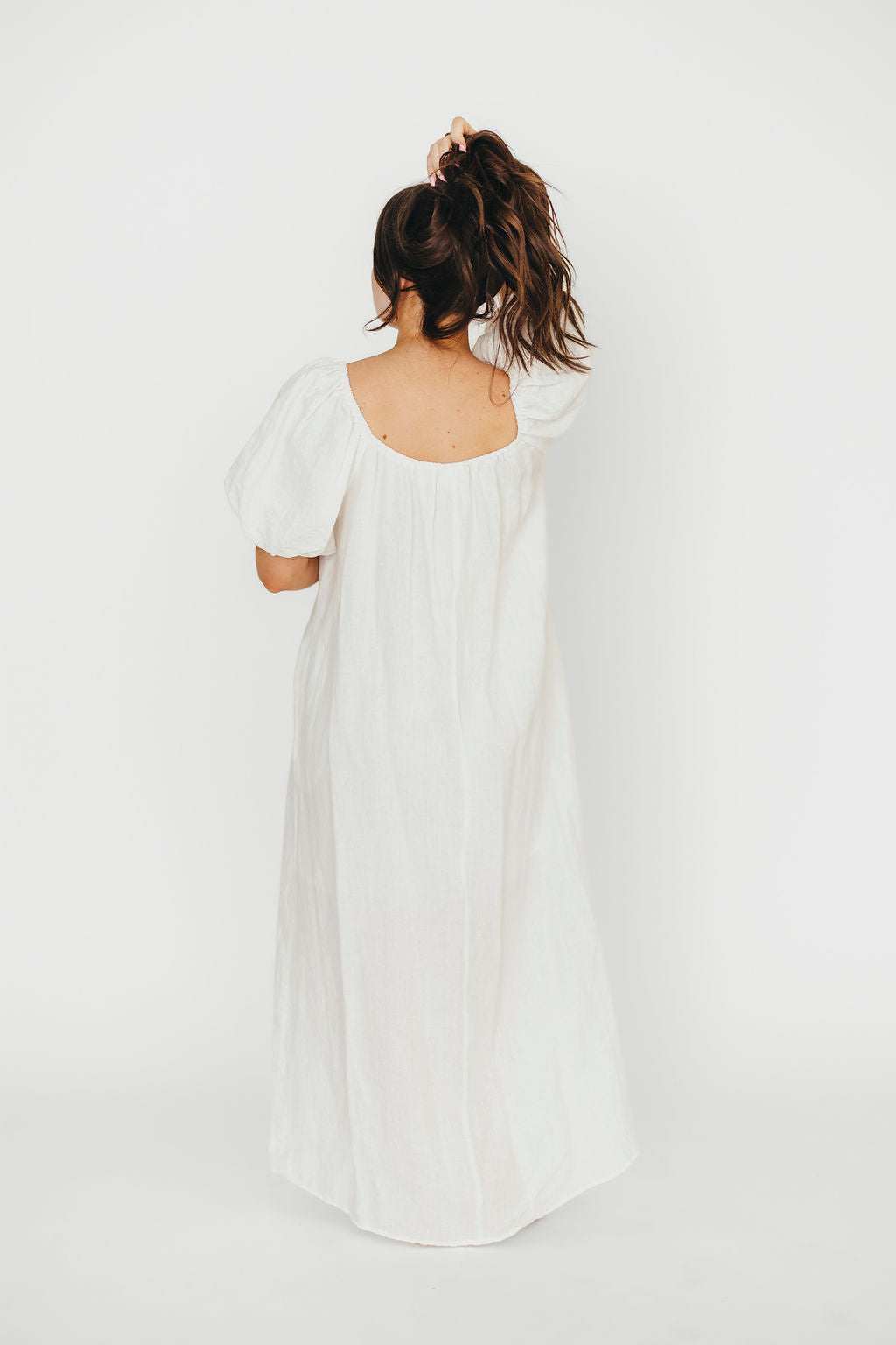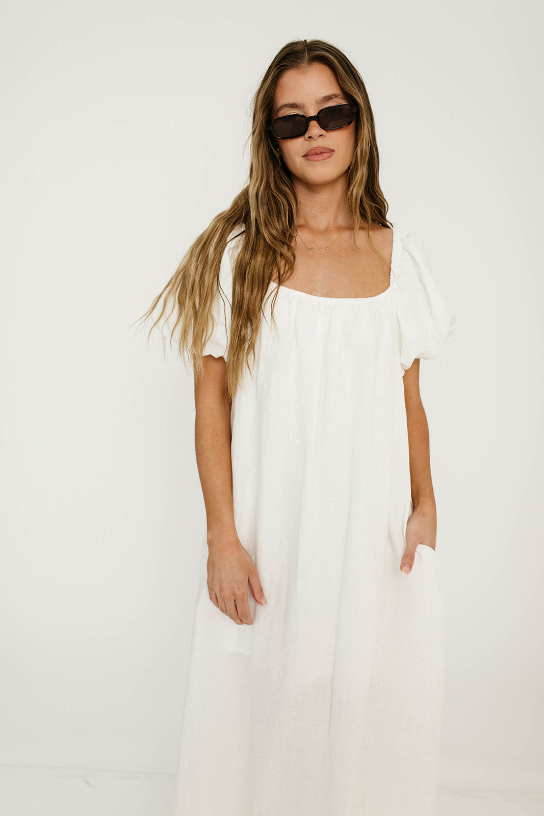 GARMENT DETAILS: 100% linen maxi dress with an elasticized neckline and short puffed sleeves that can be worn on or off the shoulder. Features a comfortable, relaxed fit, in-seam side pockets, and lining.