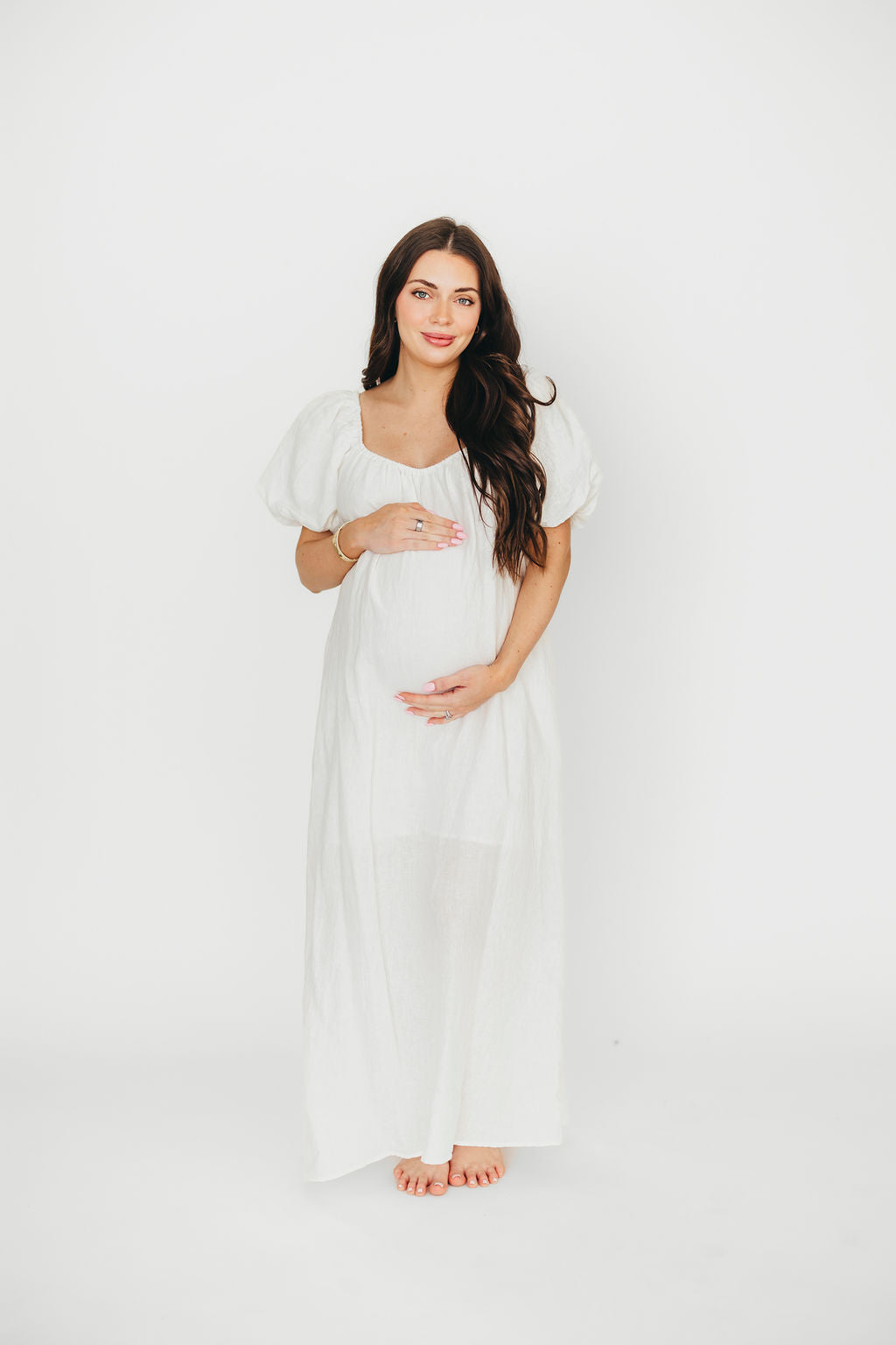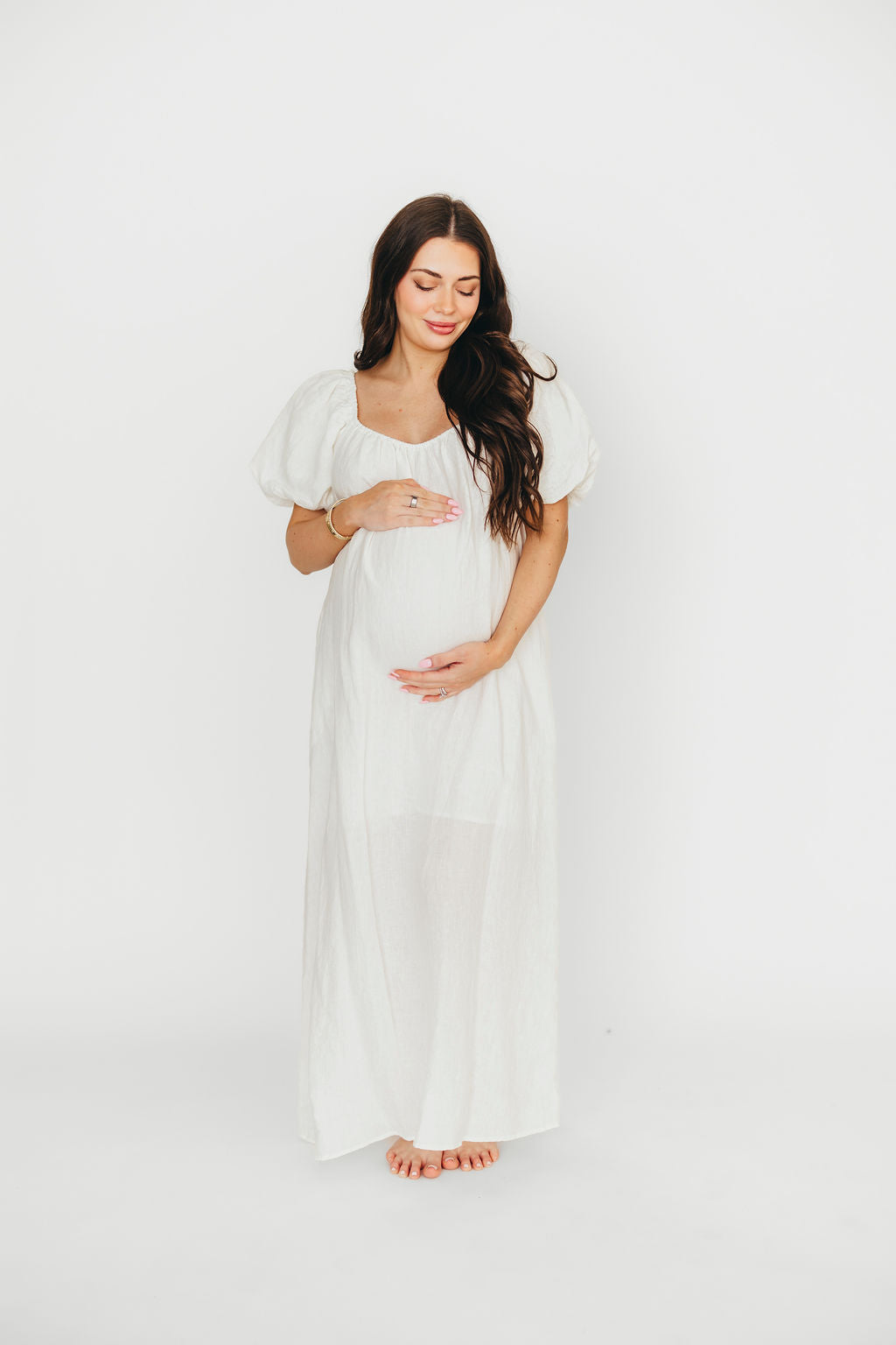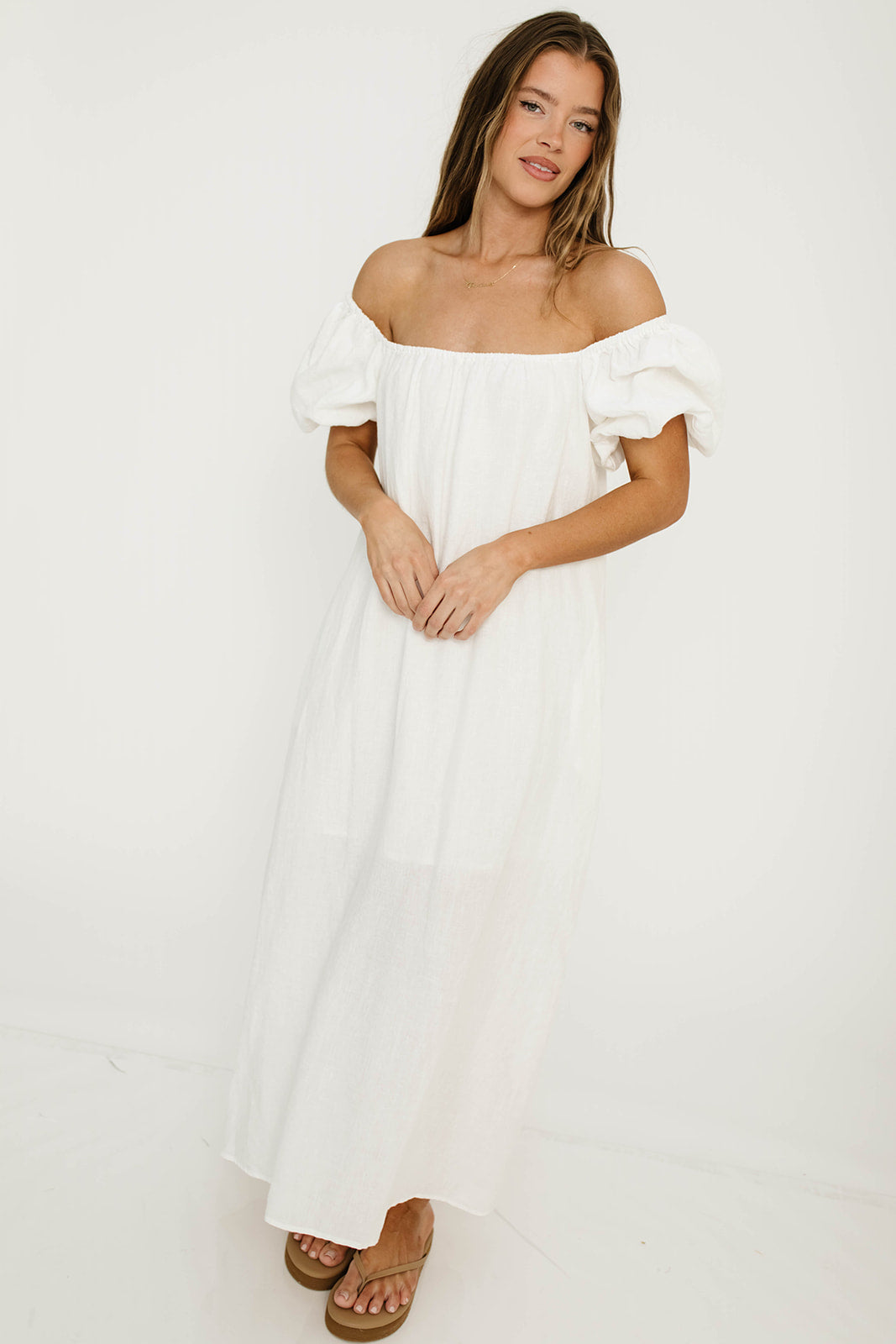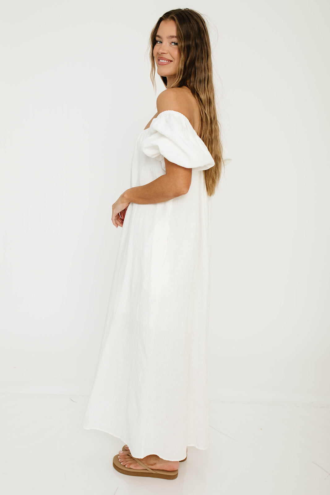 GARMENT DETAILS: 100% linen maxi dress with an elasticized neckline and short puffed sleeves that can be worn on or off the shoulder. Features a comfortable, relaxed fit, in-seam side pockets, and lining.