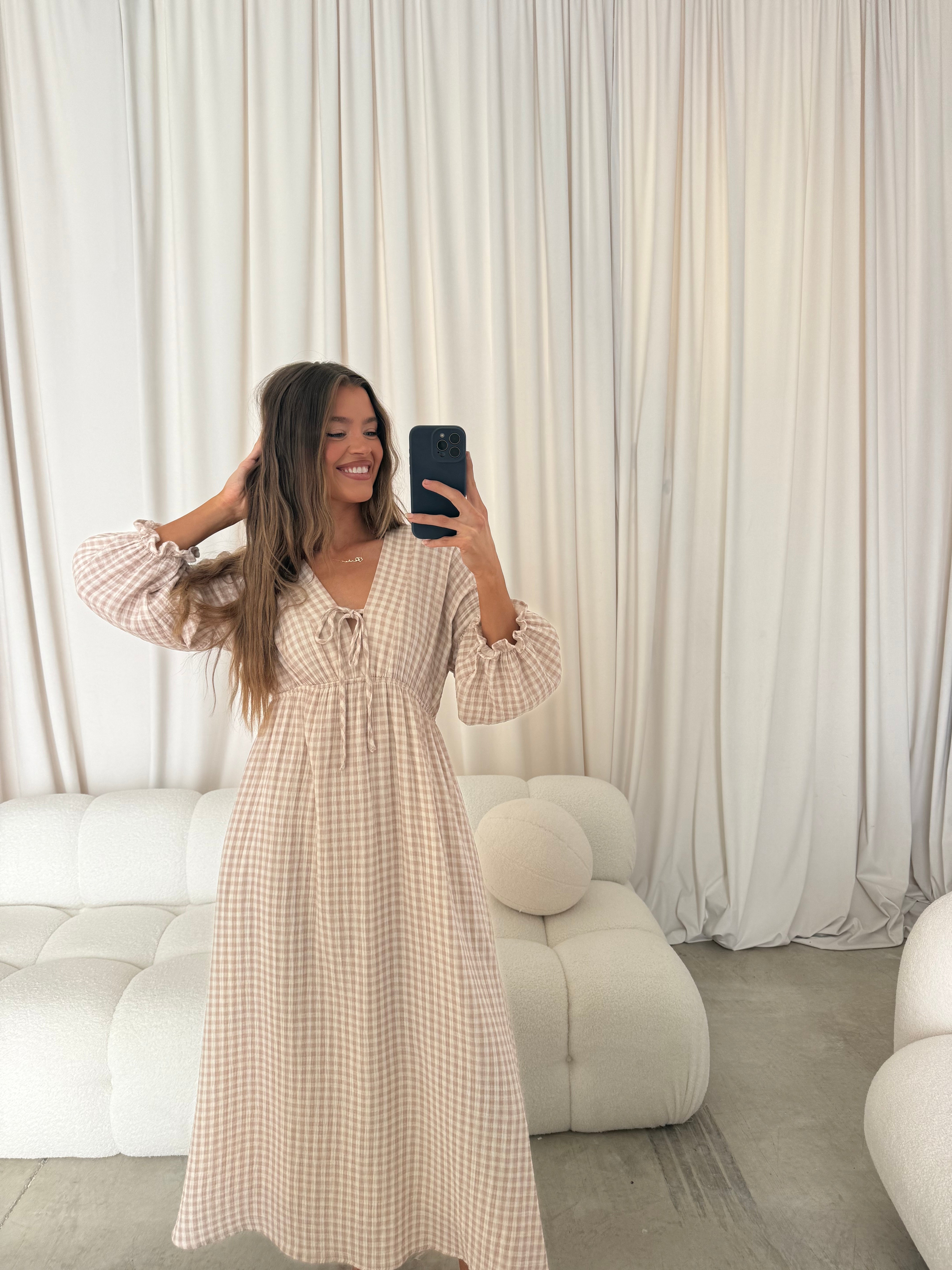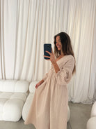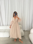 GARMENT DETAILS: Lightweight cotton gauze midi dress. Features V-neckline with self-tie detail, inverted empire waist, and full skirt with in-seam pockets. Finished with long balloon sleeves. This colorway is lined.