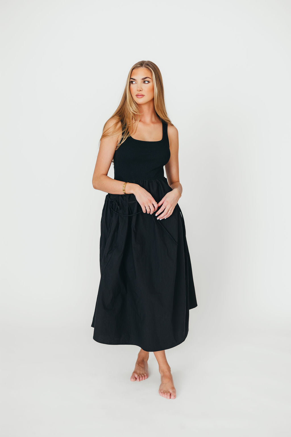 GARMENT DETAILS: Lightweight multi-fabric midi with a stretchy, ribbed knit tank bodice paired with a full poplin skirt. Finished with in-seam side pockets.