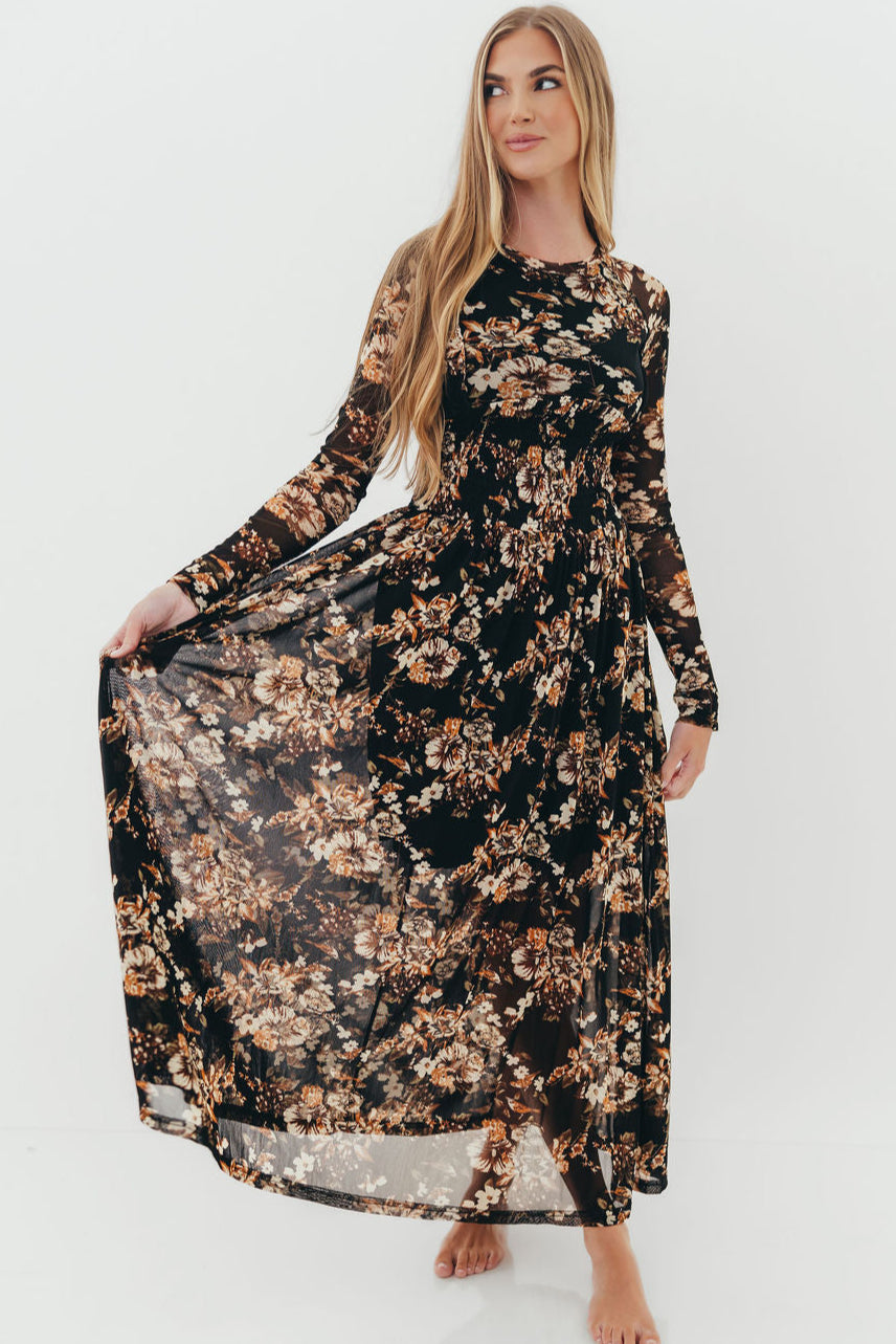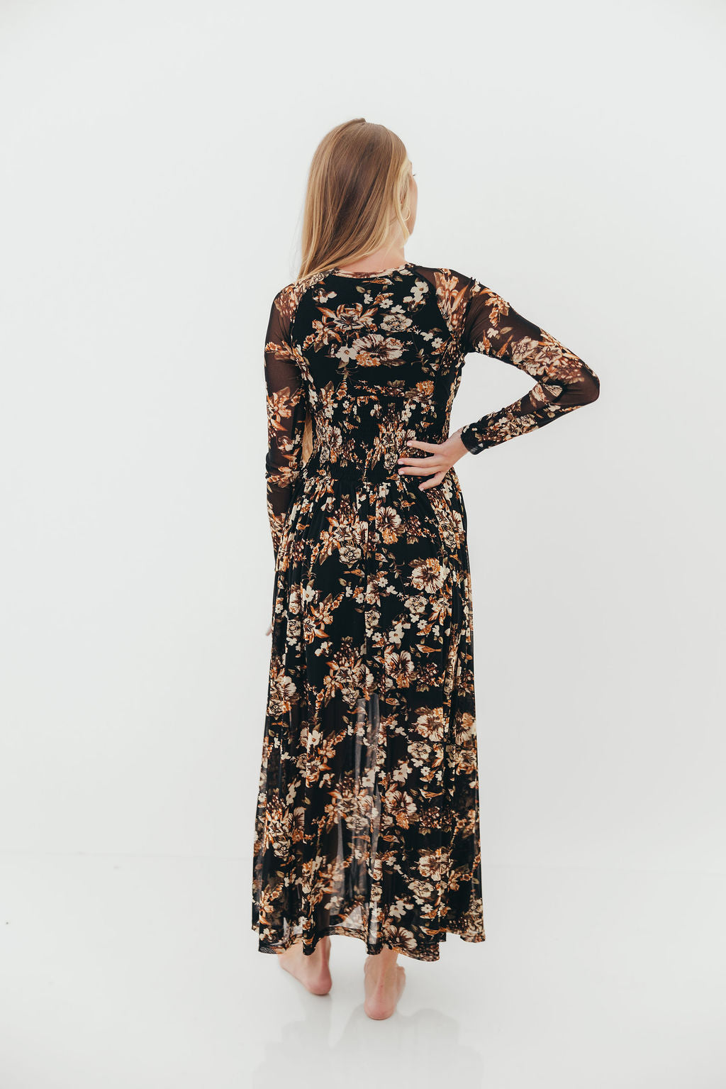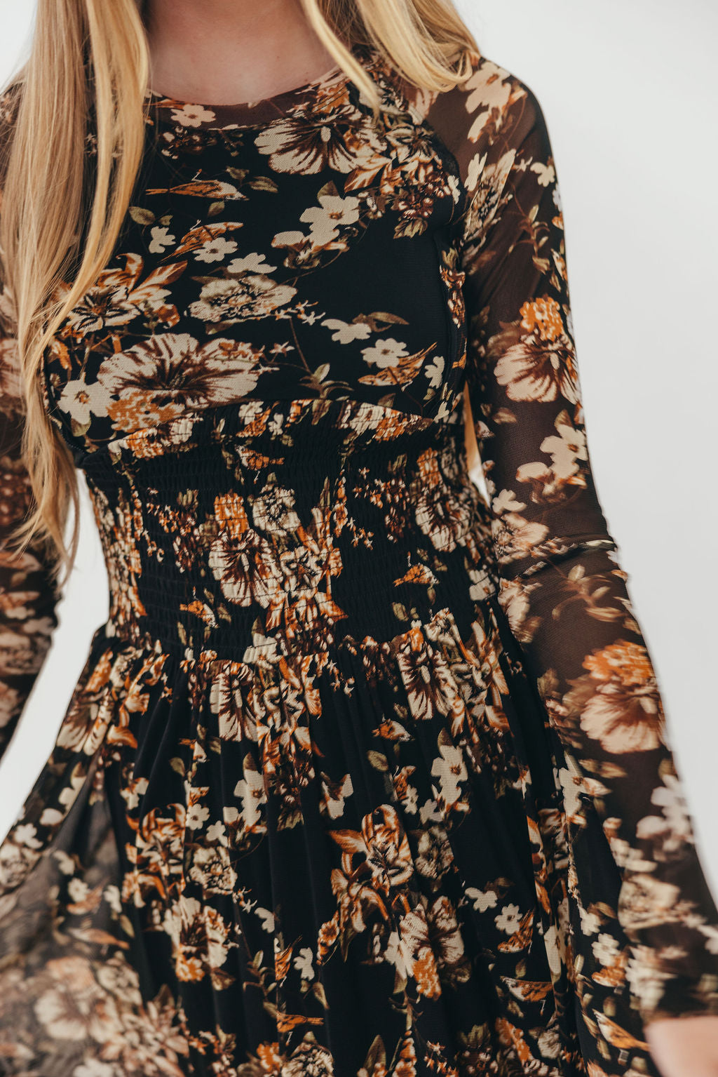 Tori Floral Mesh Long Sleeve Midi Dress in Black