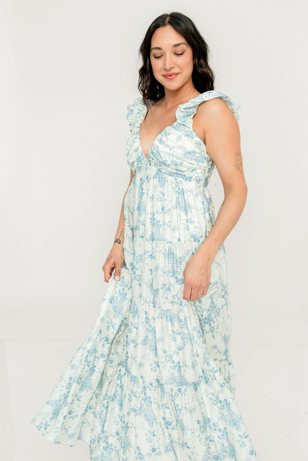 Katy Pleated Bodice Maxi Dress in Blue Floral