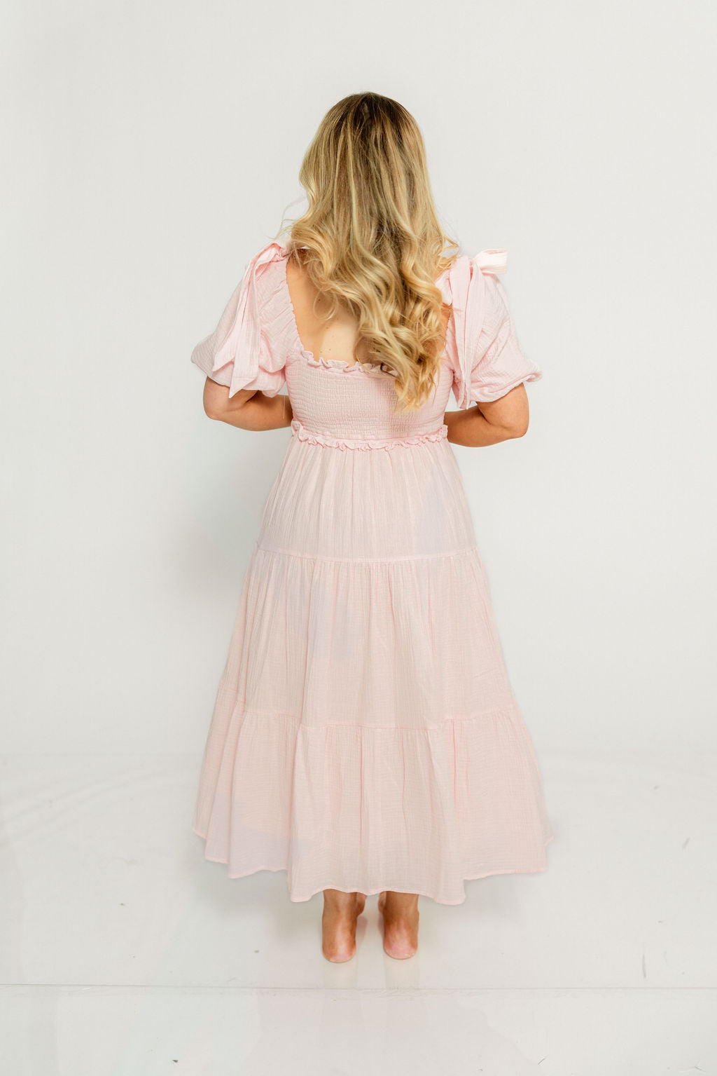 GARMENT DETAILS: Elegant midi dress with a square neckline, statement puffed sleeves, and bow accents on the shoulders. Features a fully smocked bodice, with a multi-tiered skirt.