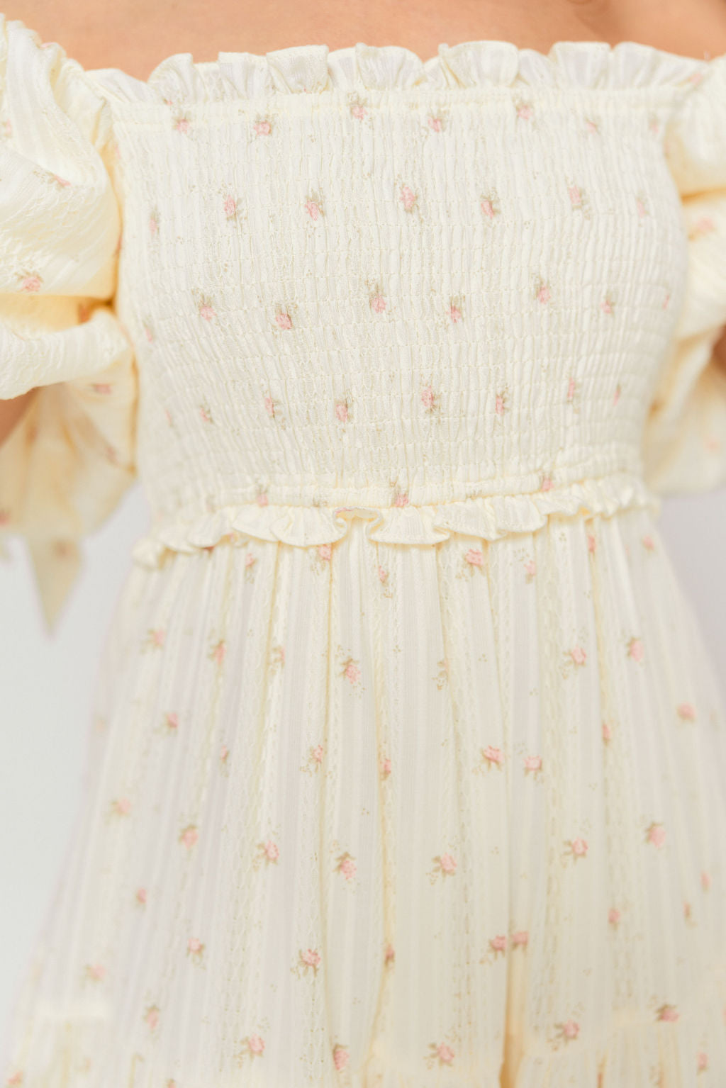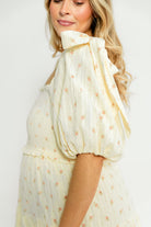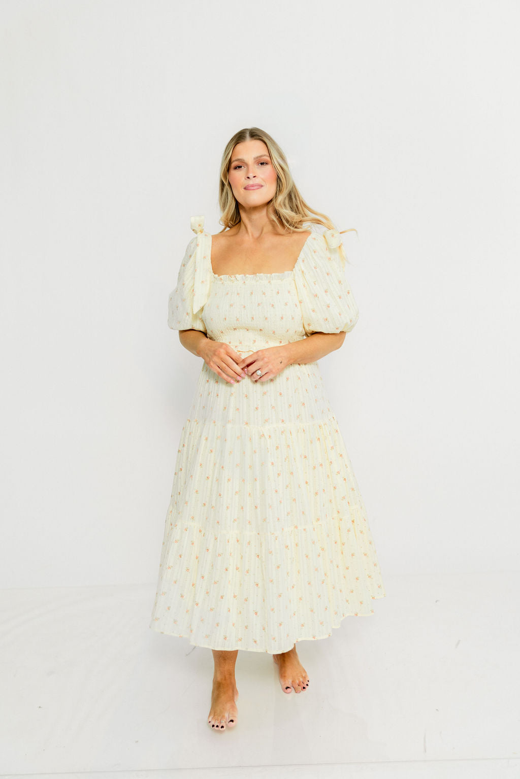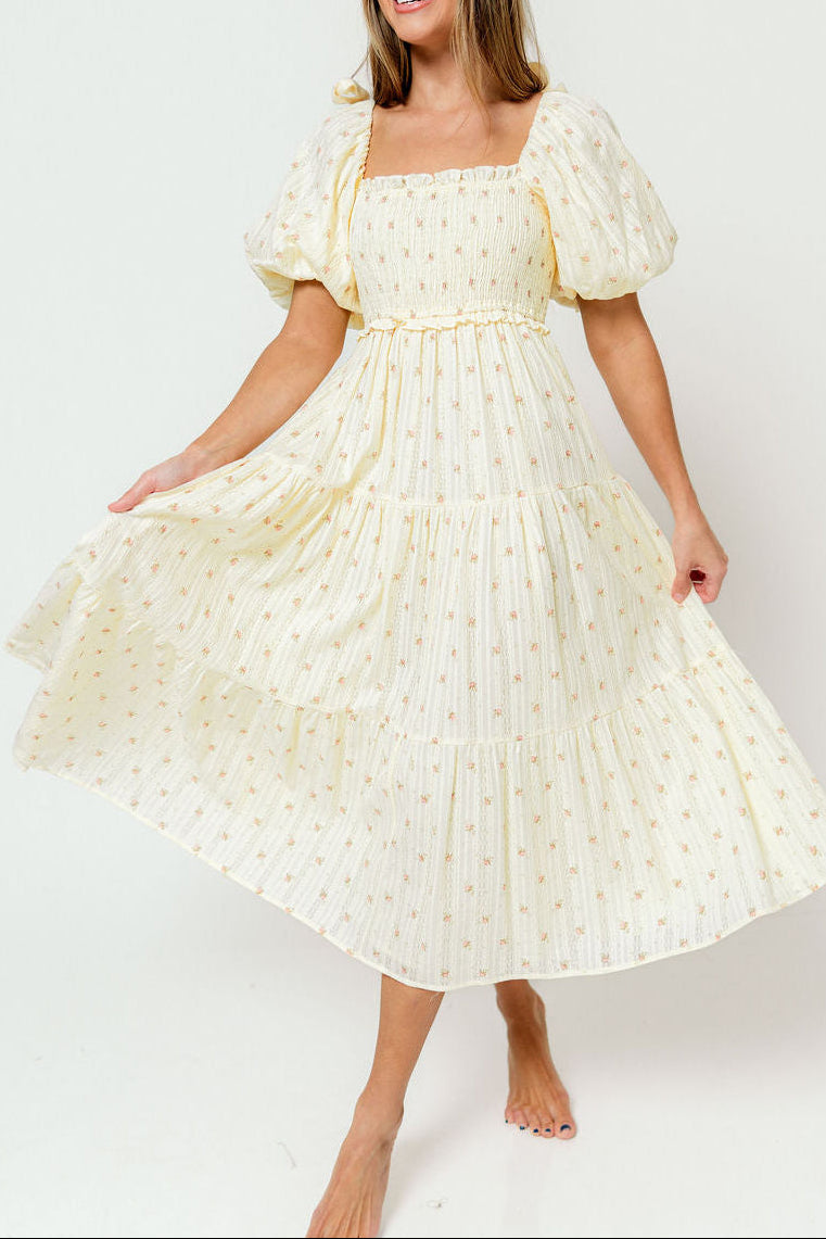 GARMENT DETAILS: Elegant midi dress with a square neckline, statement puffed sleeves, and bow accents on the shoulders. Features a fully smocked bodice, with a multi-tiered skirt.