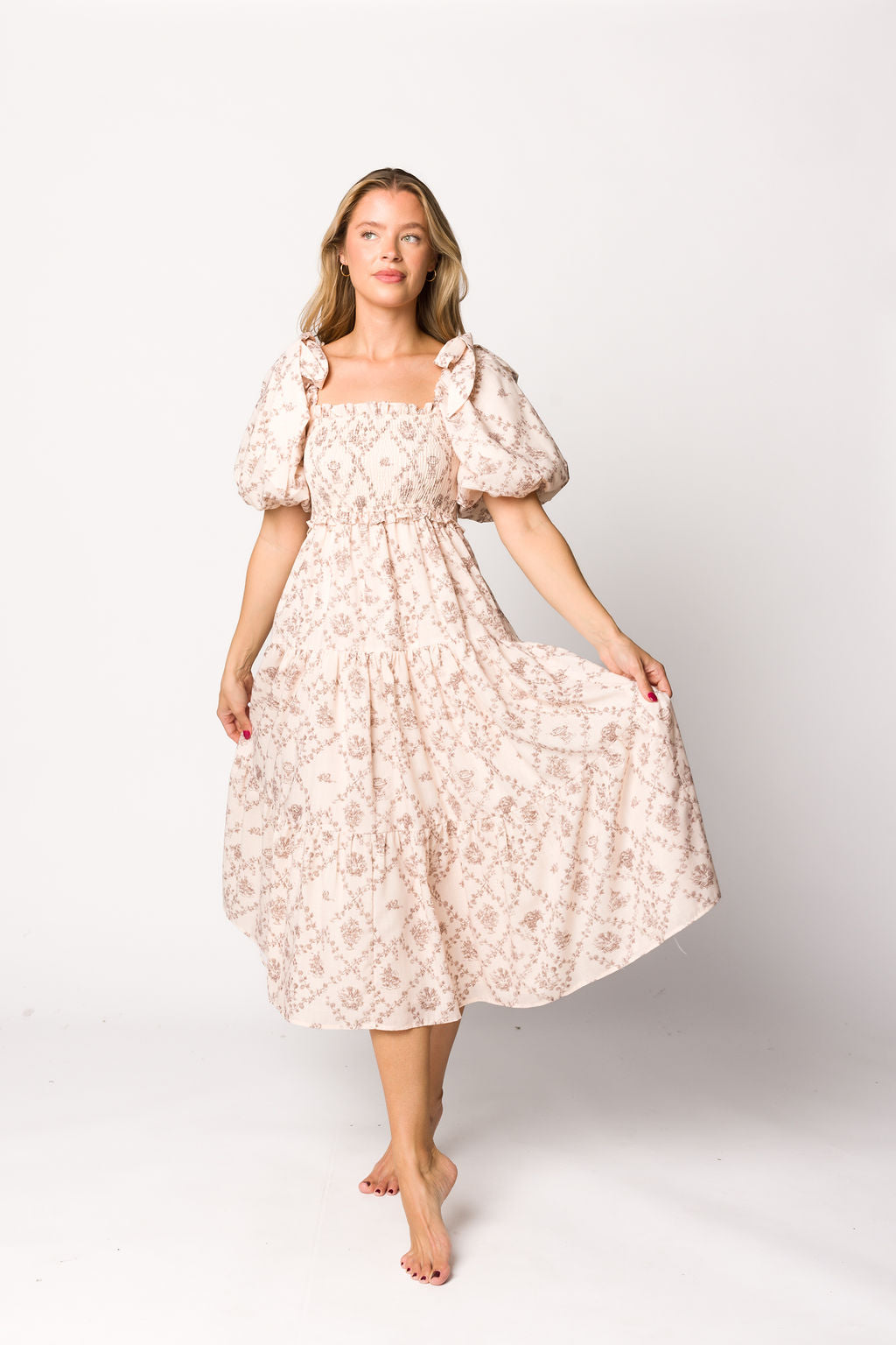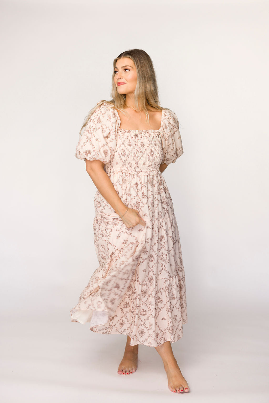Elena 100% Cotton Toile Print Smocked Midi Dress in Pink - Bump Friendly *12/19 PRE-ORDER*