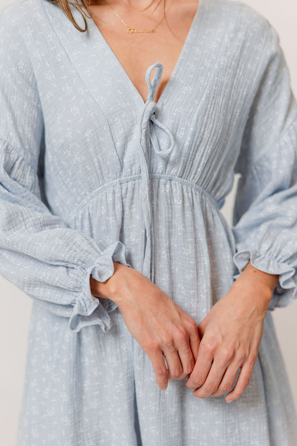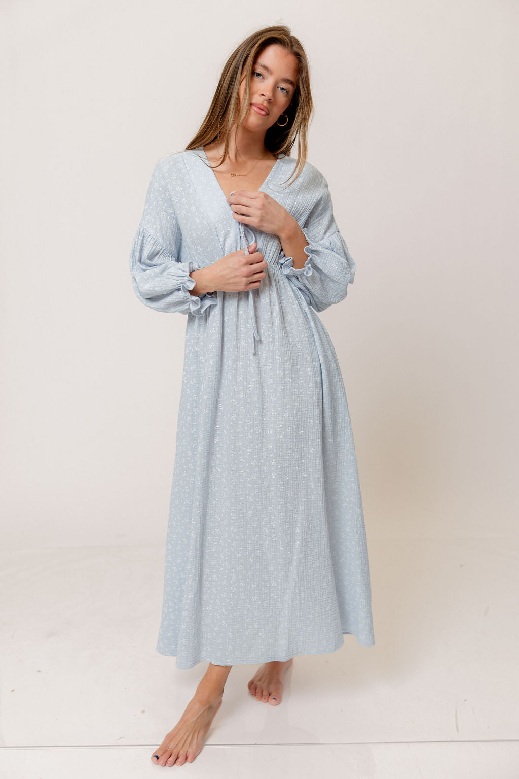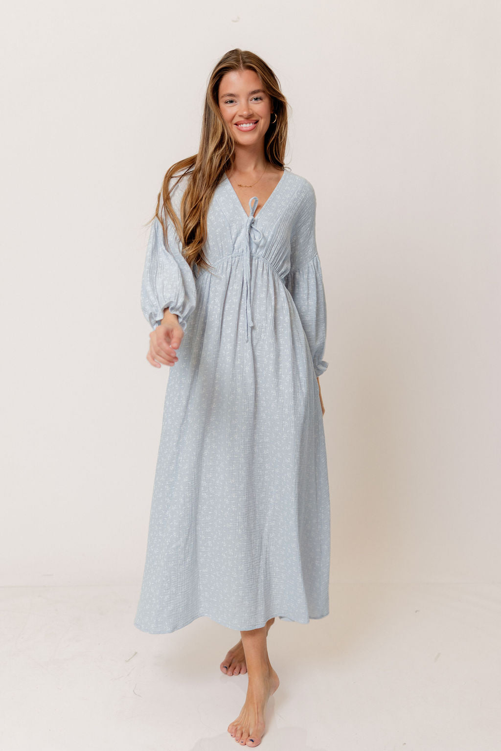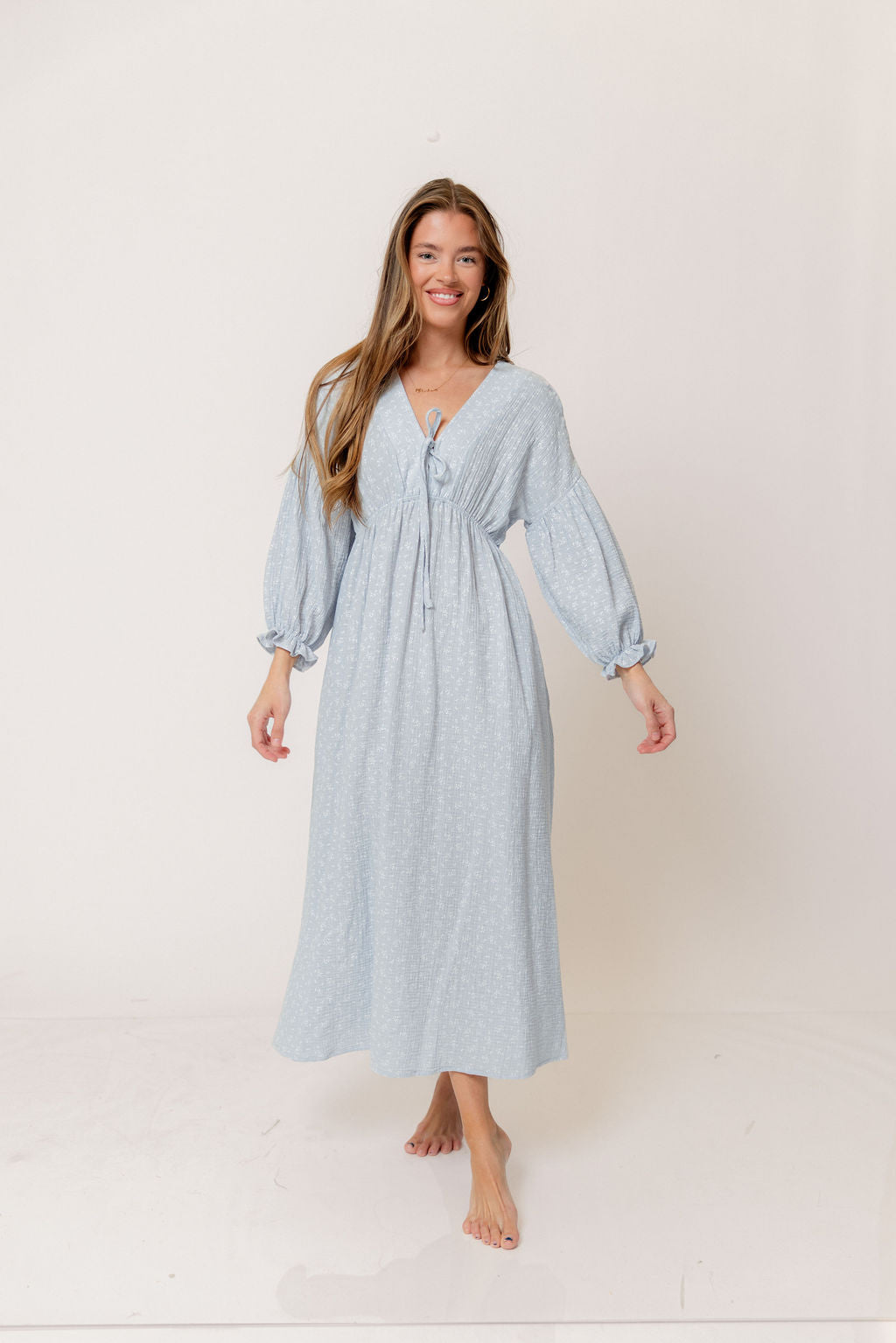 GARMENT DETAILS: Lightweight cotton gauze midi dress. Features V-neckline with self-tie detail, inverted empire waist, and full skirt with in-seam pockets. Finished with long balloon sleeves. This colorway is not lined.