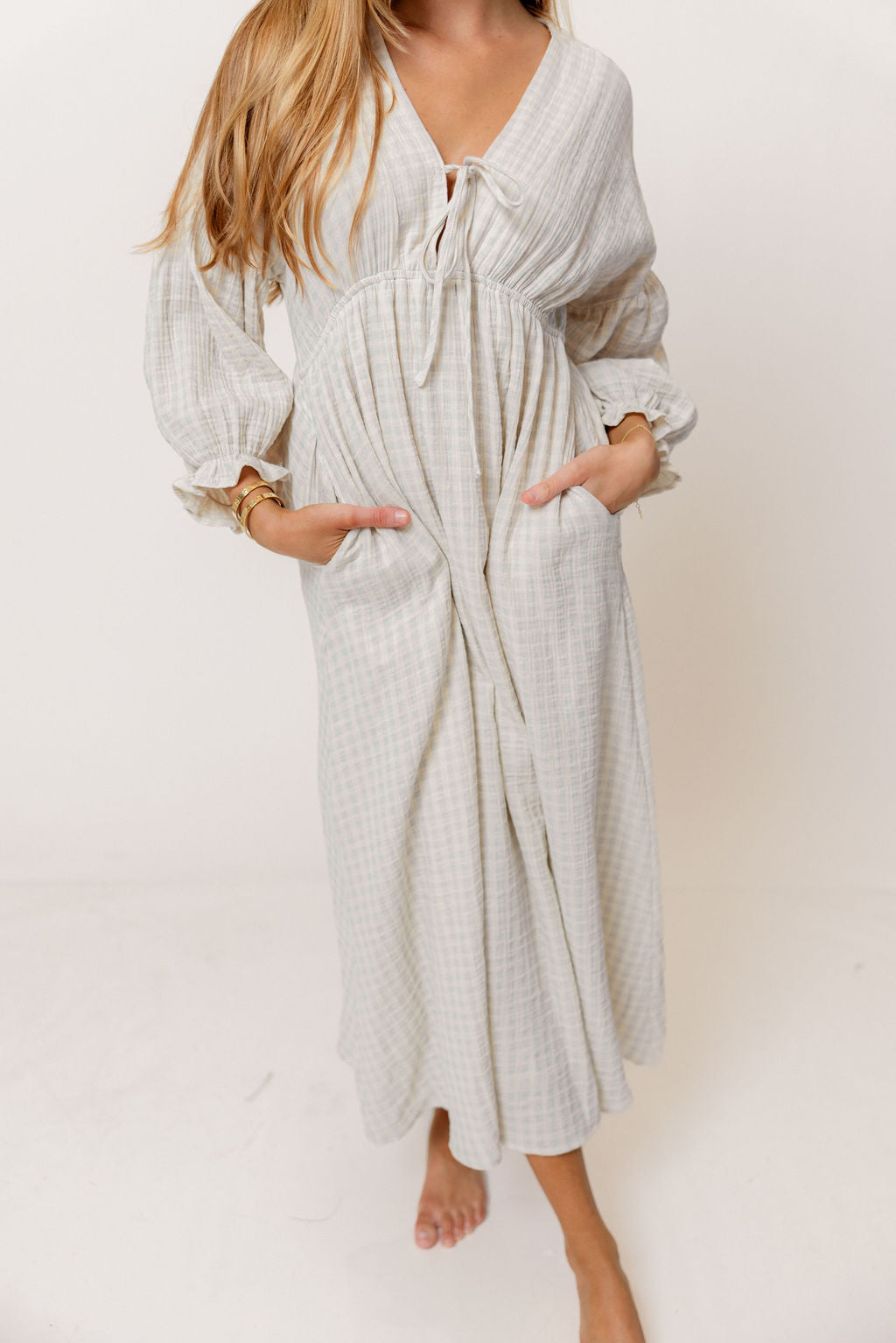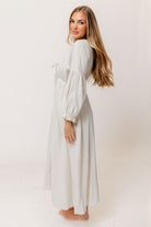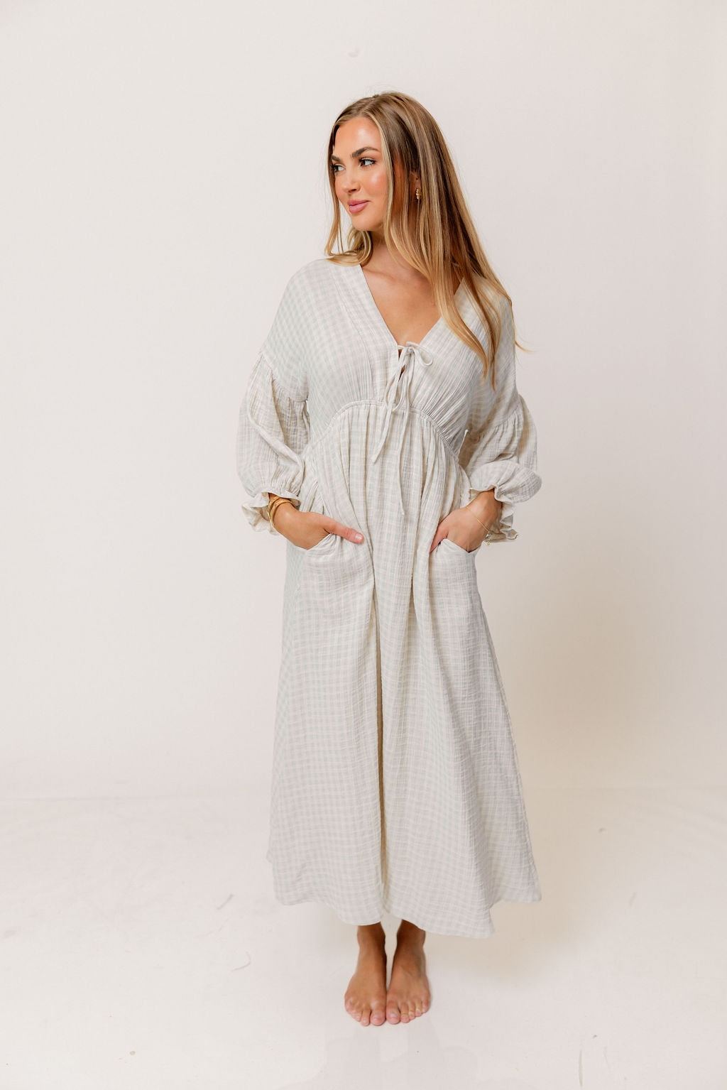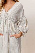 GARMENT DETAILS: Lightweight cotton gauze midi dress. Features V-neckline with self-tie detail, inverted empire waist, and full skirt with in-seam pockets. Finished with long balloon sleeves. This colorway is fully lined.