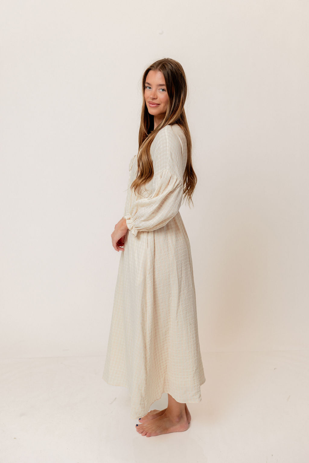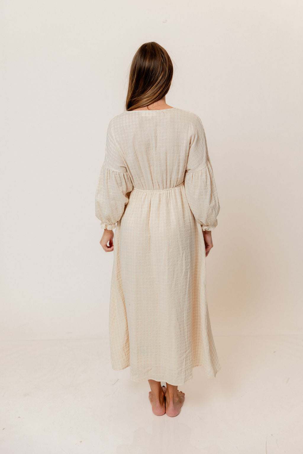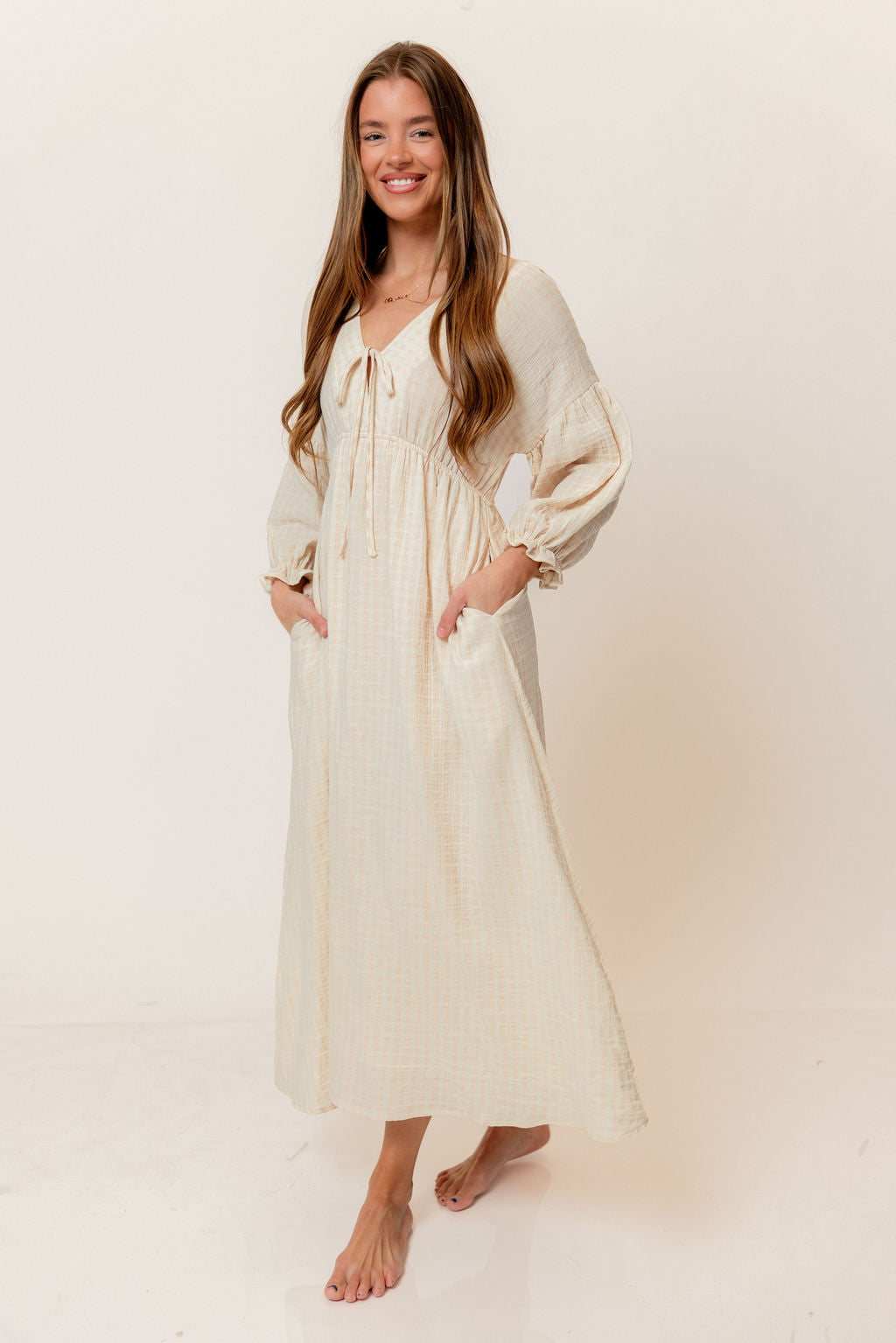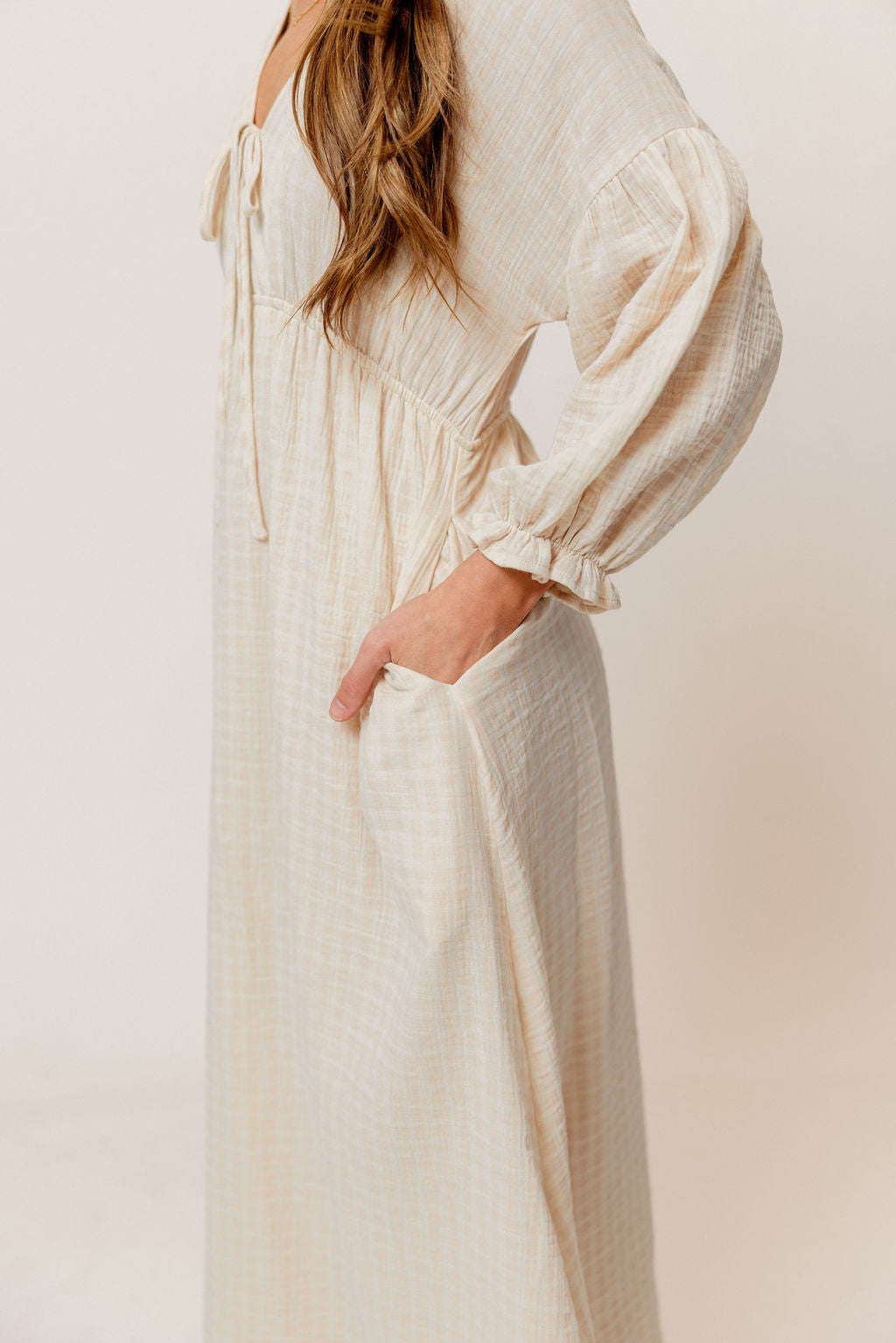 GARMENT DETAILS: Lightweight cotton gauze midi dress. Features V-neckline with self-tie detail, inverted empire waist, and full skirt with in-seam pockets. Finished with long balloon sleeves. This colorway is fully lined.