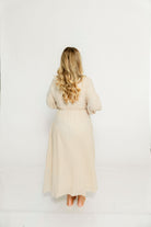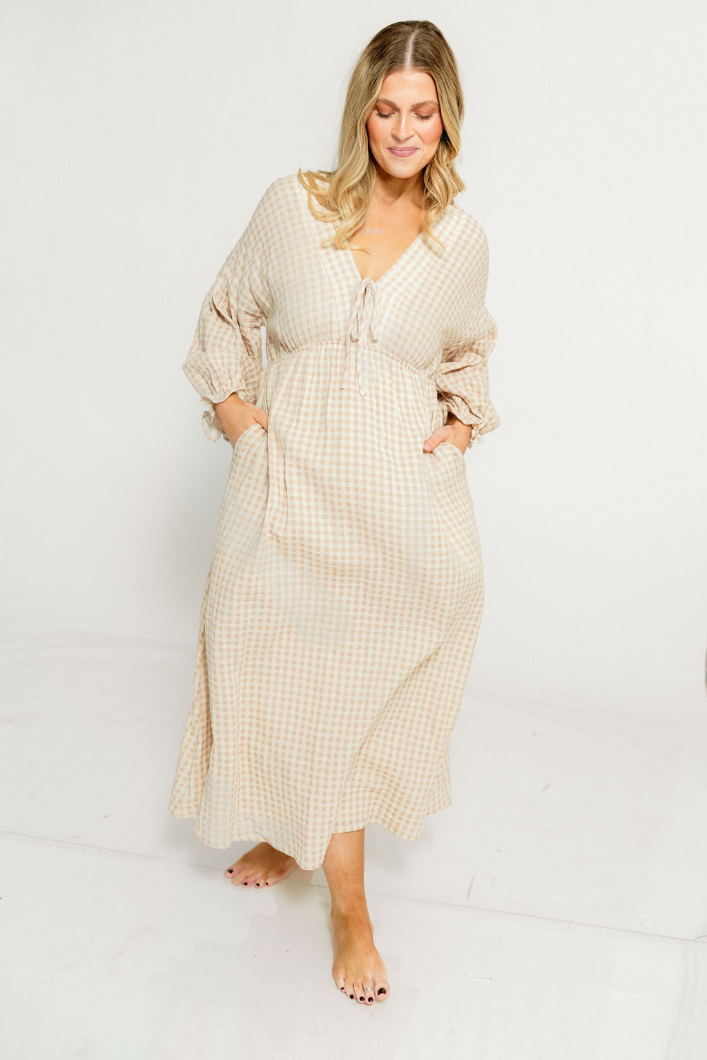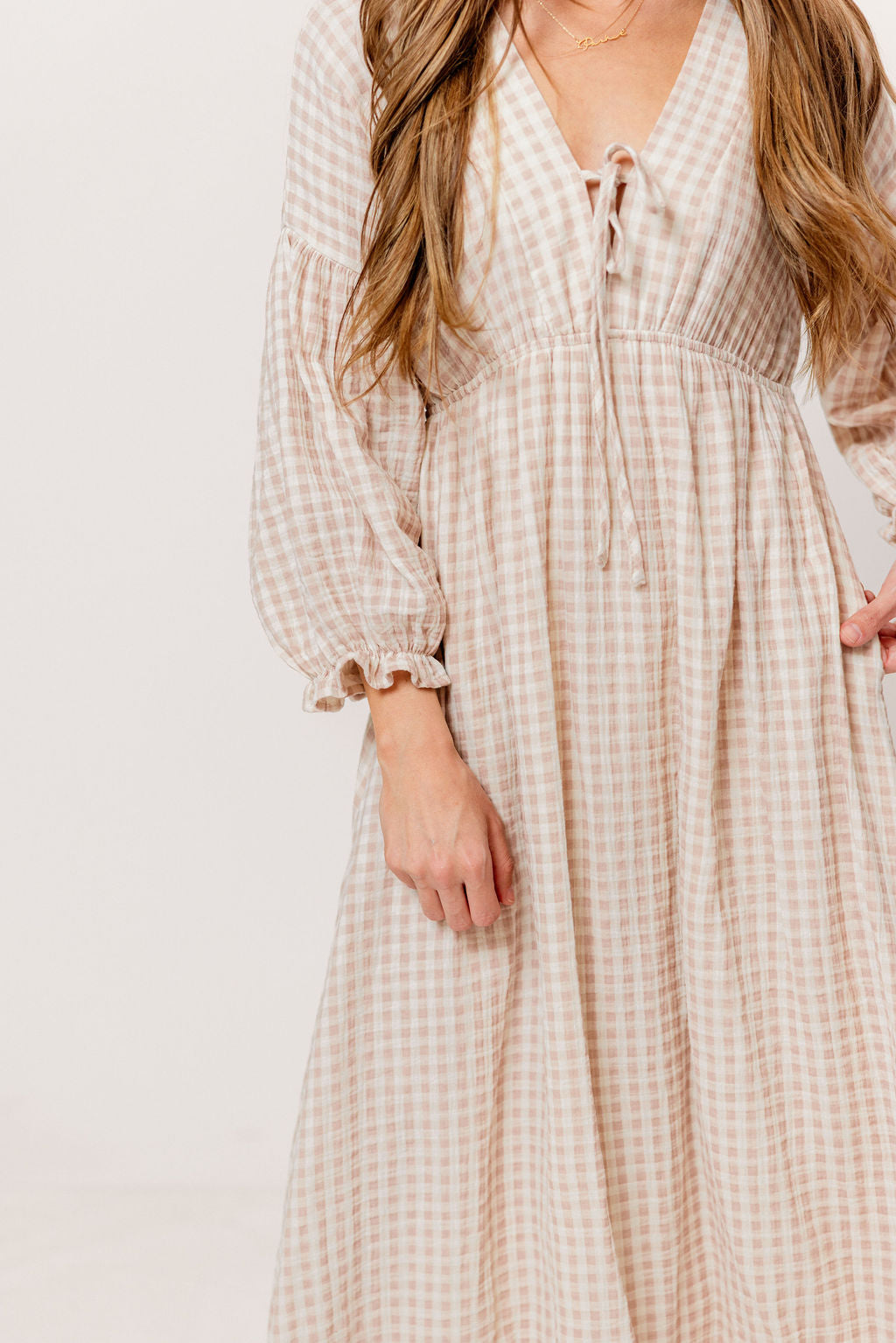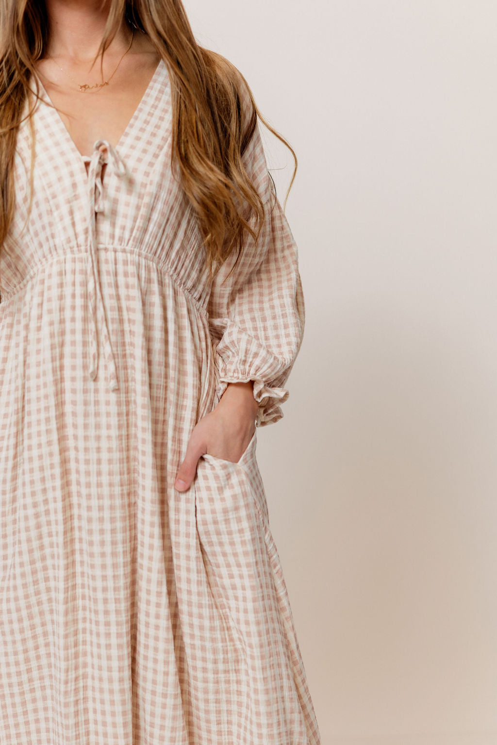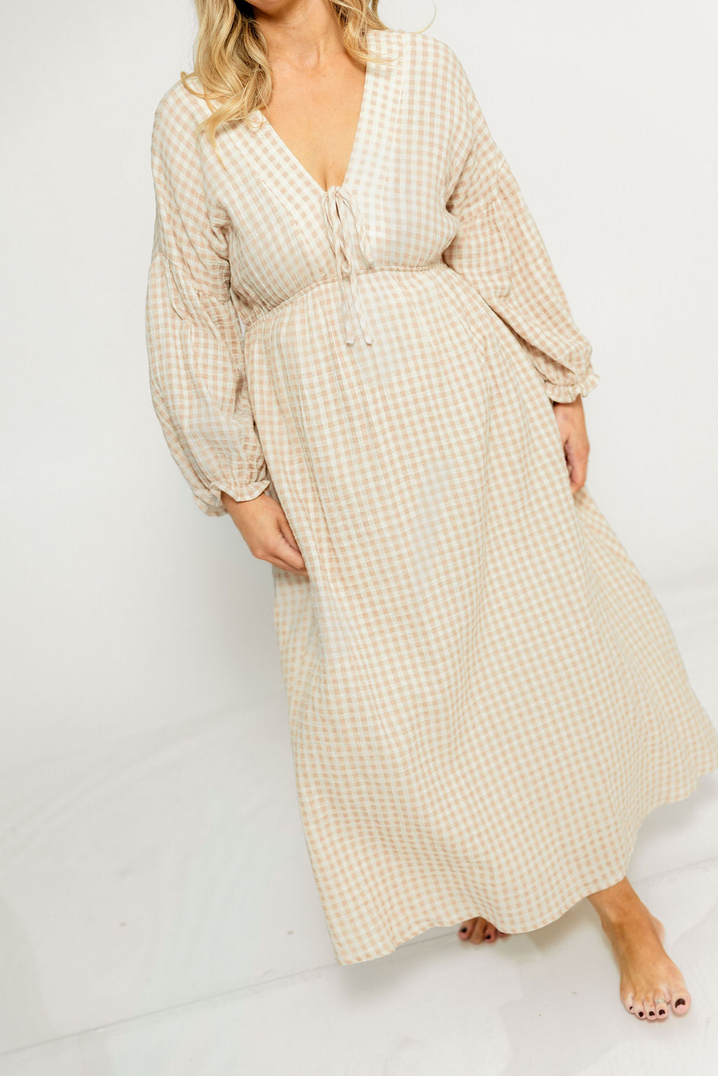 GARMENT DETAILS: Lightweight cotton gauze midi dress. Features V-neckline with self-tie detail, inverted empire waist, and full skirt with in-seam pockets. Finished with long balloon sleeves. This colorway is lined.