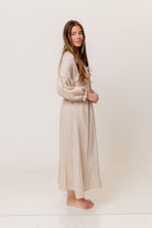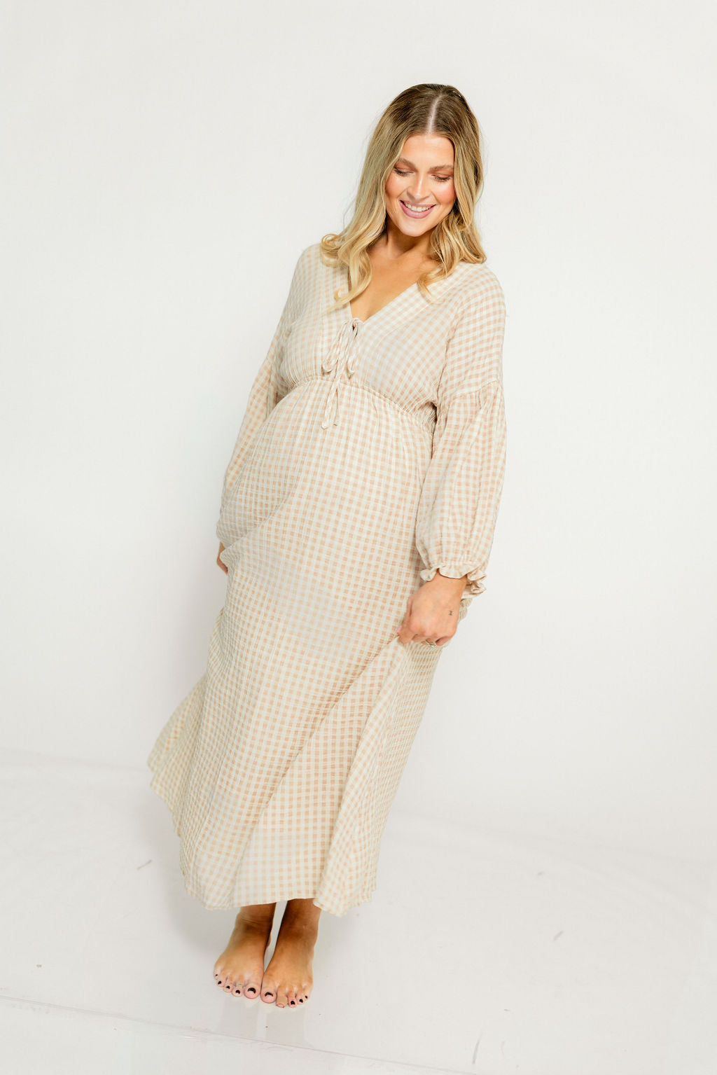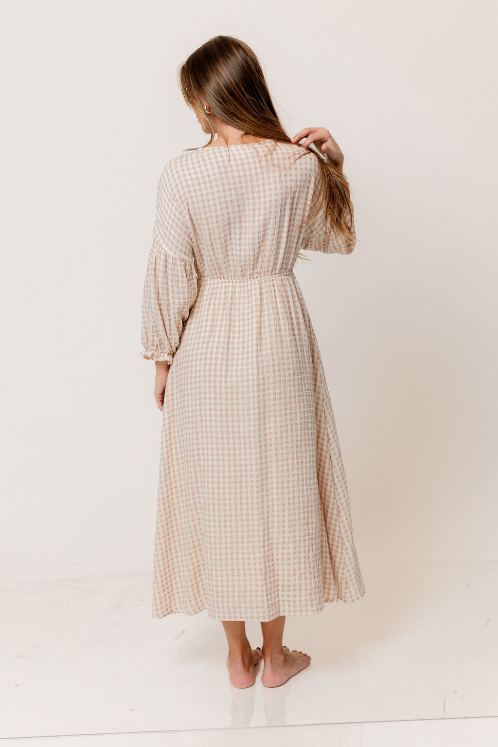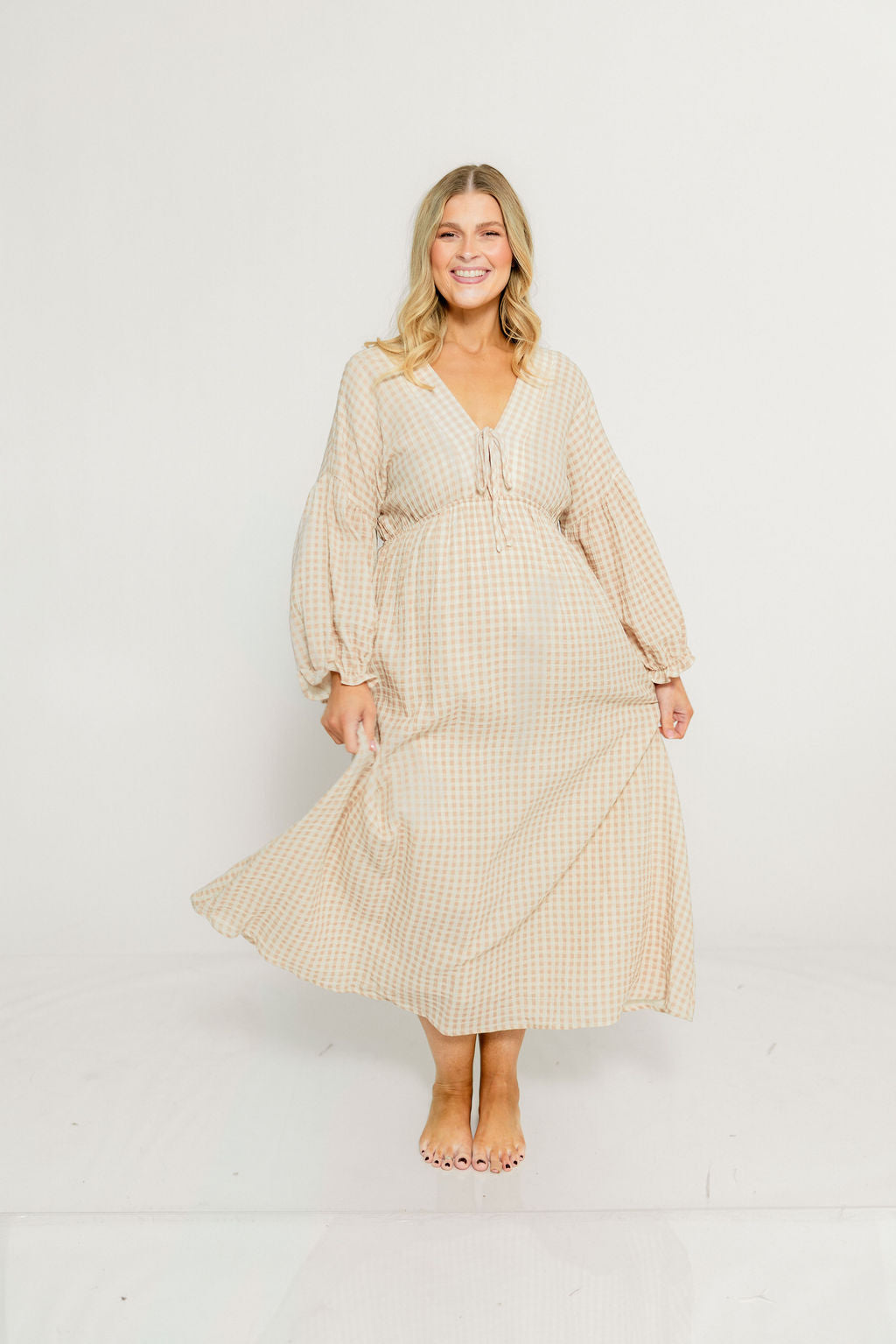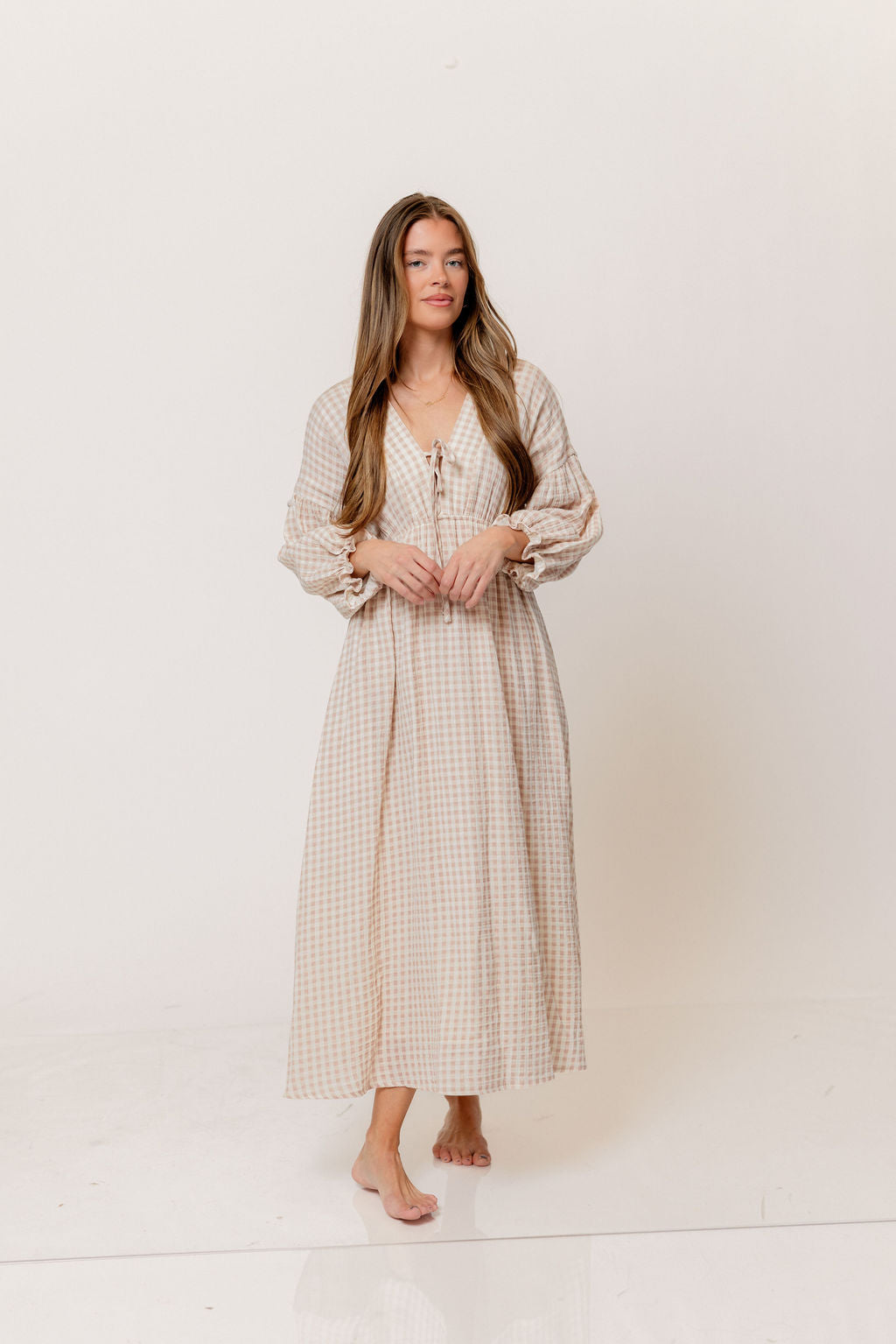 GARMENT DETAILS: Lightweight cotton gauze midi dress. Features V-neckline with self-tie detail, inverted empire waist, and full skirt with in-seam pockets. Finished with long balloon sleeves. This colorway is lined.
