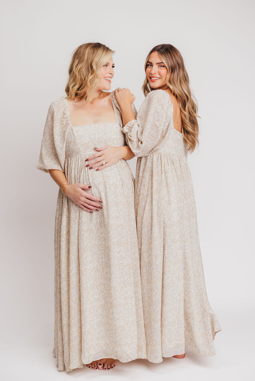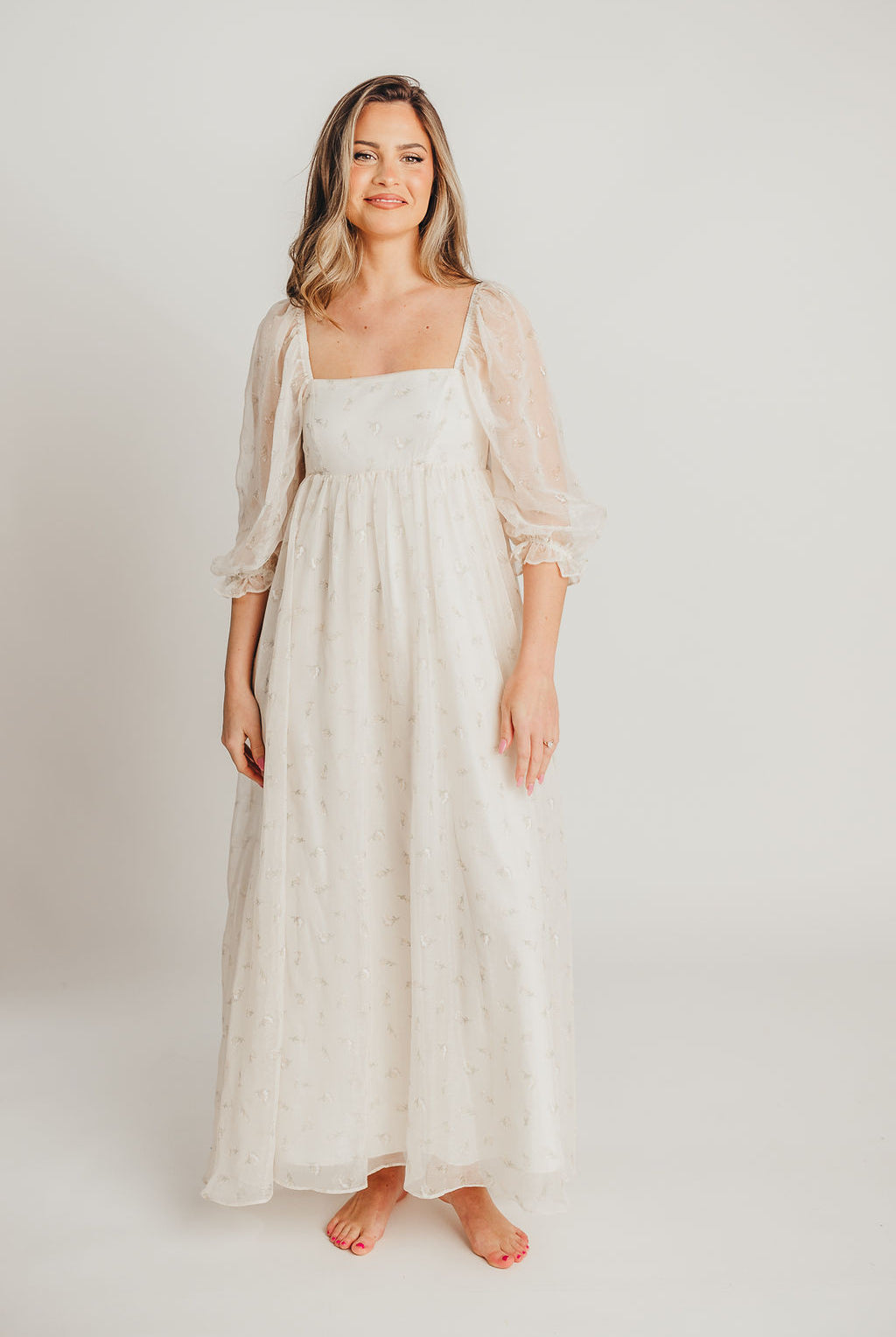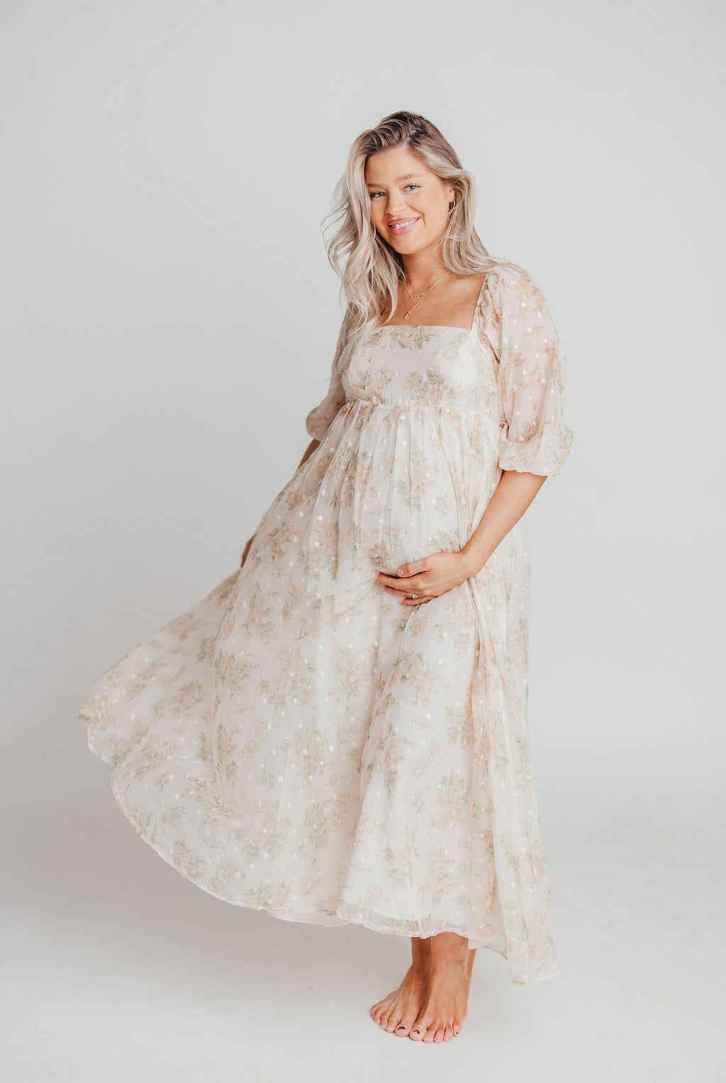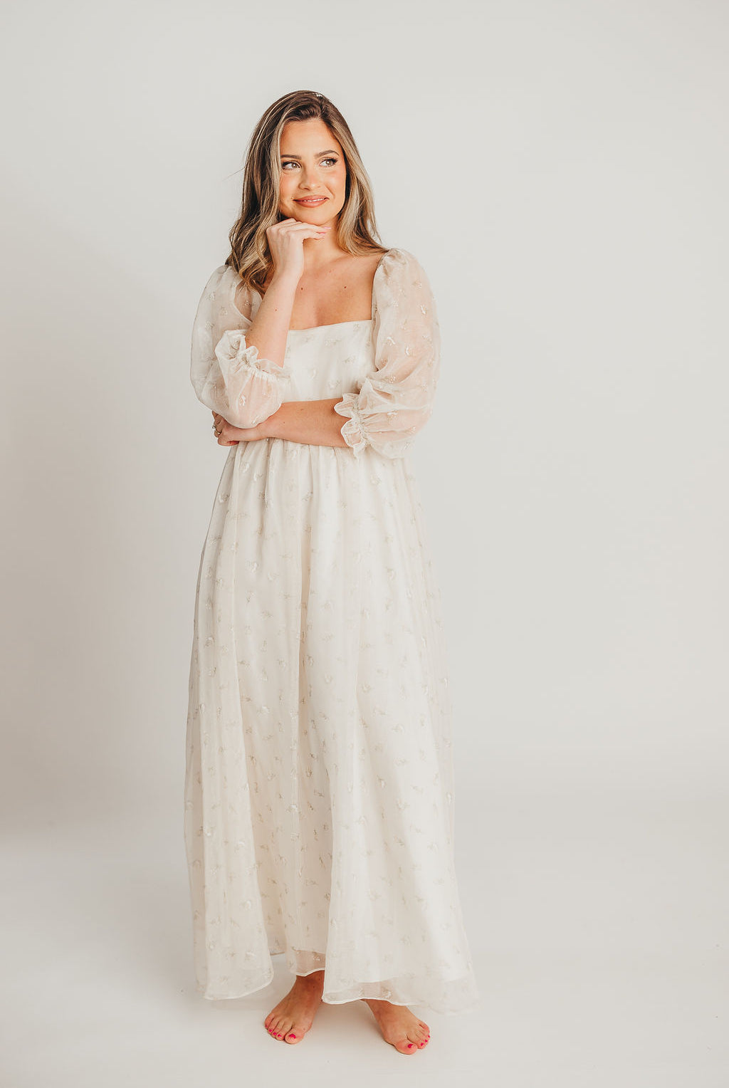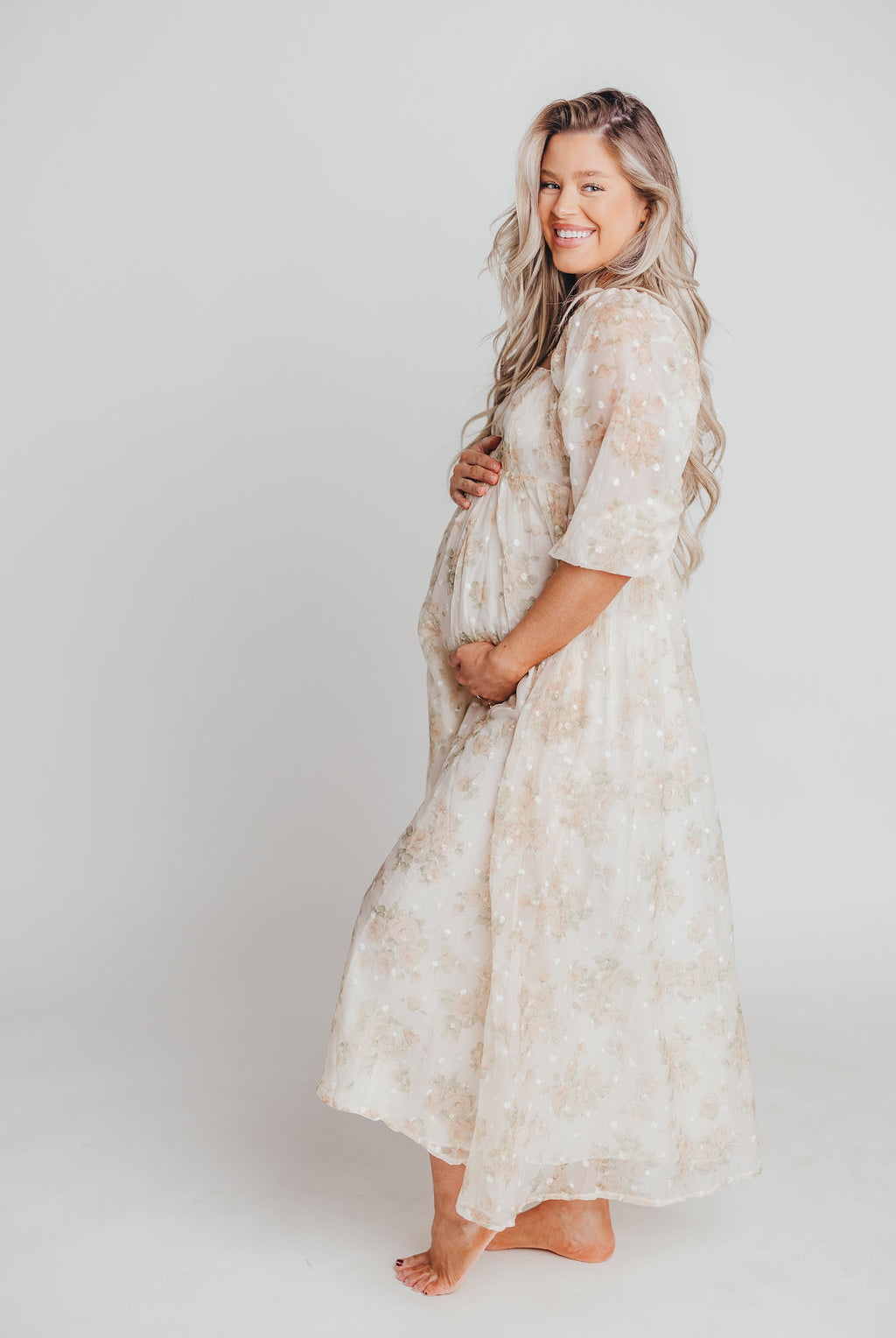 This dreamy maxi dress is pure romance; you'll practically float away in a stunning, gauzy cloud! Featuring a flattering square neckline and empire waist, it's giving elegant Bridgerton while staying fresh and charming. The Mona is a favorite with our expecting mamas, and is a perfect choice for maternity shoots or a special event brunch. Enjoy feeling like royalty!