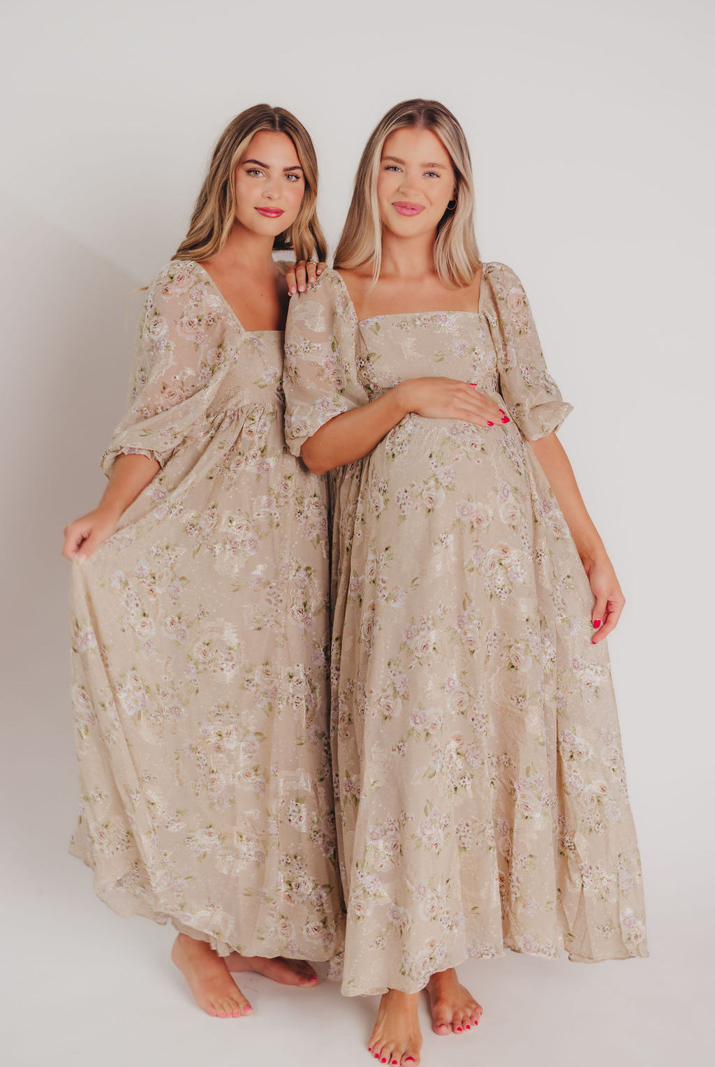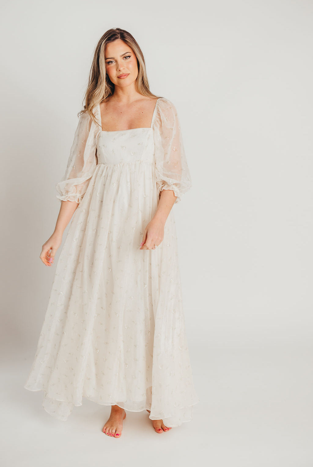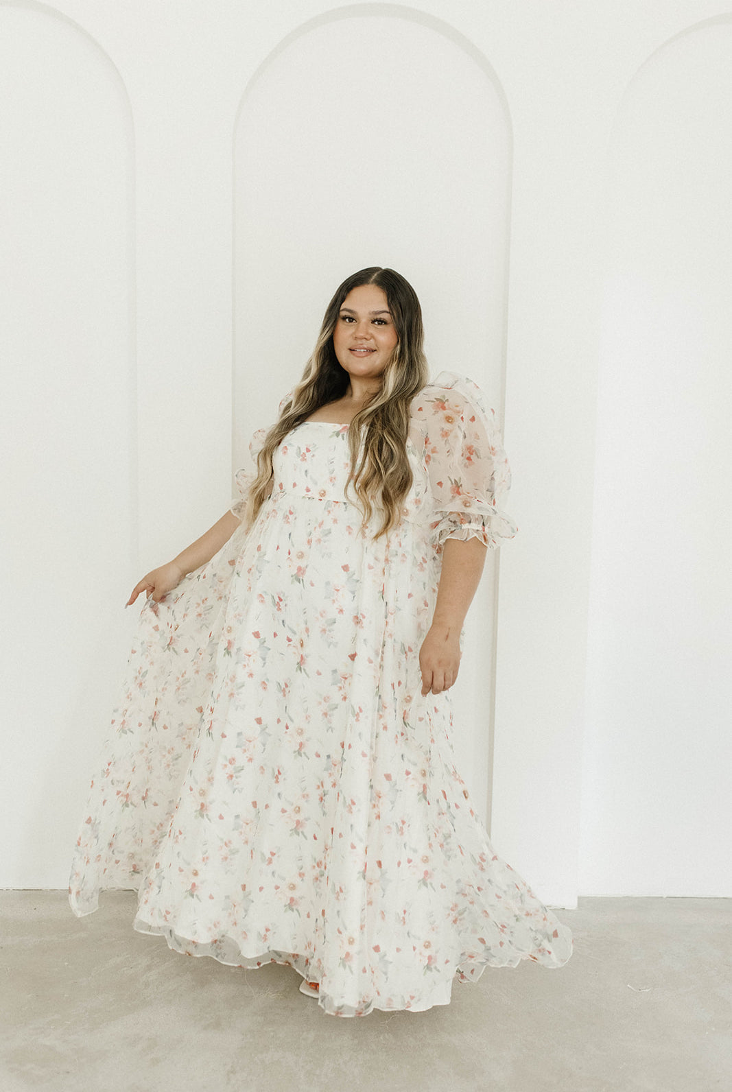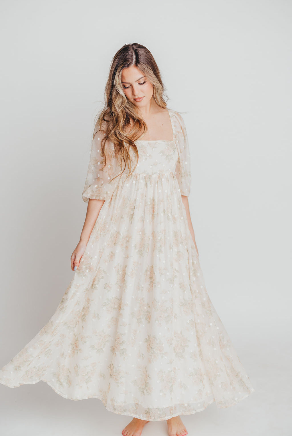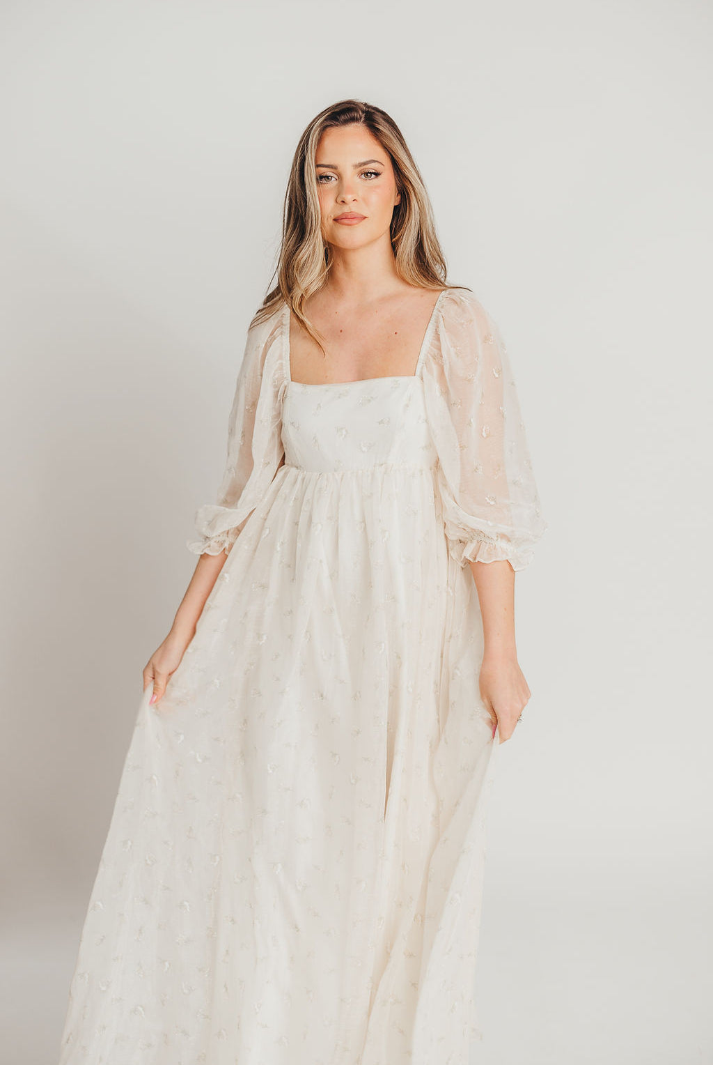 This dreamy maxi dress is pure romance; you'll practically float away in a stunning, gauzy cloud! Featuring a flattering square neckline and empire waist, it's giving elegant Bridgerton while staying fresh and charming. The Mona is a favorite with our expecting mamas, and is a perfect choice for maternity shoots or a special event brunch. Enjoy feeling like royalty!