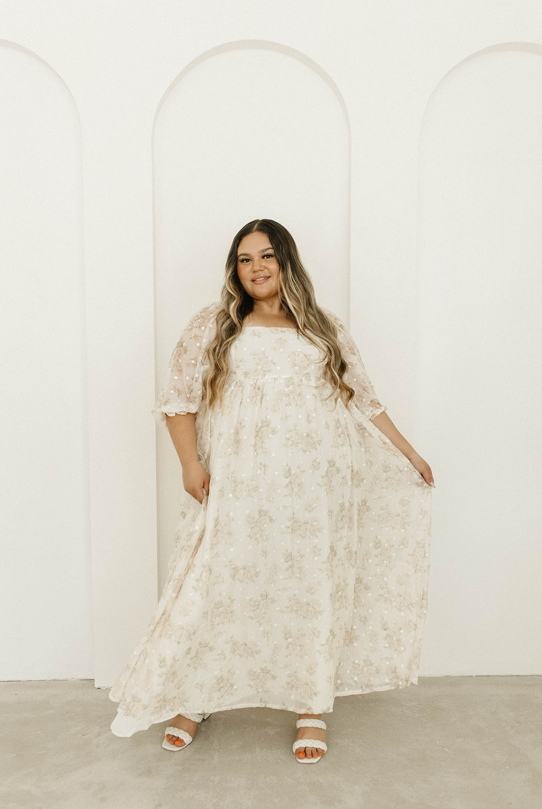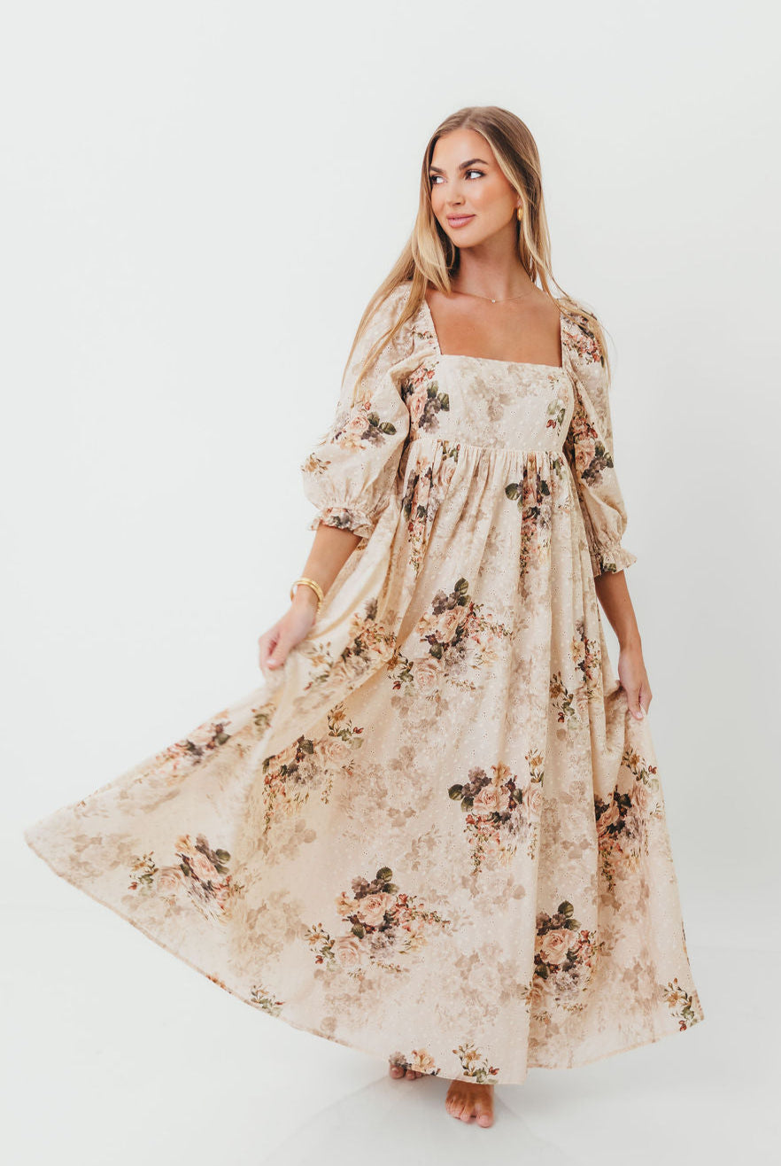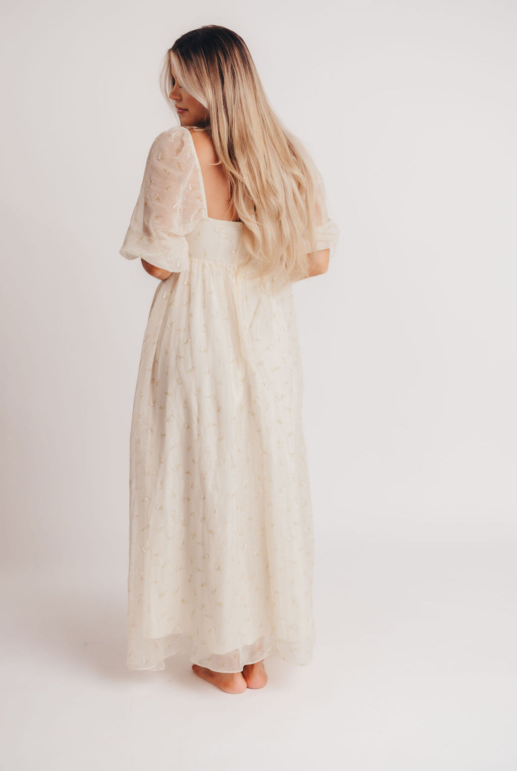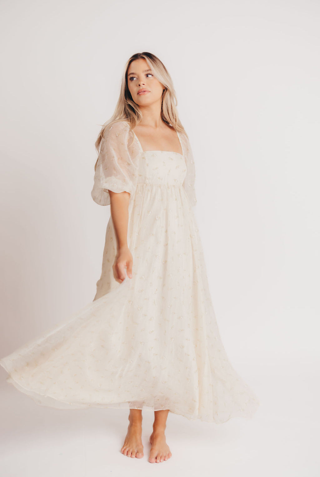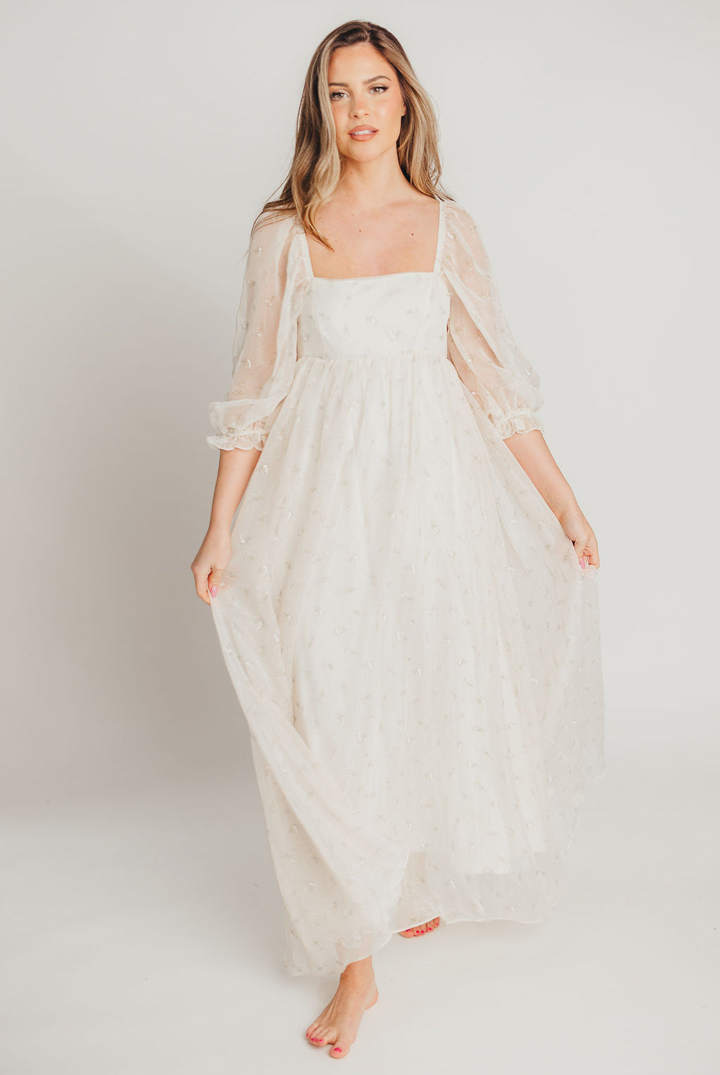 This dreamy maxi dress is pure romance; you'll practically float away in a stunning, gauzy cloud! Featuring a flattering square neckline and empire waist, it's giving elegant Bridgerton while staying fresh and charming. The Mona is a favorite with our expecting mamas, and is a perfect choice for maternity shoots or a special event brunch. Enjoy feeling like royalty!