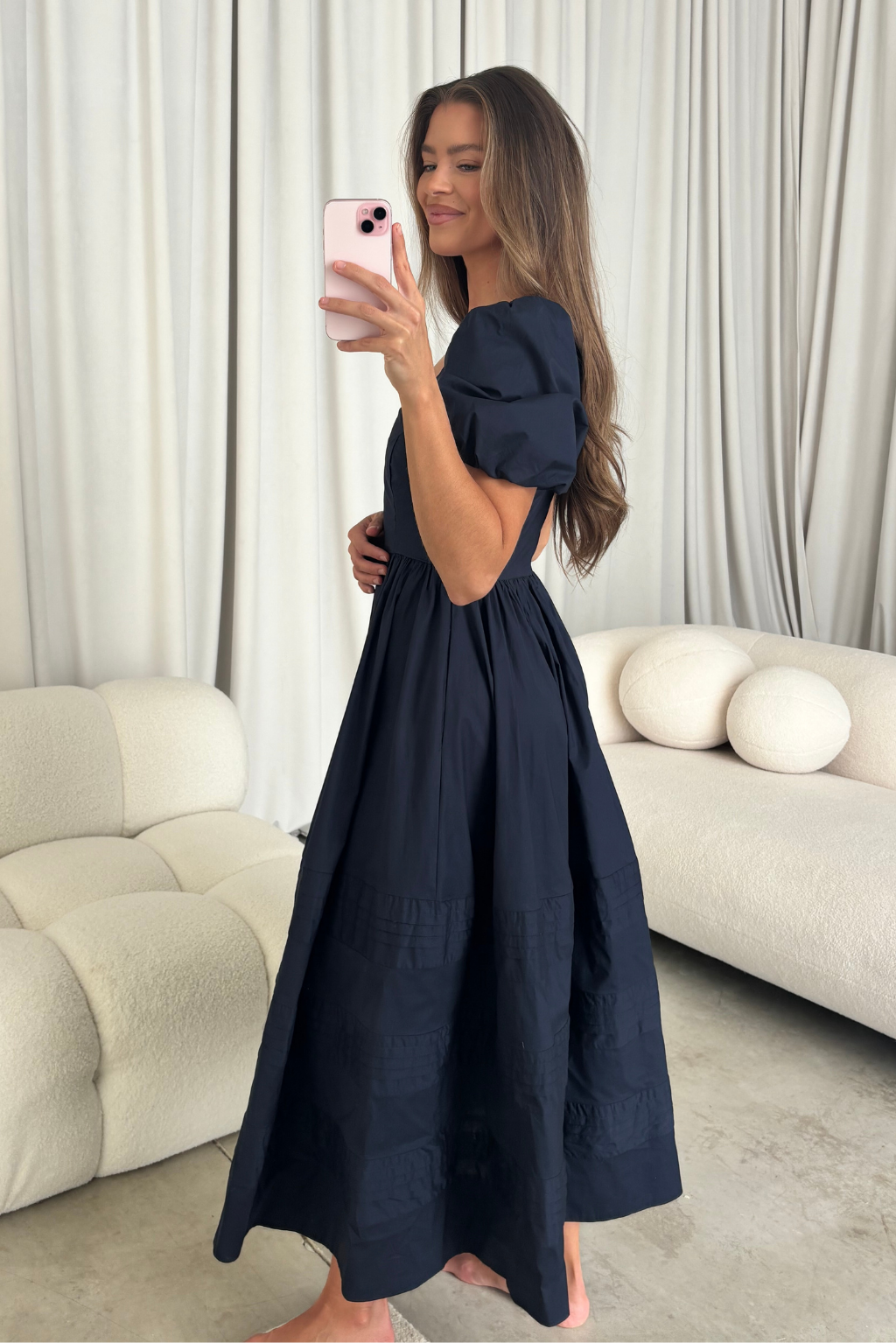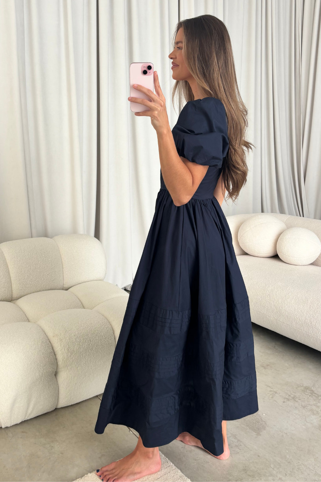 Mariana Gingham Puff Sleeve Midi Dress in Navy