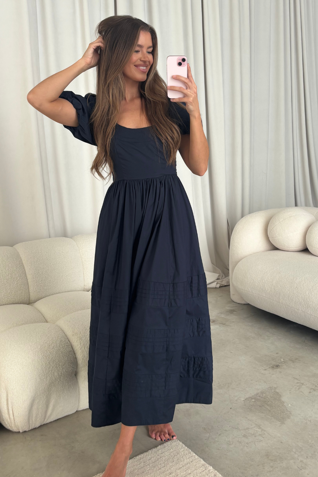 Tawny Long Smocked Cotton & Linen Midi Dress in Navy *Final-Sale*