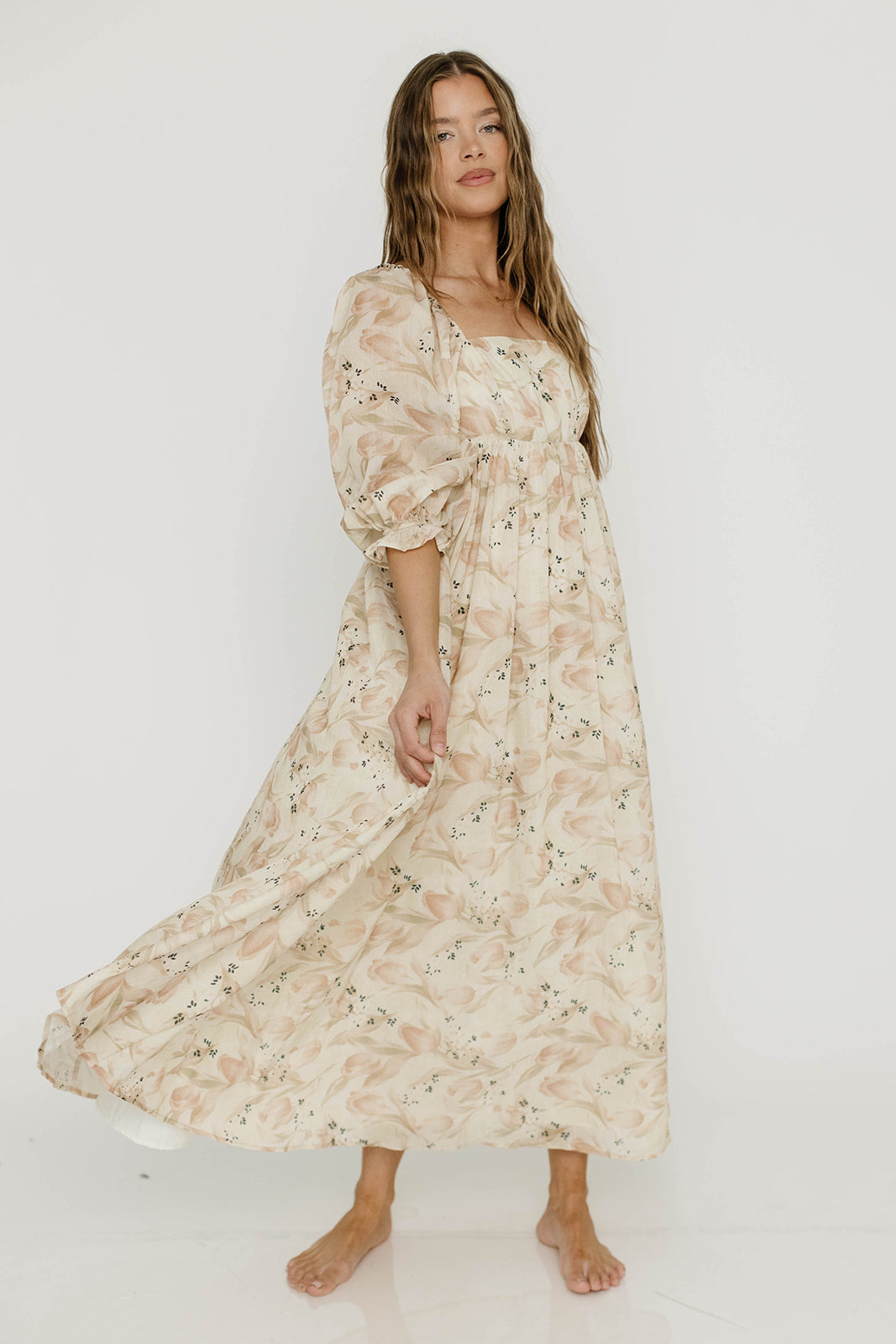 GARMENT DETAILS: Empire-waisted maxi dress in a creamy floral pattern. Square neckline, 3/4 gauze puffed sleeves, and bust darts. Lined.