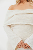 GARMENT DETAILS: Gorgeous chenille-like knit maxi dress with folded off-the-shoulder neckline, flared long sleeves, and a fit-and-flare skirt. Features a full lining (neck to hem) but still very lightweight.