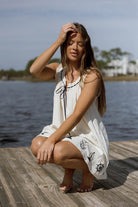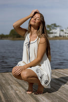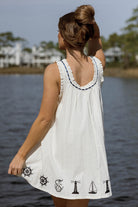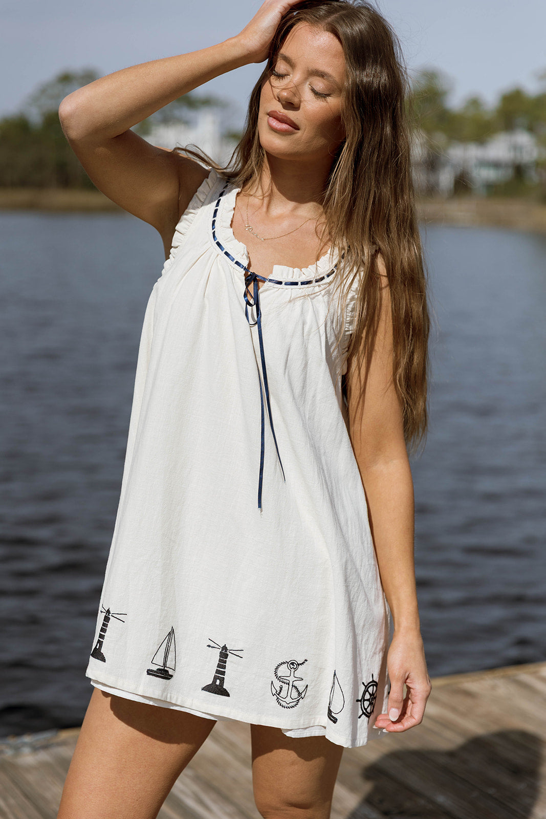 GARMENT DETAILS: Lightweight cotton-blend tank dress. Features a scooped neckline, nautical-themed embroidery, and adjustable front tie detail with ruffled accents. Lined.