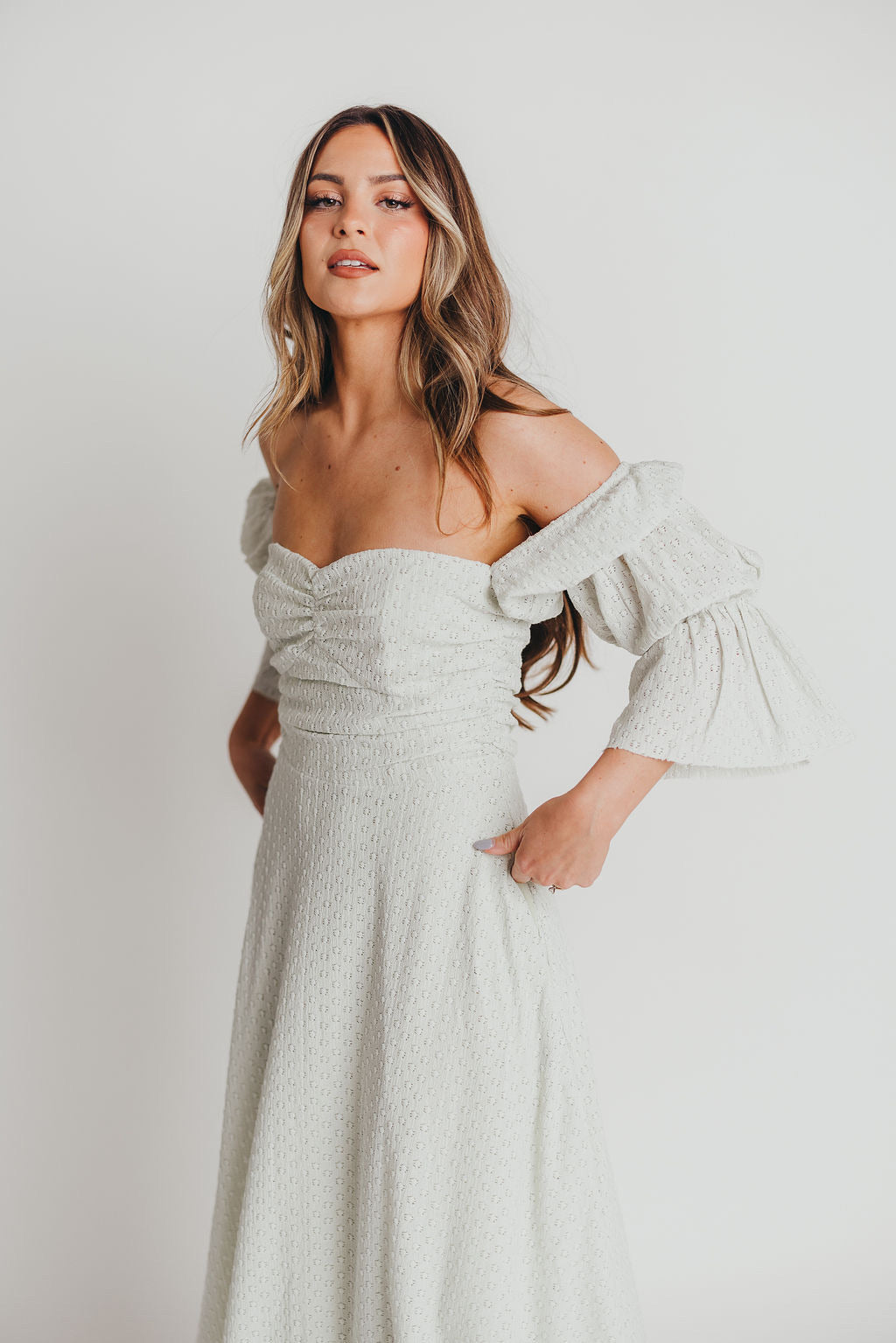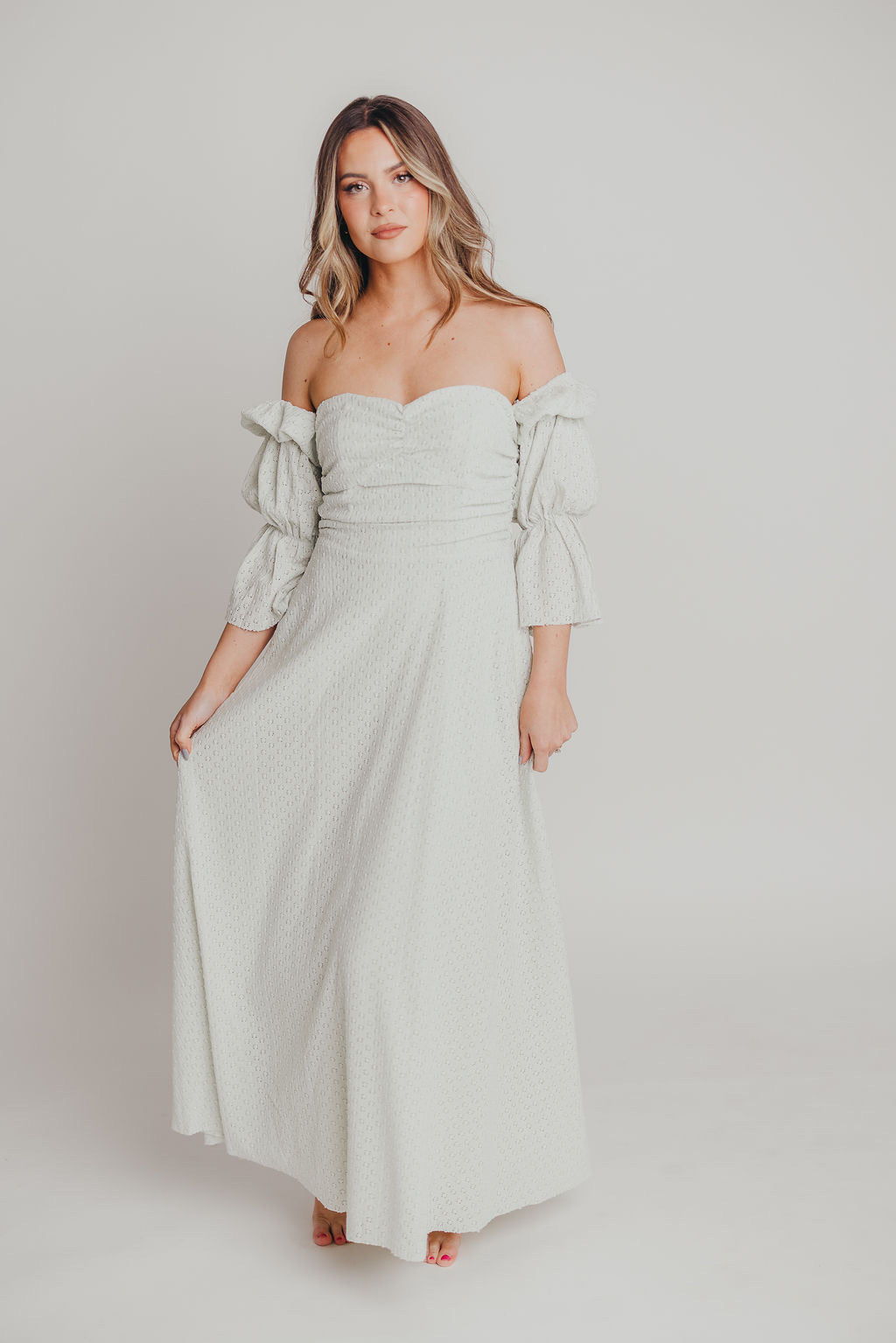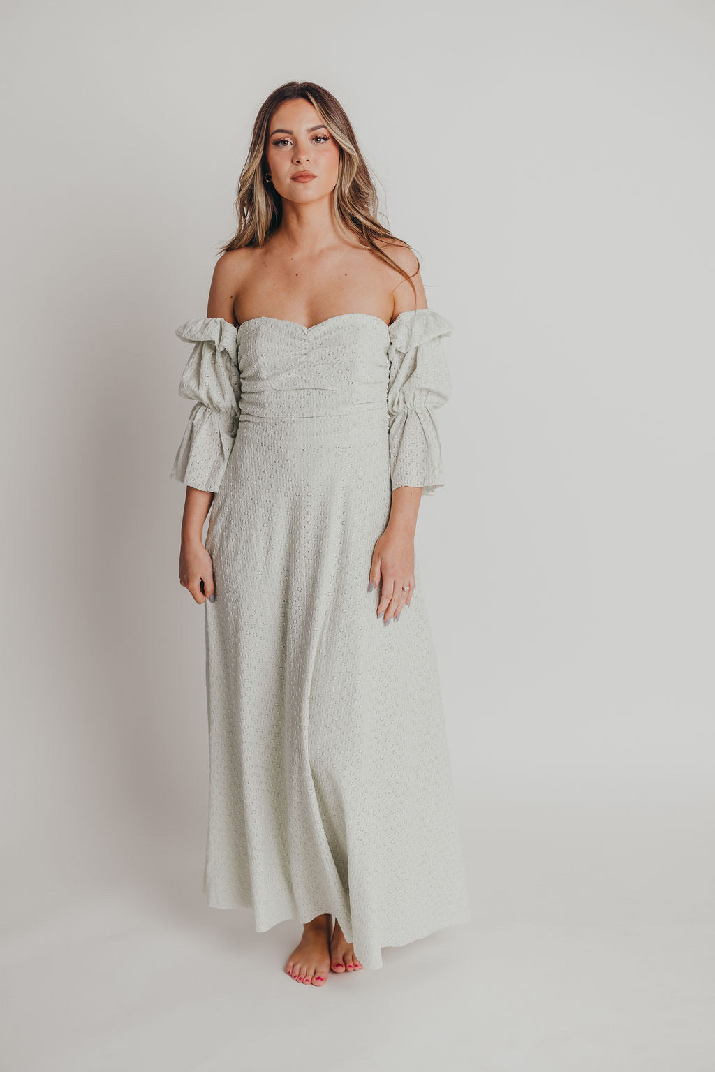 GARMENT DETAILS: Elegant maxi dress with ruched bodice and sweetheart neckline, with 3/4 length tiered Marie sleeves; neckline can be worn on or off the shoulder. Bodice features silicone tape. Features dual in-seam pockets and a textured, lightweight fabric. Lined.
