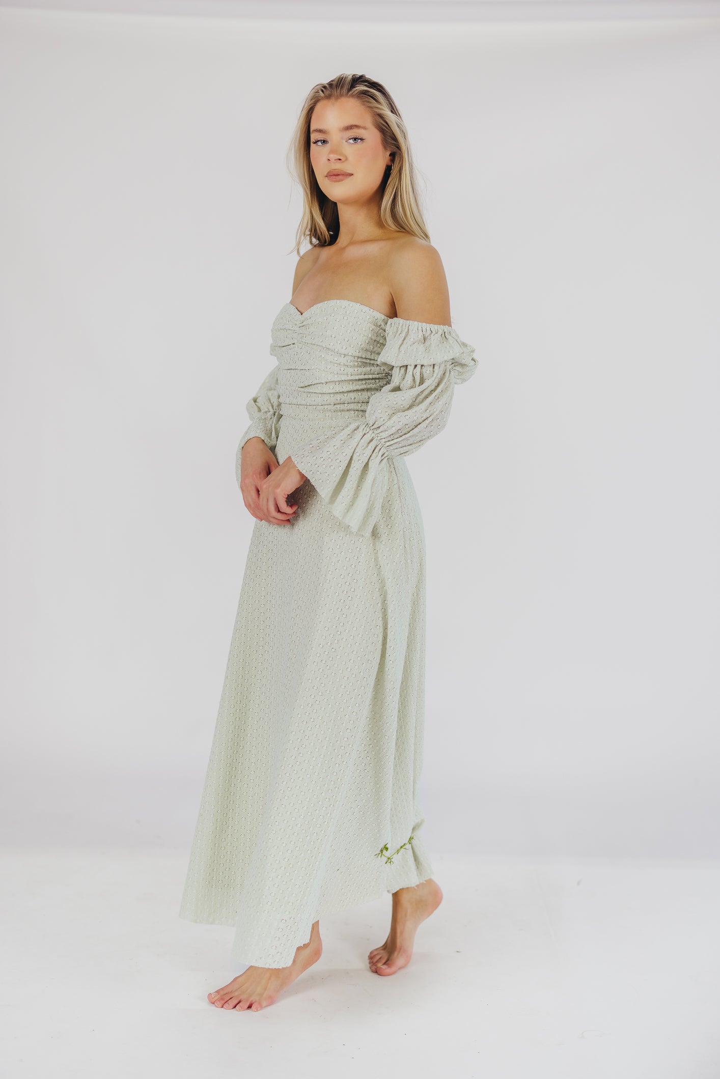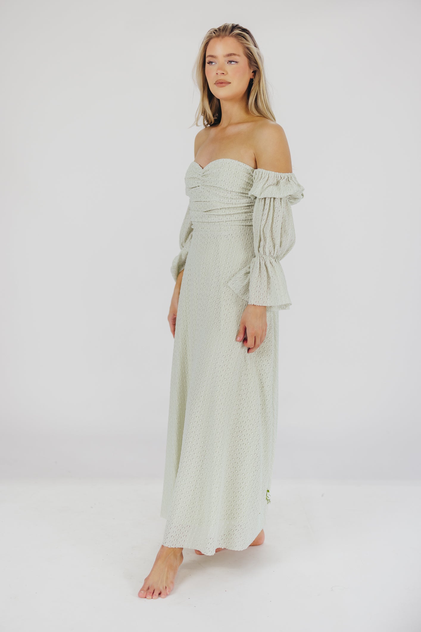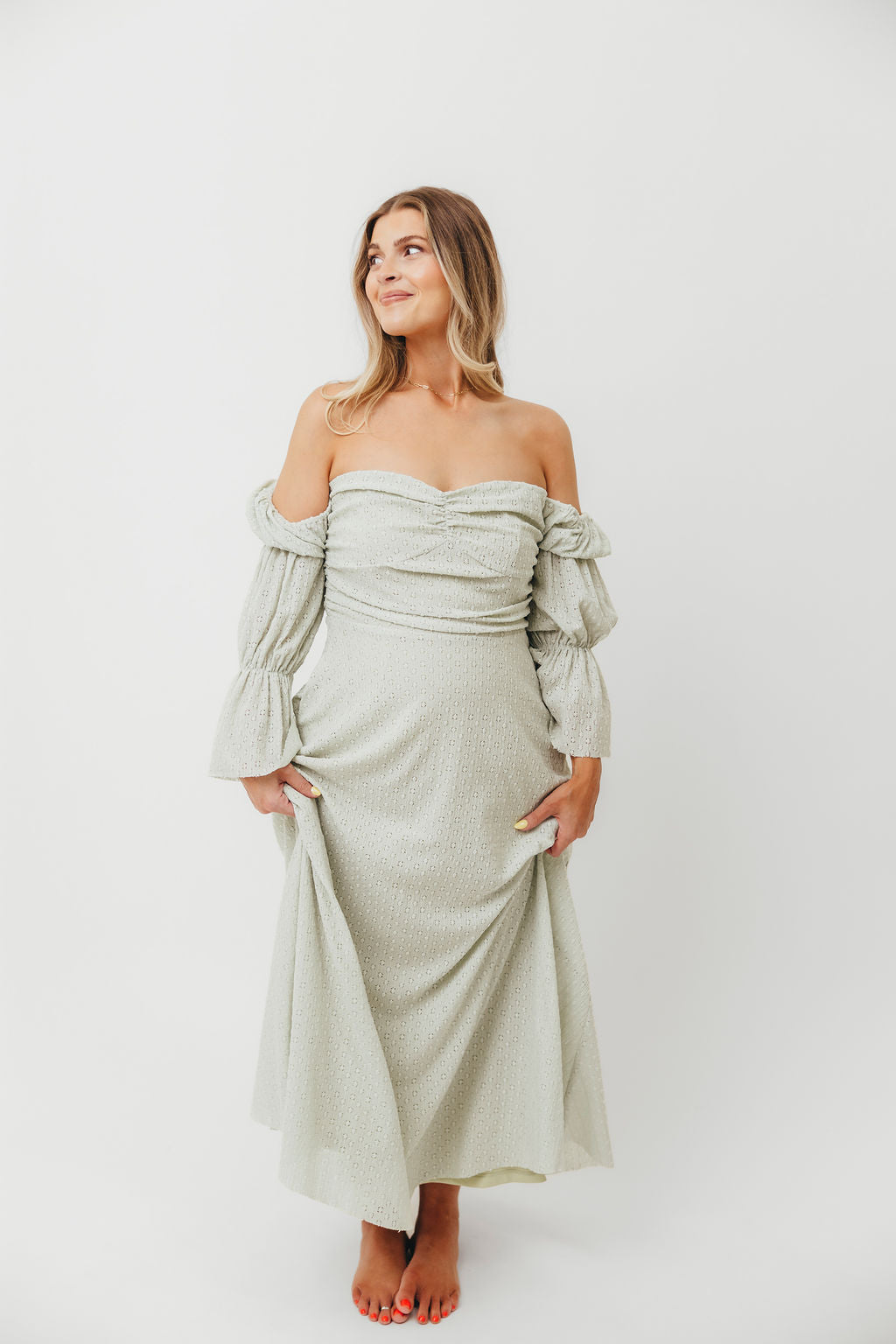 GARMENT DETAILS: Elegant maxi dress with ruched bodice and sweetheart neckline, with 3/4 length tiered Marie sleeves; neckline can be worn on or off the shoulder. Bodice features silicone tape. Features dual in-seam pockets and a textured, lightweight fabric. Lined.