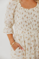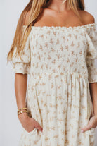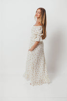 GARMENT DETAILS: Elegant, lightweight maxi dress in a darling floral print, with stretchy neckline that can be worn on or off the shoulder. Features 3/4 length puffed sleeves with ruffle, and a stretchy, smocked bodice. This colorway features a full lining.