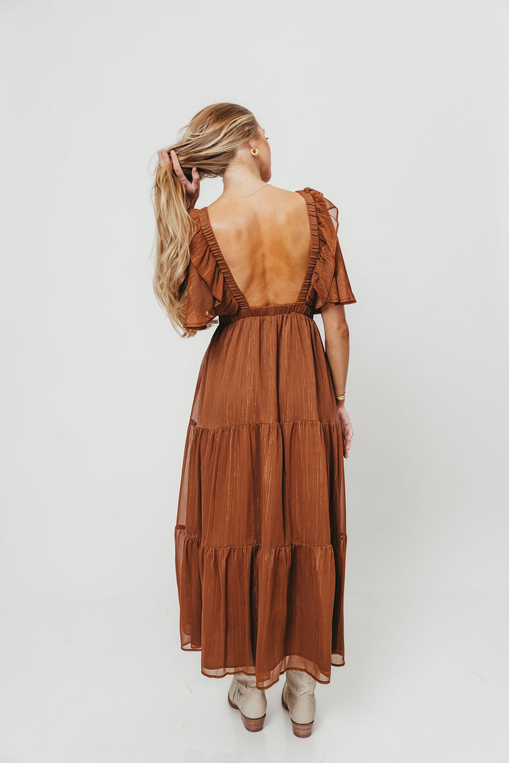 GARMENT DETAILS: Elegant maxi dress with a bold, elasticated V-neckline, sheer flutter sleeves, and a cinched waist with sweet bowtie detail. Features a multi-tiered skirt and lining.