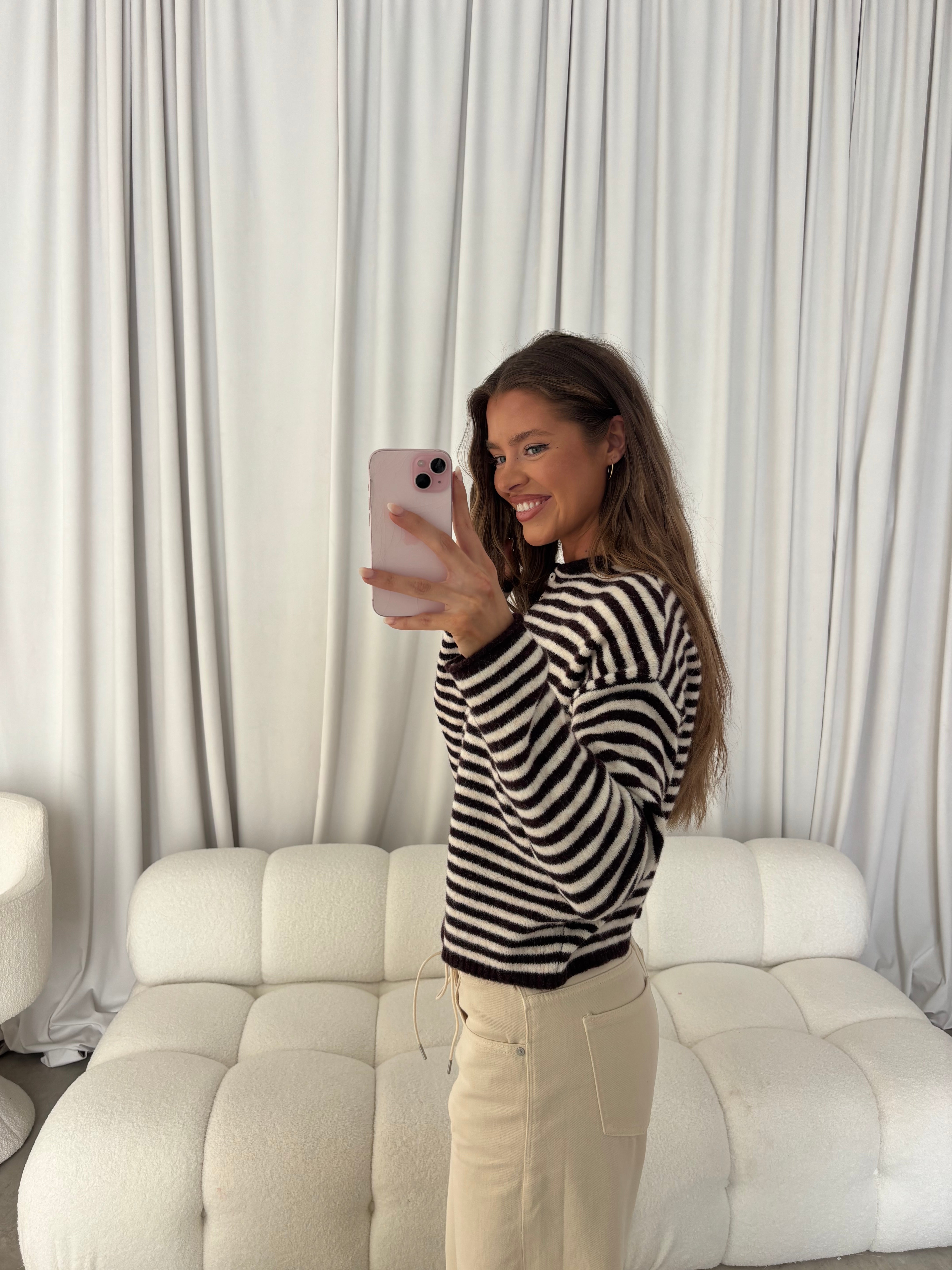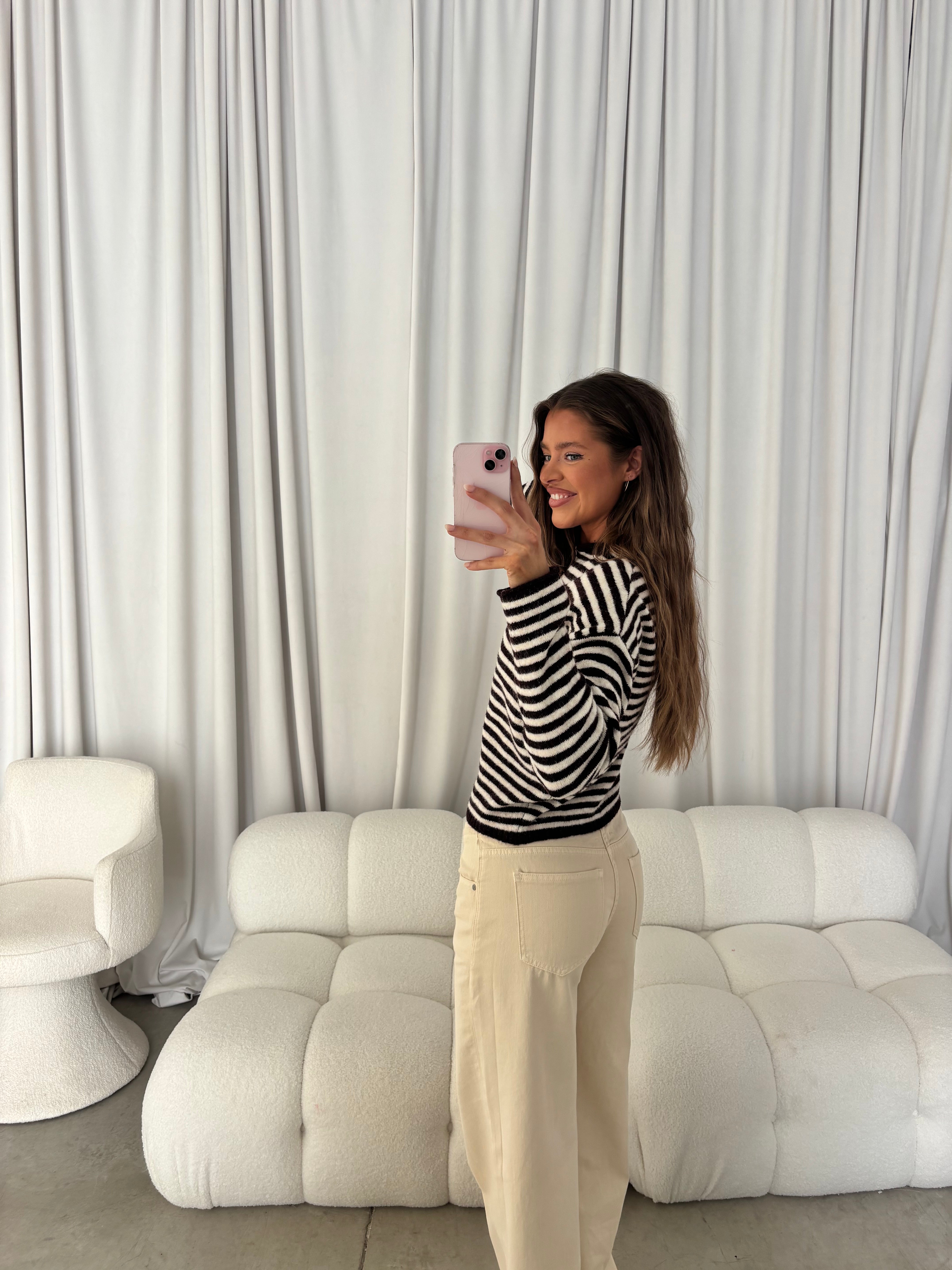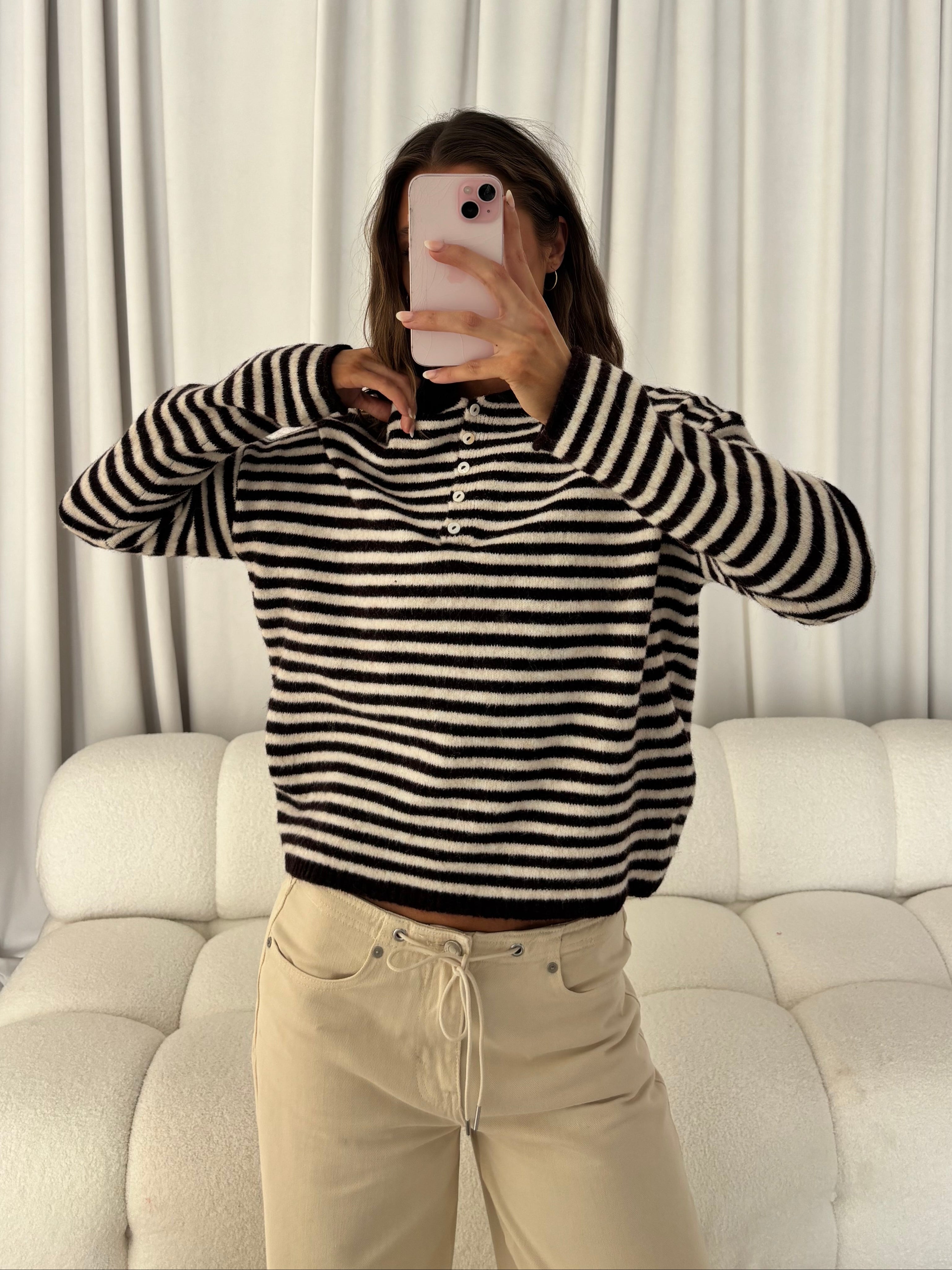 GARMENT DETAILS: Buttery soft knit sweater in a classic striped pattern with contrast color trim. Features a crewneck, dropped shoulders, and 1/4 front placket with functional buttons.