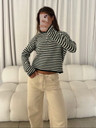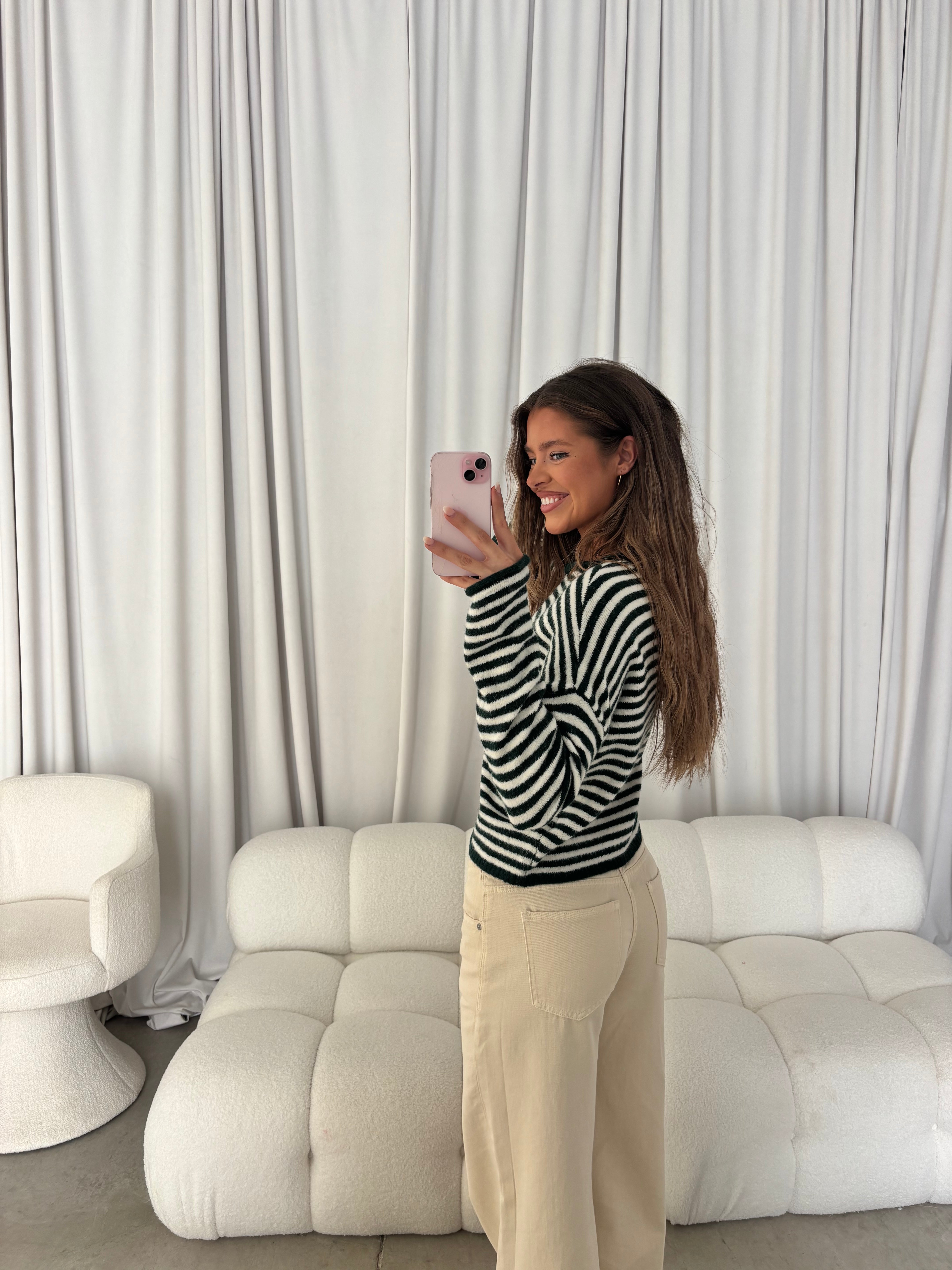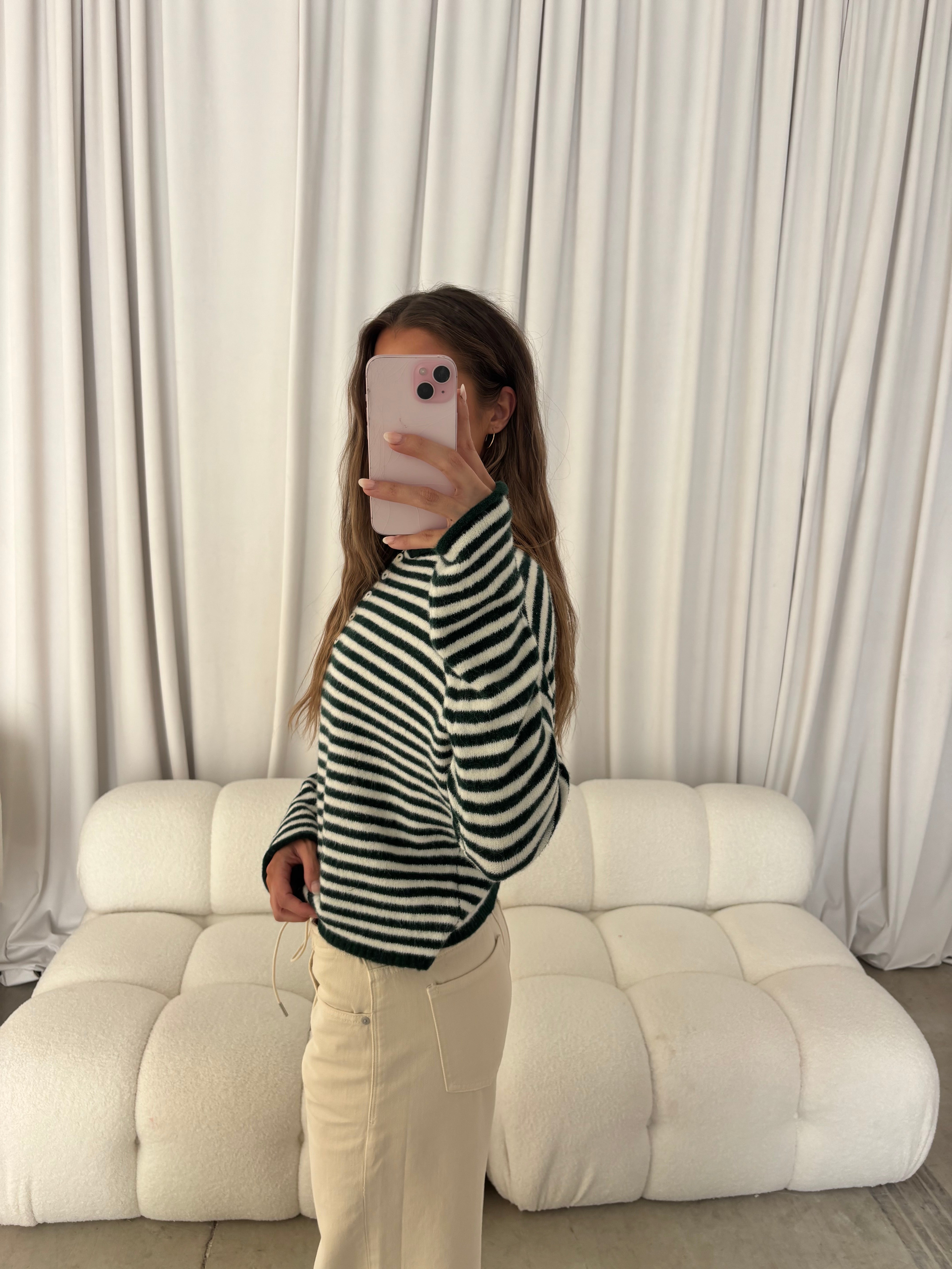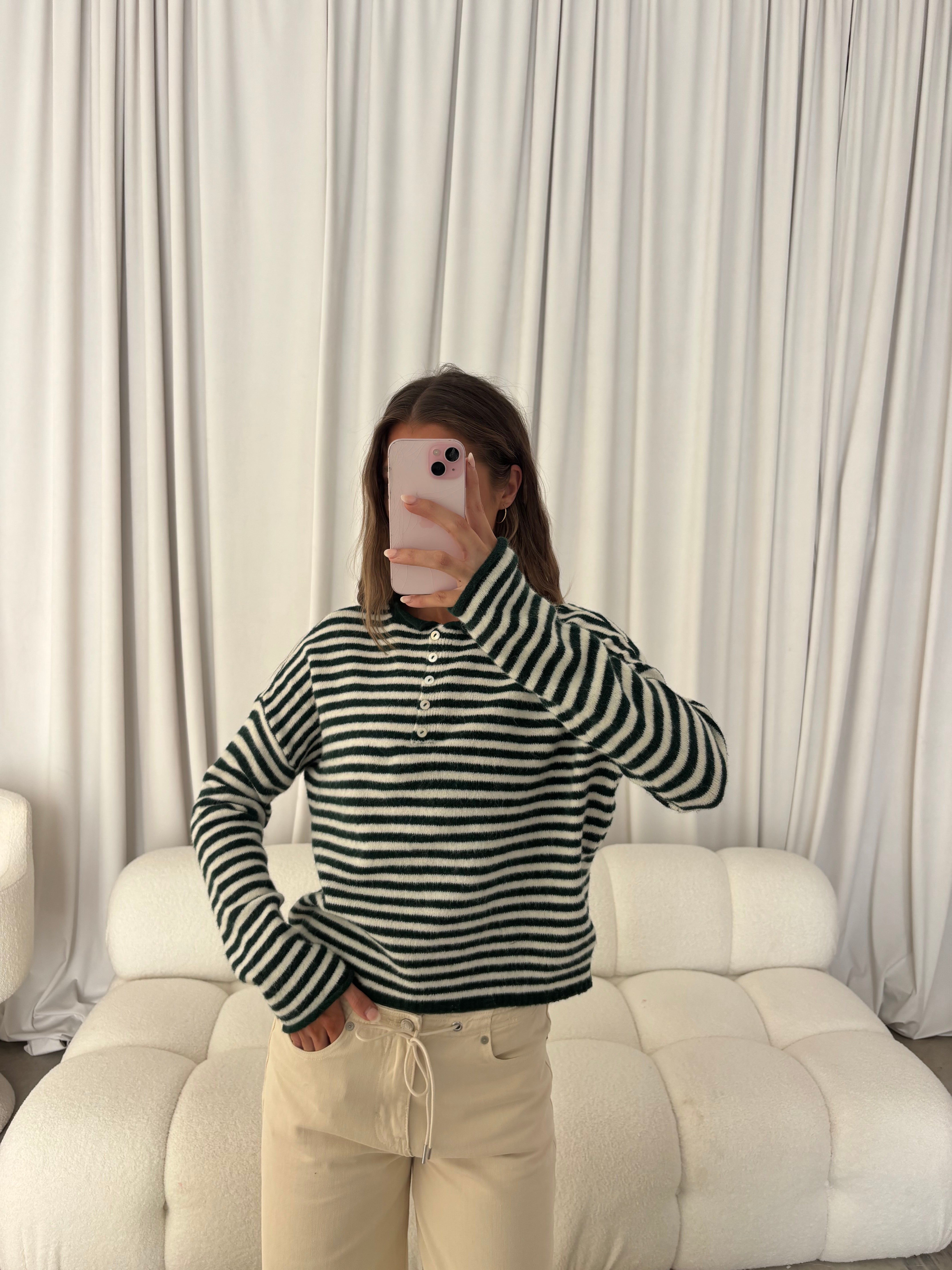 Hattie Striped Henley Pullover Sweater in Forest Green