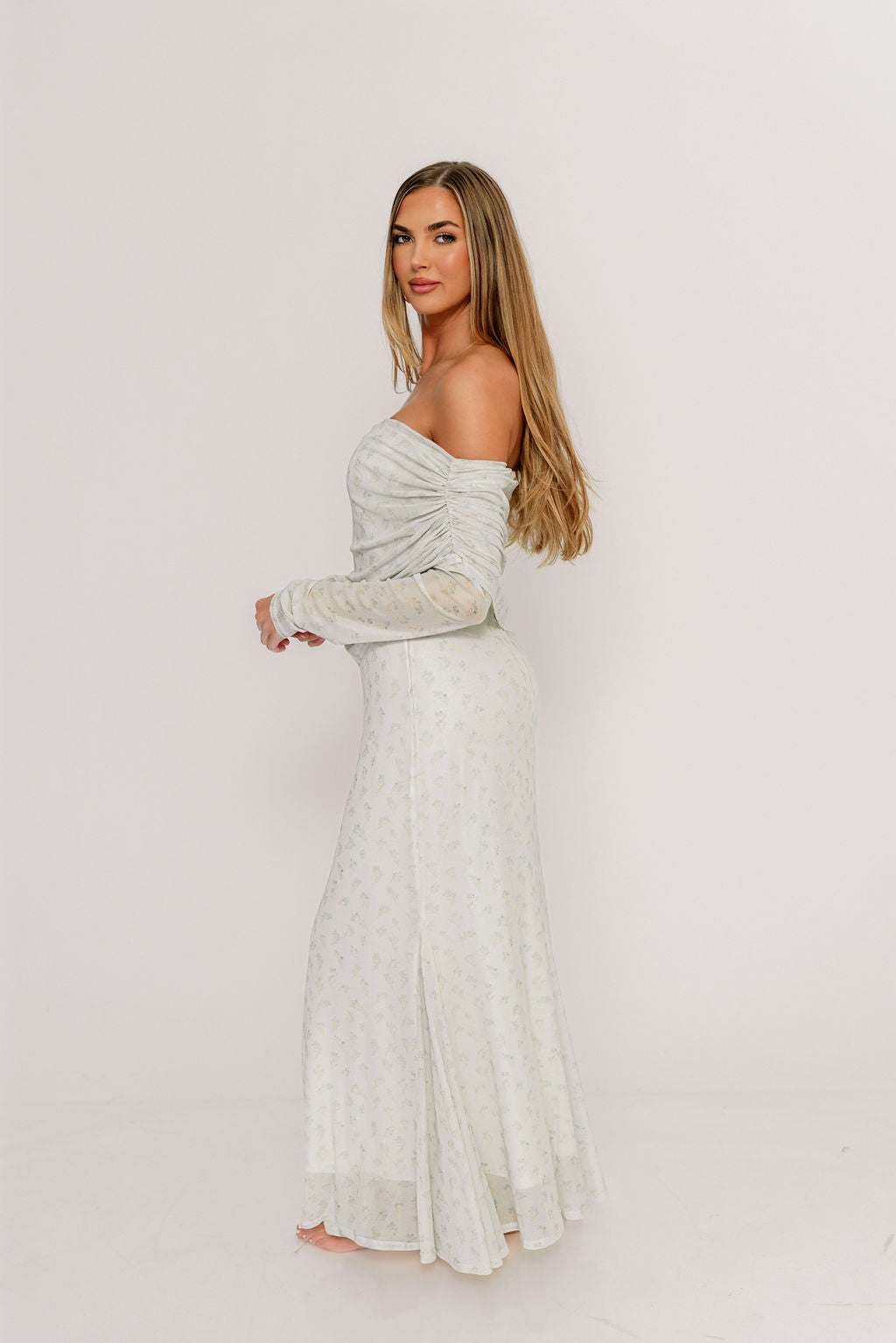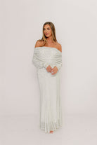 Here's a glam gown for your next red carpet moment! The Azaleia Maxi Dress flatters your curves and shows off your shoulders, with a ruched bodice and silky long sleeves that add elegance to any occasion.