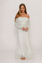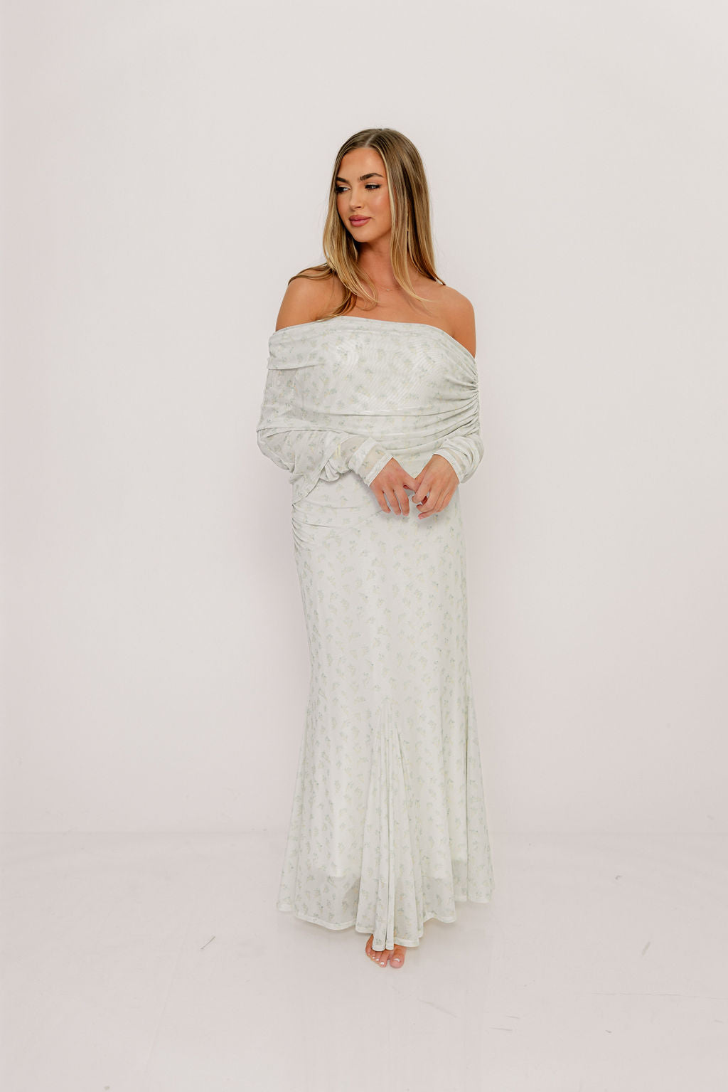 GARMENT DETAILS: Elegant maxi dress with off-the-shoulder neckline, long sheer sleeves, and a flounced maxi skirt. Features full lining and a fit-and-flare silhouette.