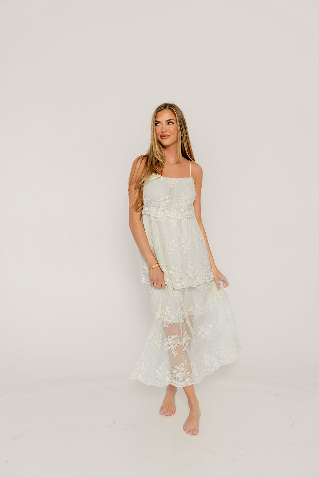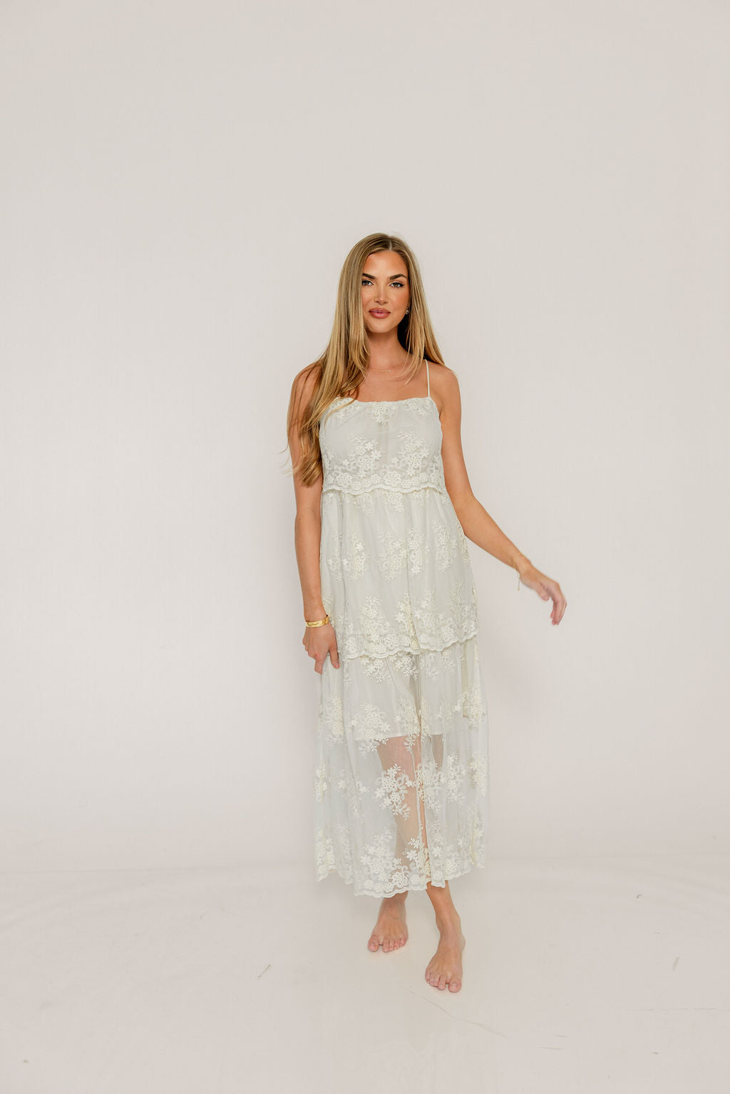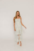 Meet the new Kiara Midi Dress, a dreamy and ethereal gown that will twirl you through the evening! This gorgeous gown features dainty floral lace embroidered onto a sheer mesh overlay for a truly romantic effect; it's perfect for bridal showers, spring events, or any elevated occasion.