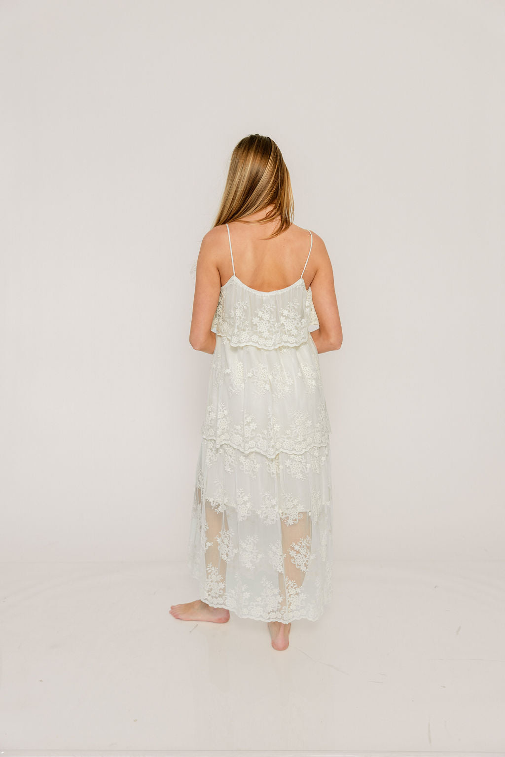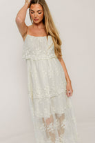 GARMENT DETAILS: Ethereal midi with floral lace embroidered on a sheer lace overly dress. Features a relaxed, A-line silhouette, non-adjustable shoulder straps, and a built-in mini-length lining. No zipper or button closures.