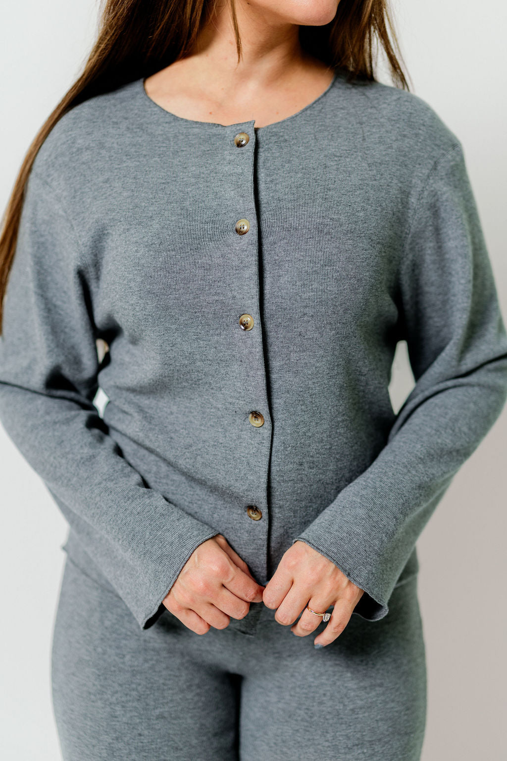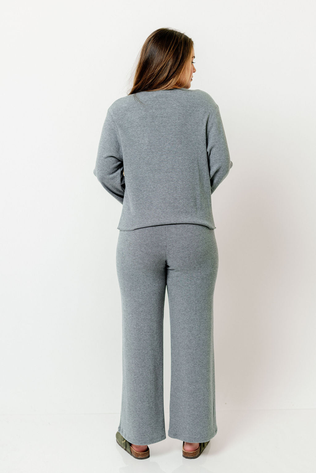 GARMENT DETAILS: Cozy knit top and pants set. Top features a rounded neckline, comfortable fit, and charming front button placket. Pants feature an elasticated waistband, full length, and wide-leg design.