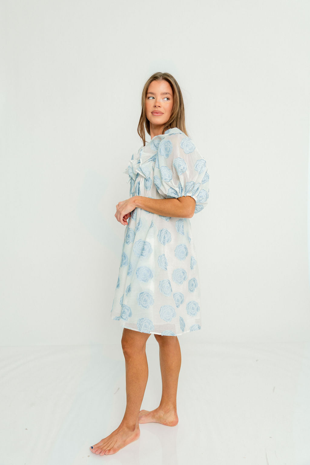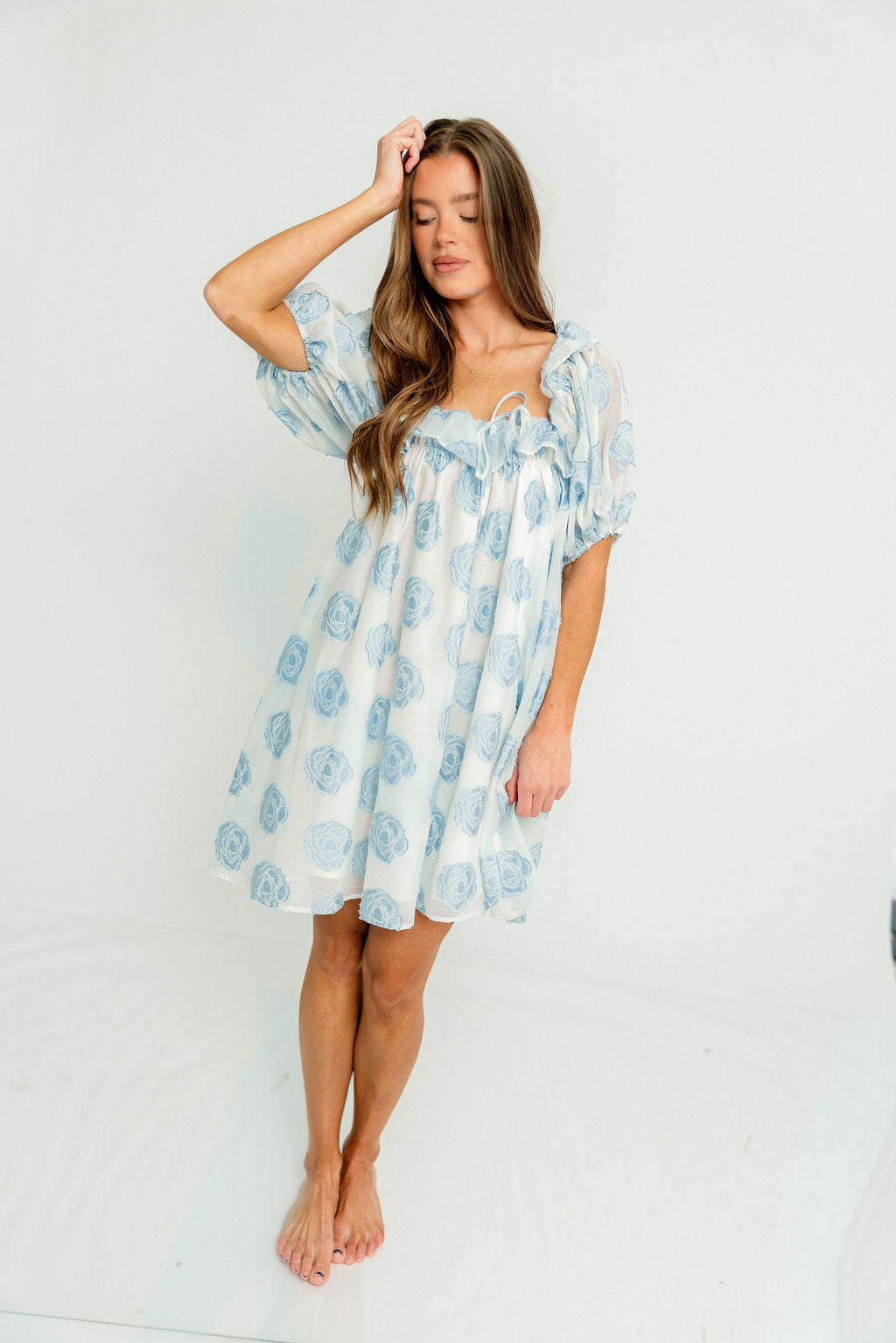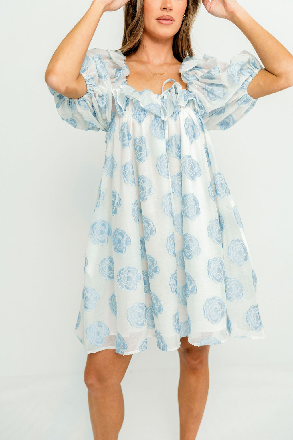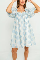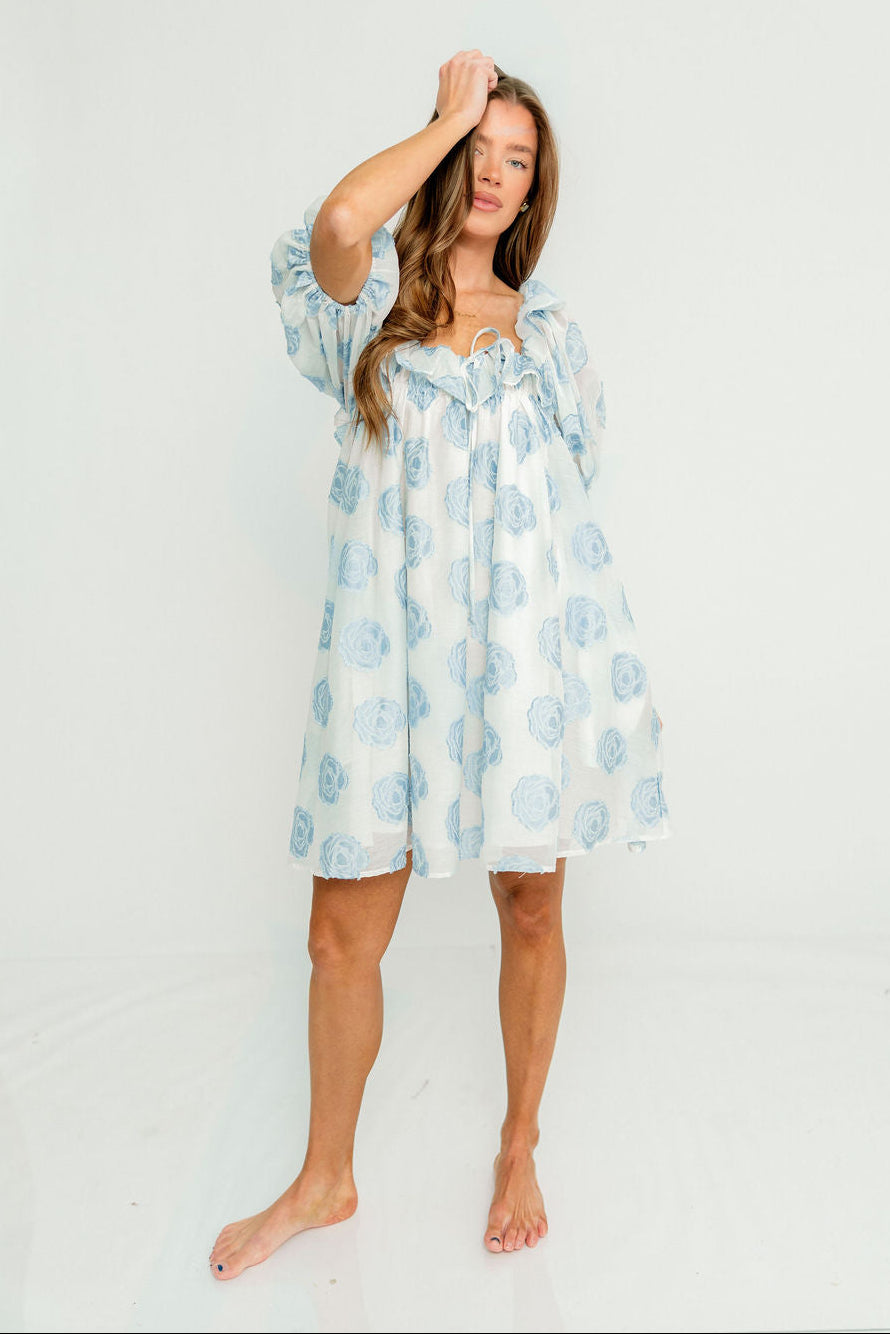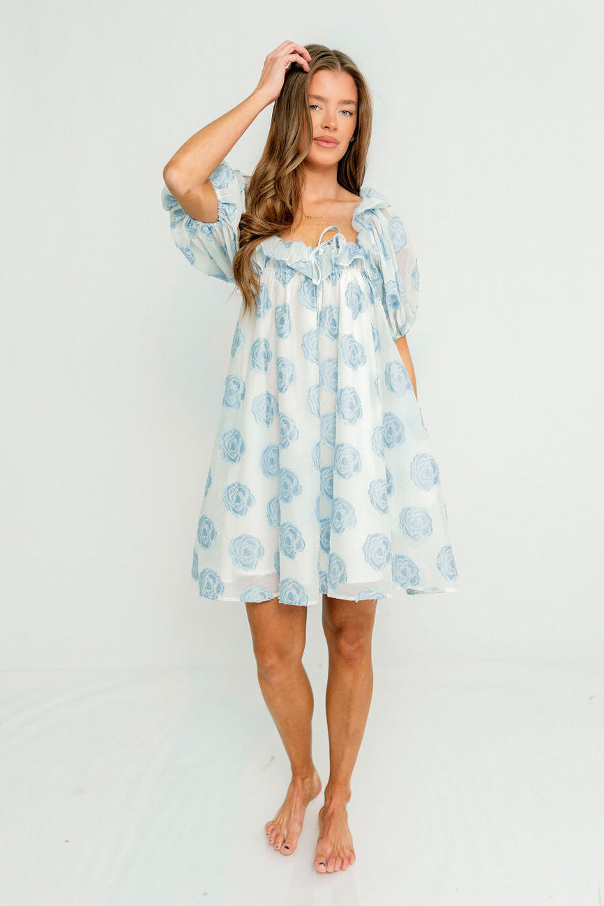 GARMENT DETAILS: Elegant, lightweight mini dress with a flattering swing-style silhouette. Features a textured floral pattern, ruffled neckline with self-tie detail, and puffed short sleeves. Fully lined.