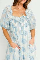 The Edith Mini Dress is a perfect work of art, ready for you to show it off at your next special event! This elegant dress features a textured floral pattern, with a romantic ruffled neckline and tie-front detail. It's a unique and feminine choice for weddings, showers, and other big days!
