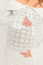 GARMENT DETAILS: Ultra-feminine maxi dress with sheer lace overlay, with strapless, folded neckline, long flared sleeves, and delicate front tie detail. Features back zip and split skirt. Lined.