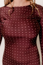 GARMENT DETAILS: Elegant polka-dot print maxi dress with high boatneck, long sleeves, and a flattering fit, with flared skirt.