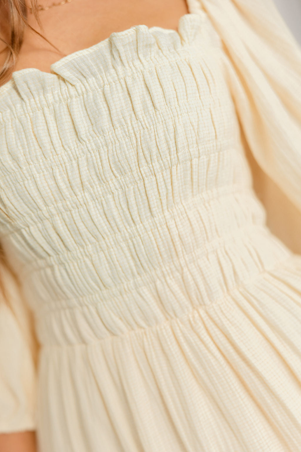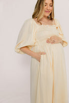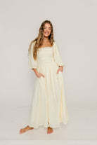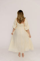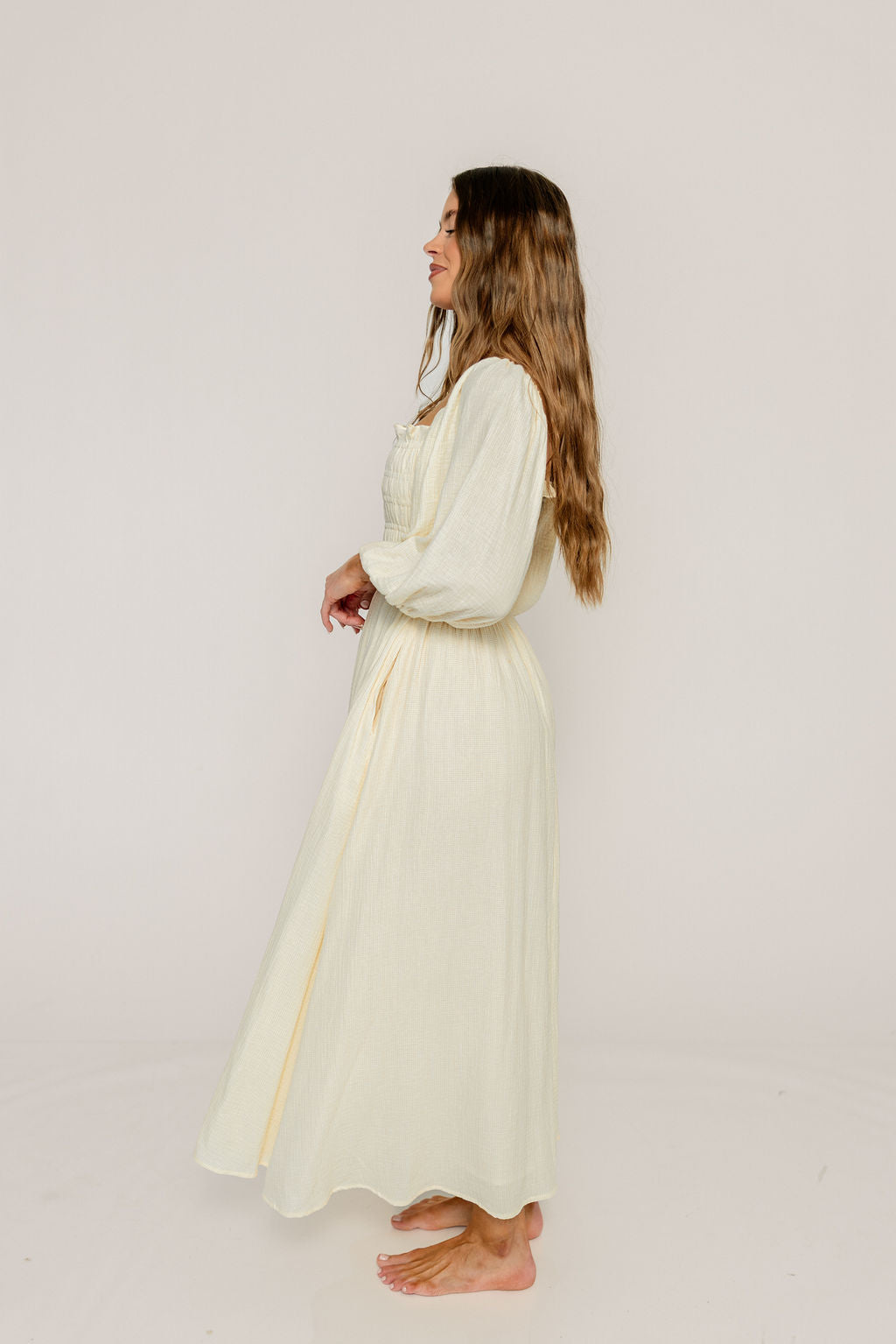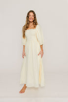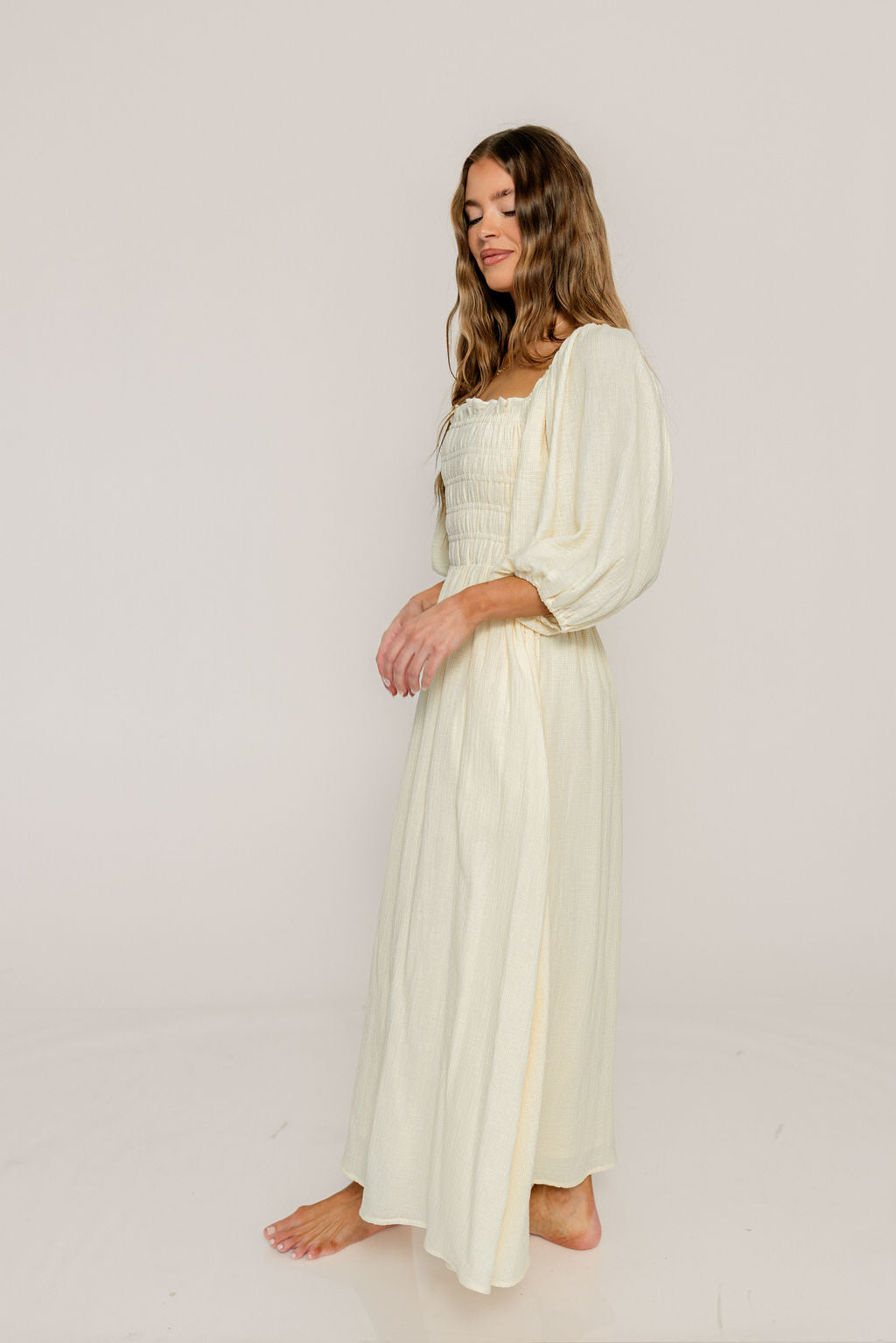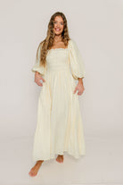 GARMENT DETAILS: Elegant cotton maxi dress in a charming neutral pattern, with square neckline, statement puffed sleeves, and a fully smocked bodice. Features ruffled details and dual side pockets.