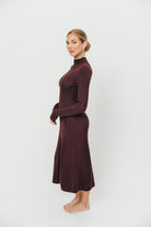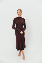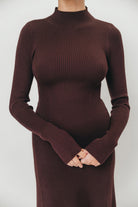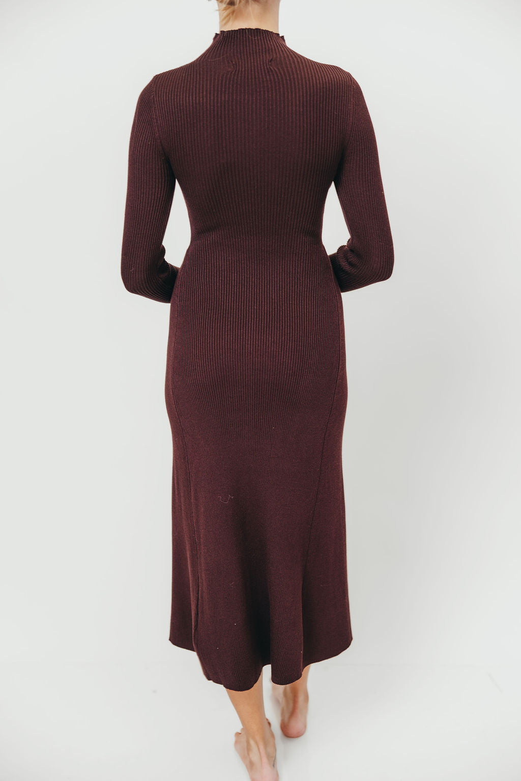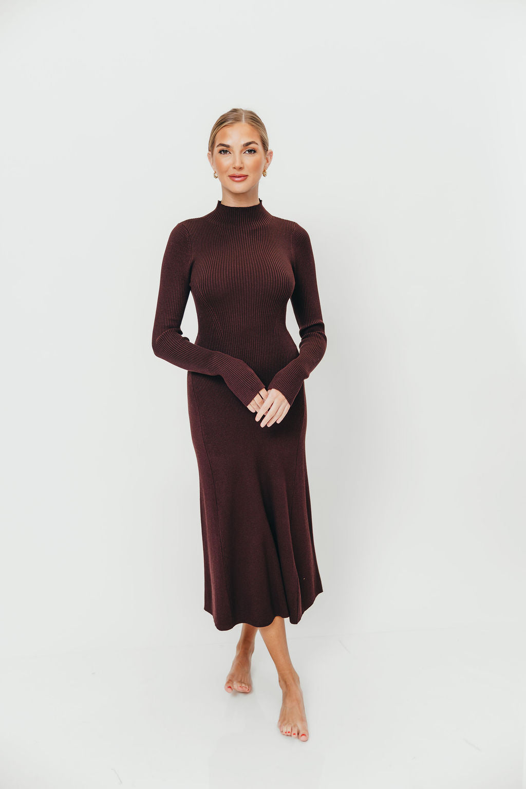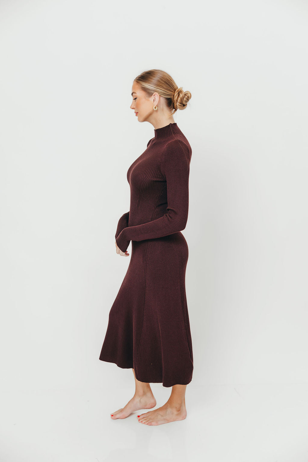 Hope Mock Neck Long Sleeve Rib Knit Flared Midi Dress in Dark Chocolate