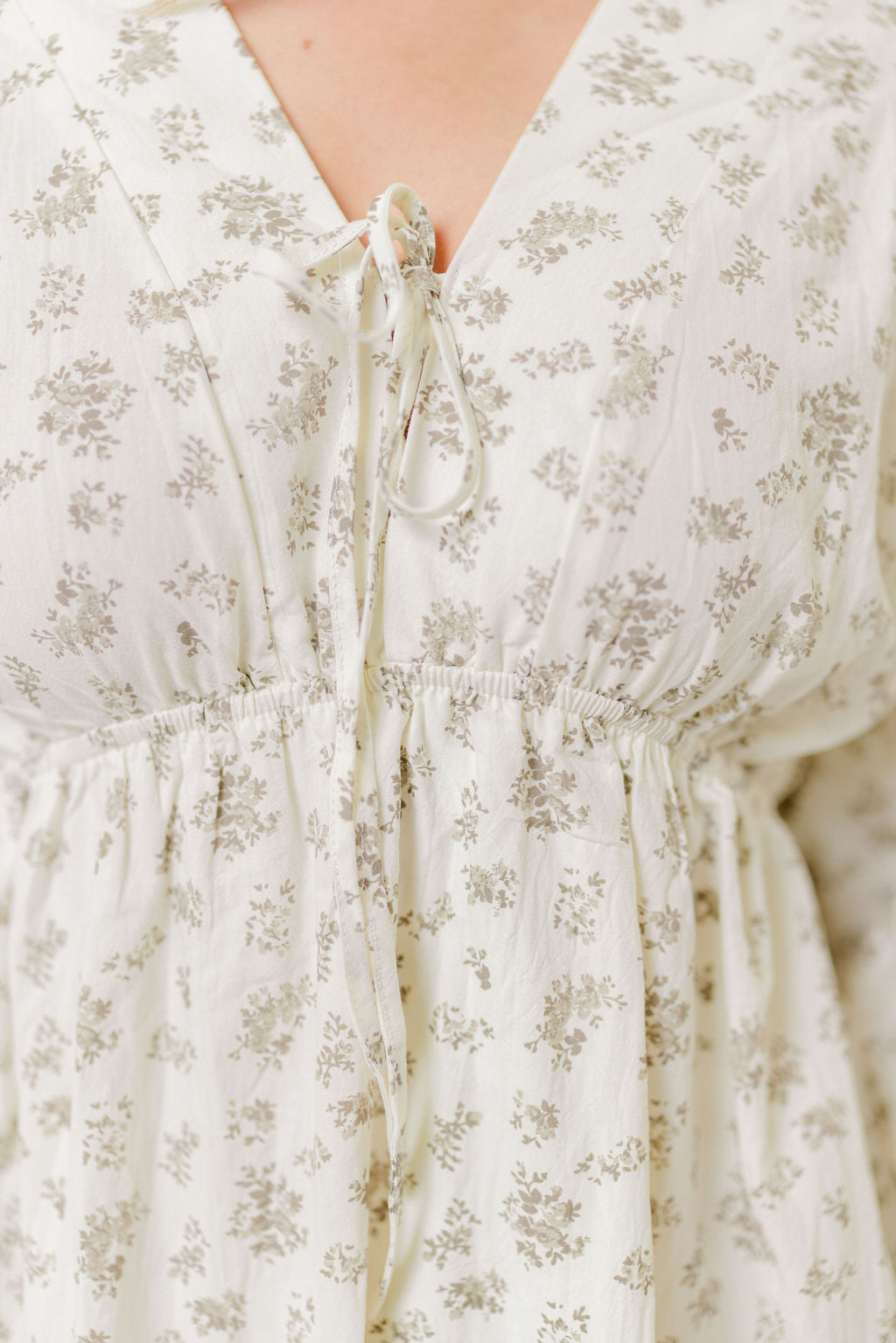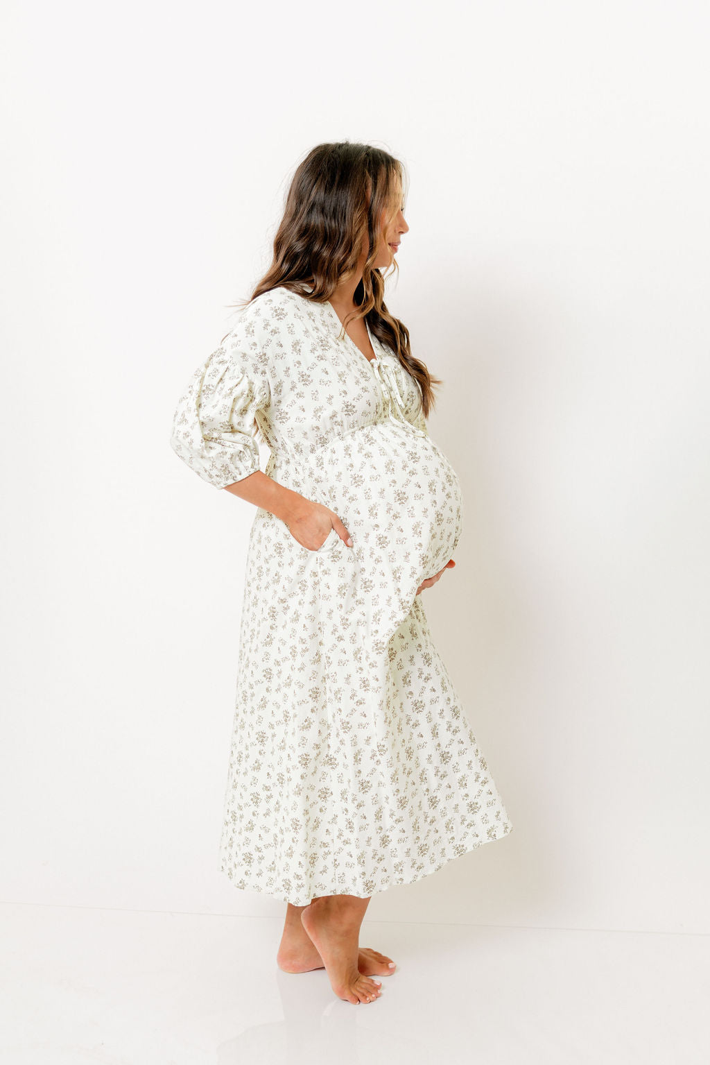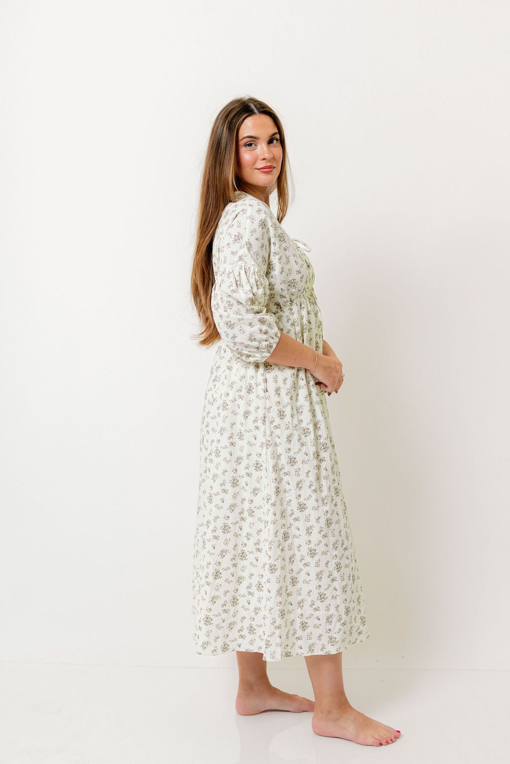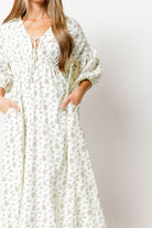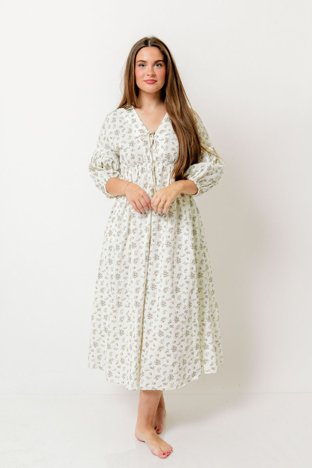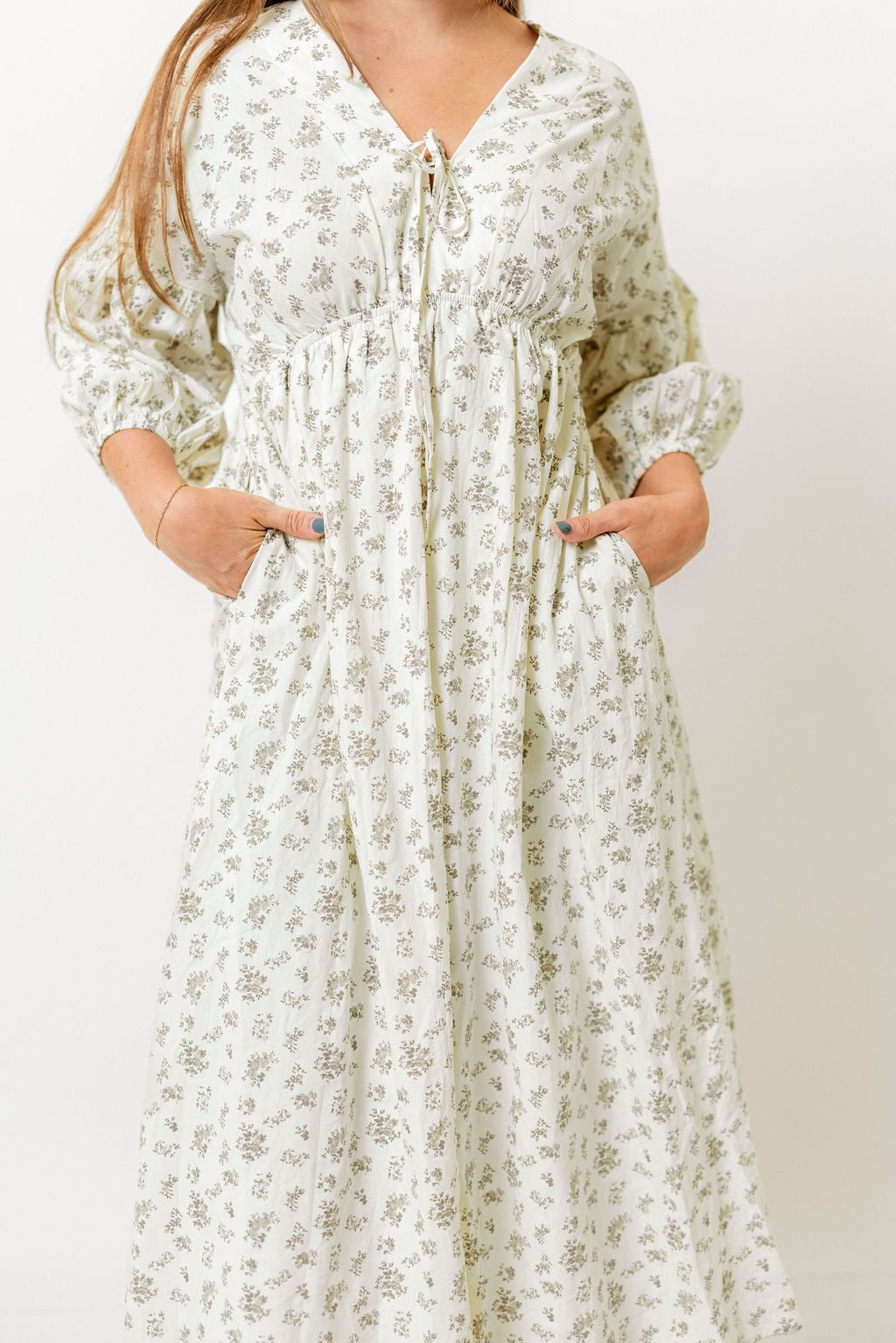 GARMENT DETAILS: Lightweight cotton maxi dress. Features V-neckline with self-tie detail, inverted empire waist, and full skirt with in-seam pockets. Finished with long balloon sleeves.