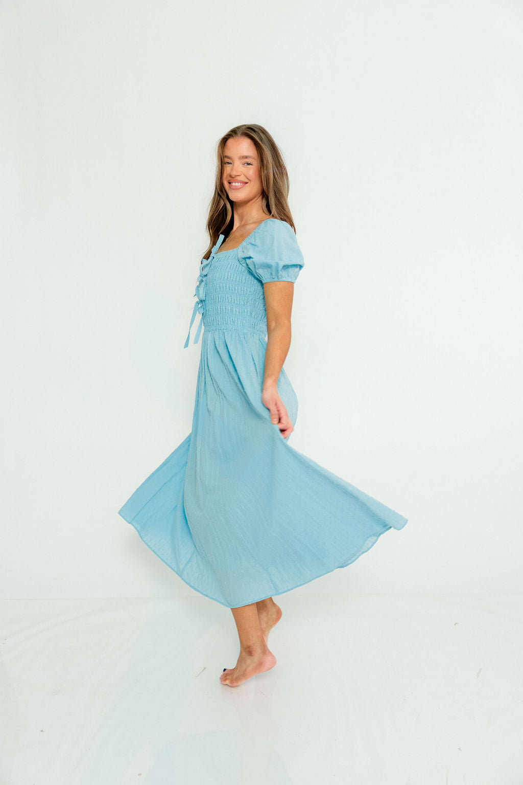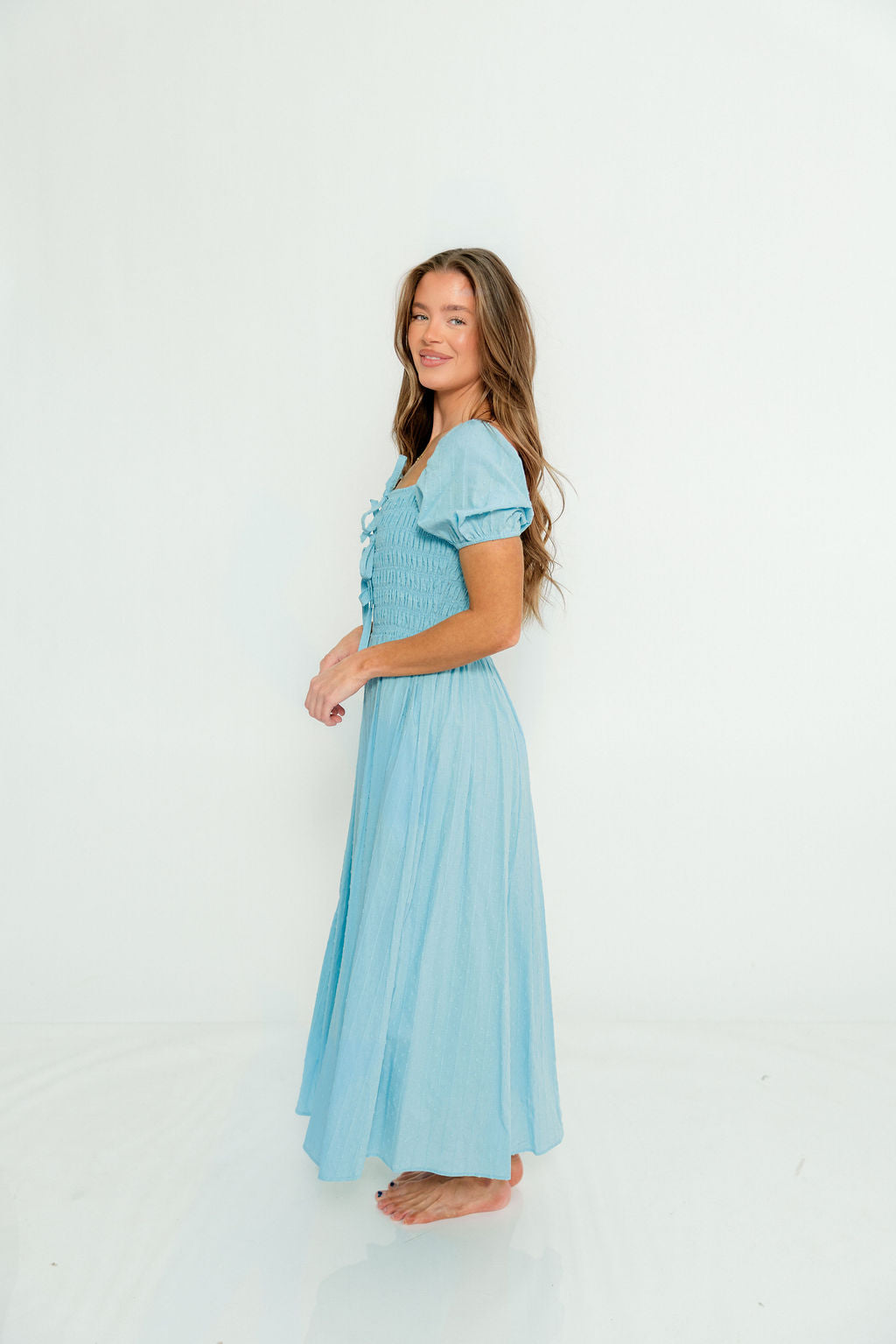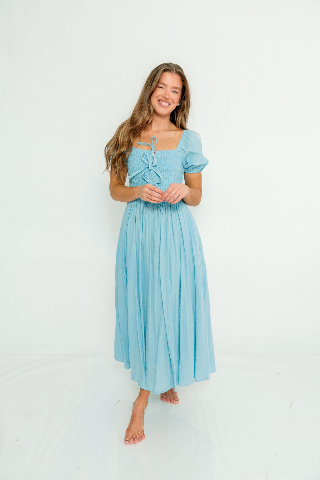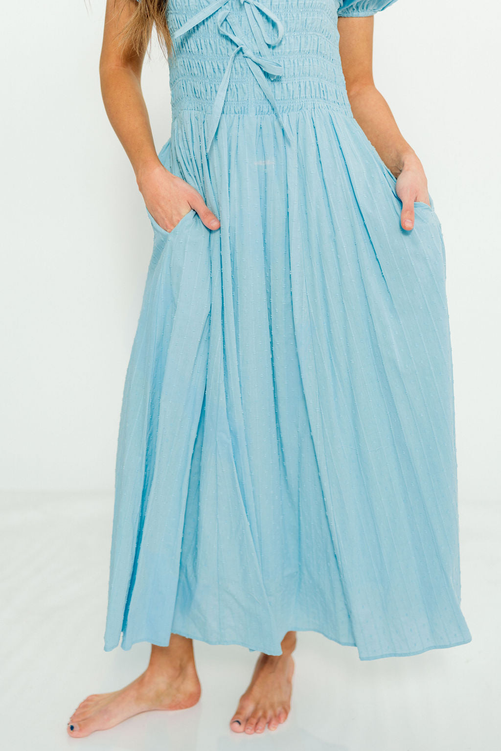GARMENT DETAILS: Premium cotton maxi dress with smocked bodice, square neckline, and short puffed sleeves. Features three bow details on the bodice, with an extra-wide, flowy skirt and dual side pockets. Fully lined.