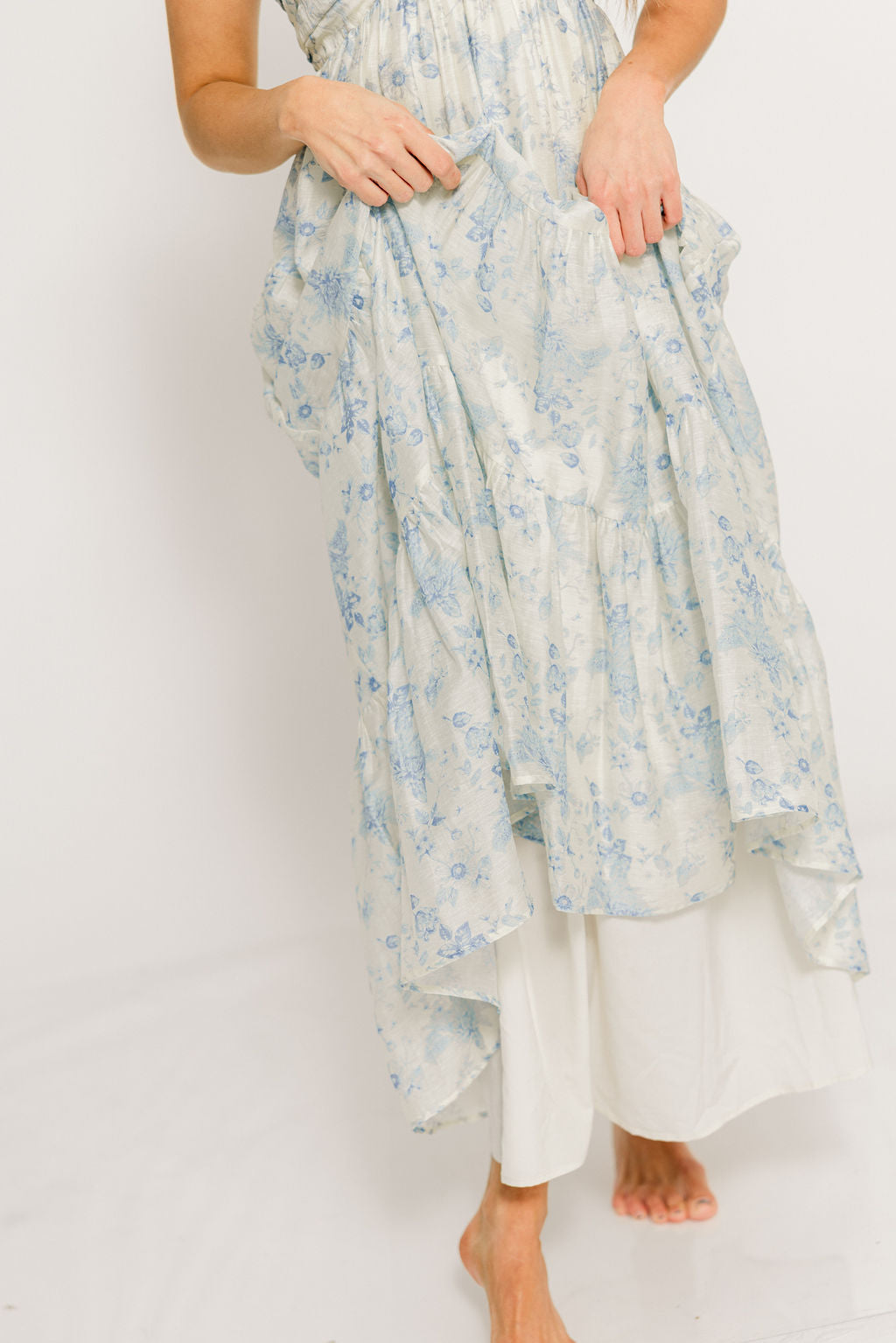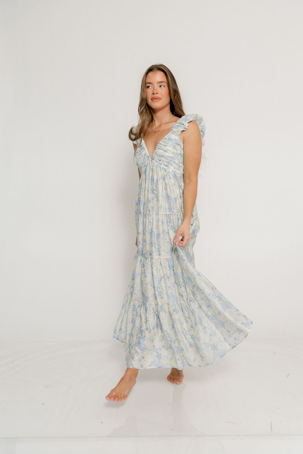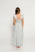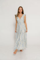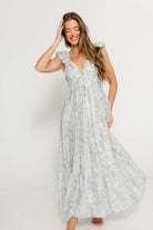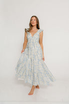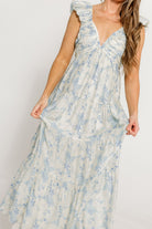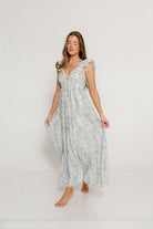 Katy Pleated Bodice Maxi Dress in Blue Floral