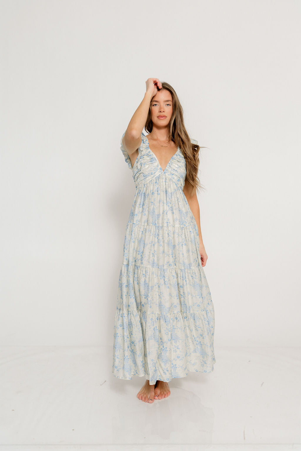 GARMENT DETAILS: Sleeveless, lightweight dress in a maxi length. Features a plunging V-neckline, with ruffled cap sleeves, pleated bodice, and stretchy, smocked back panel. Dress is constructed with an inverted empire waist, with a full, multi-tiered skirt. Partially lined.